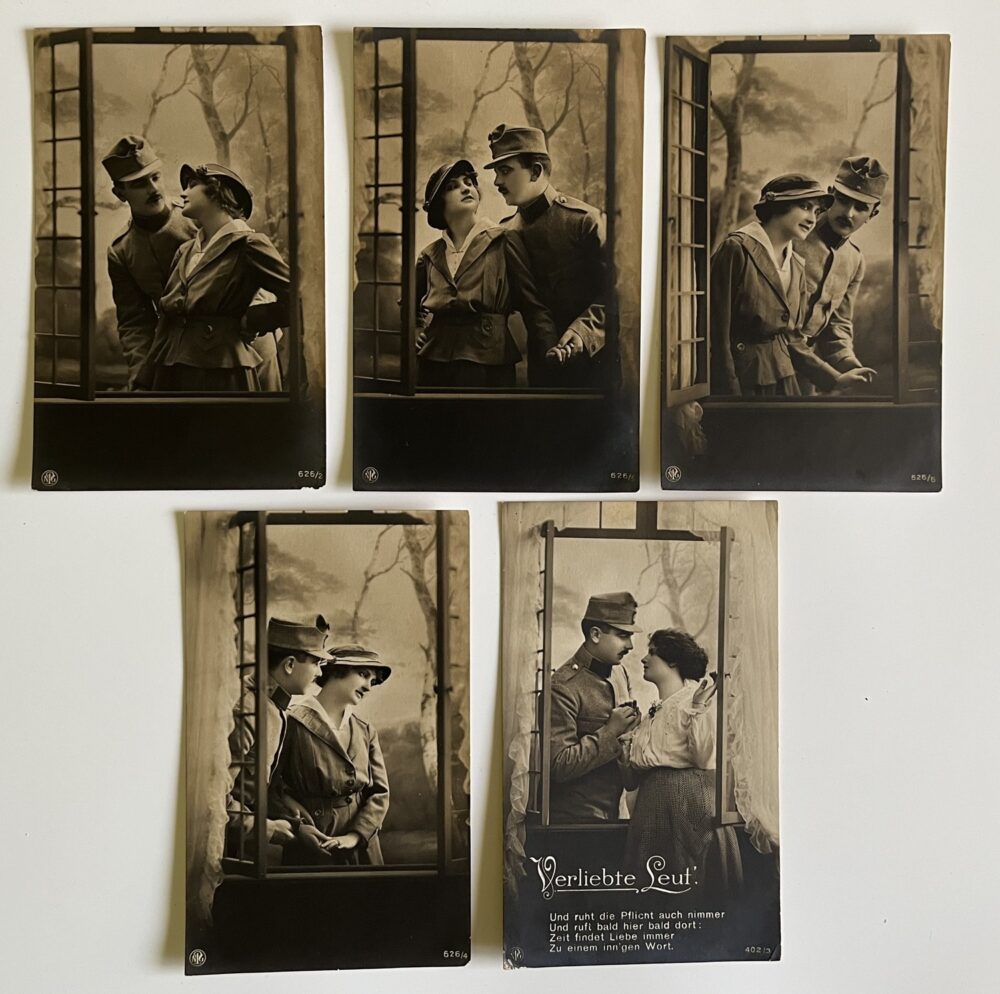 Vojenská pohlednice RU, WW1 Pár – voják s dívkou, série 5 ks