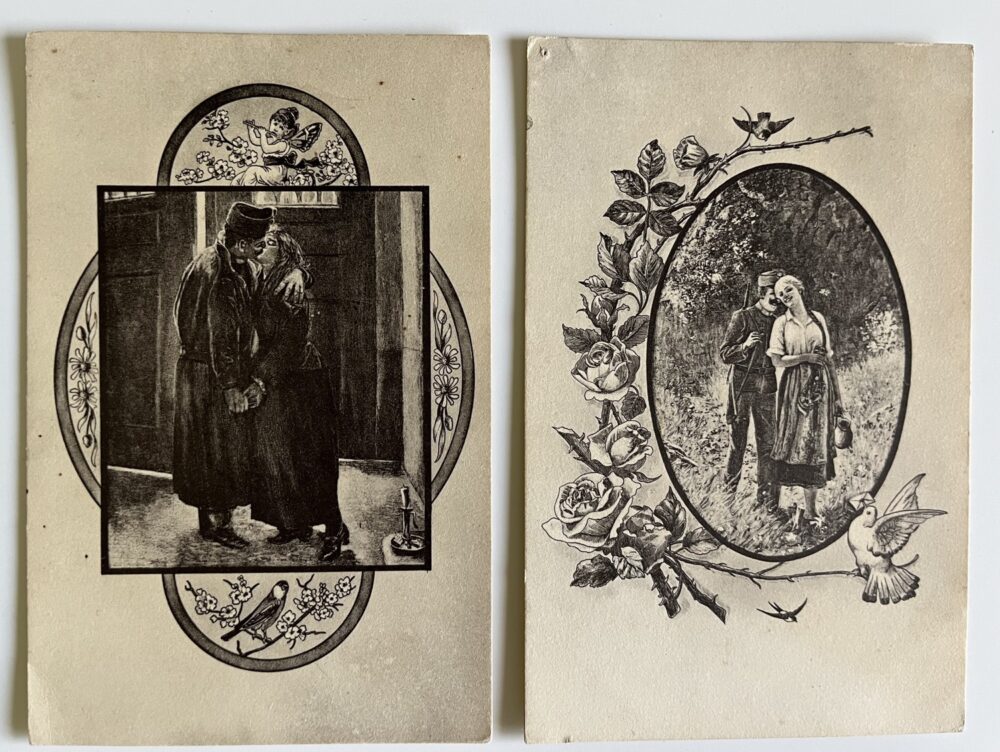 SoldVojenská pohlednice RU, WW1Voják s dívkou, set 2 ks