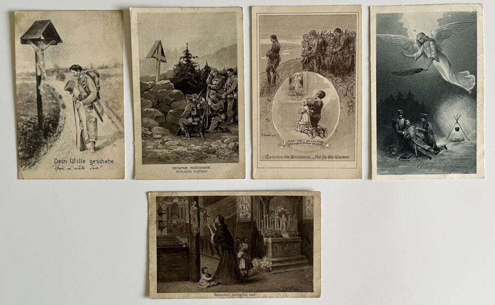 Vojenská pohlednice WW1 Vojáci na frontě, modlící se dítě série 10 ks