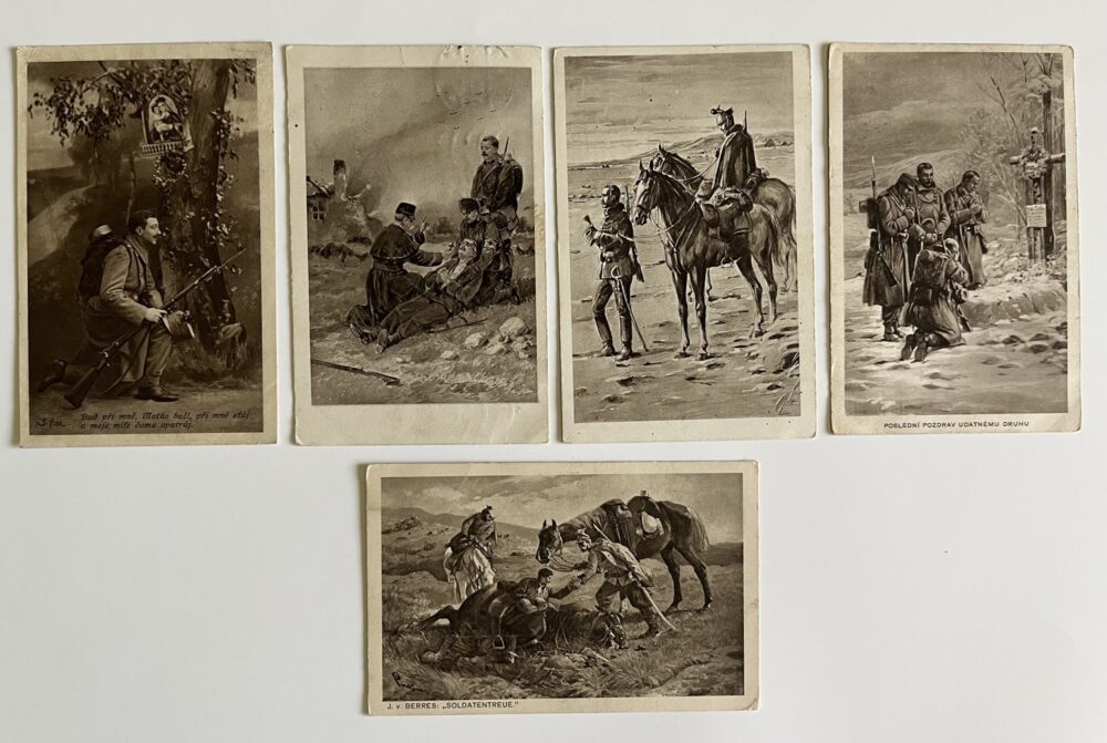 SoldVojenská pohlednice RU, WW1 Návrat – Modlitba – Loučení, set 4 ks