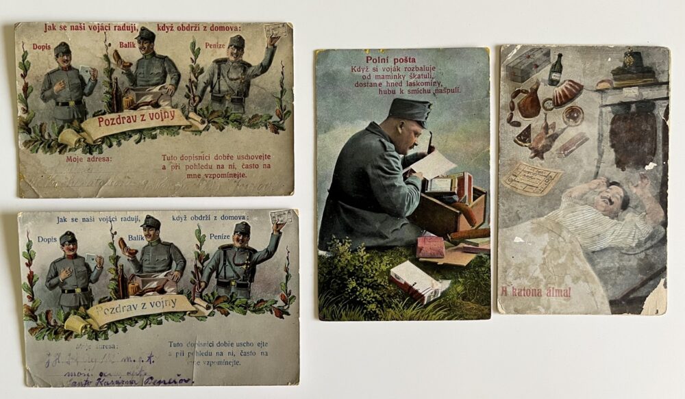 Vojenská pohlednice RU, WW1 Balík z domova, sen vojáka série 4 ks