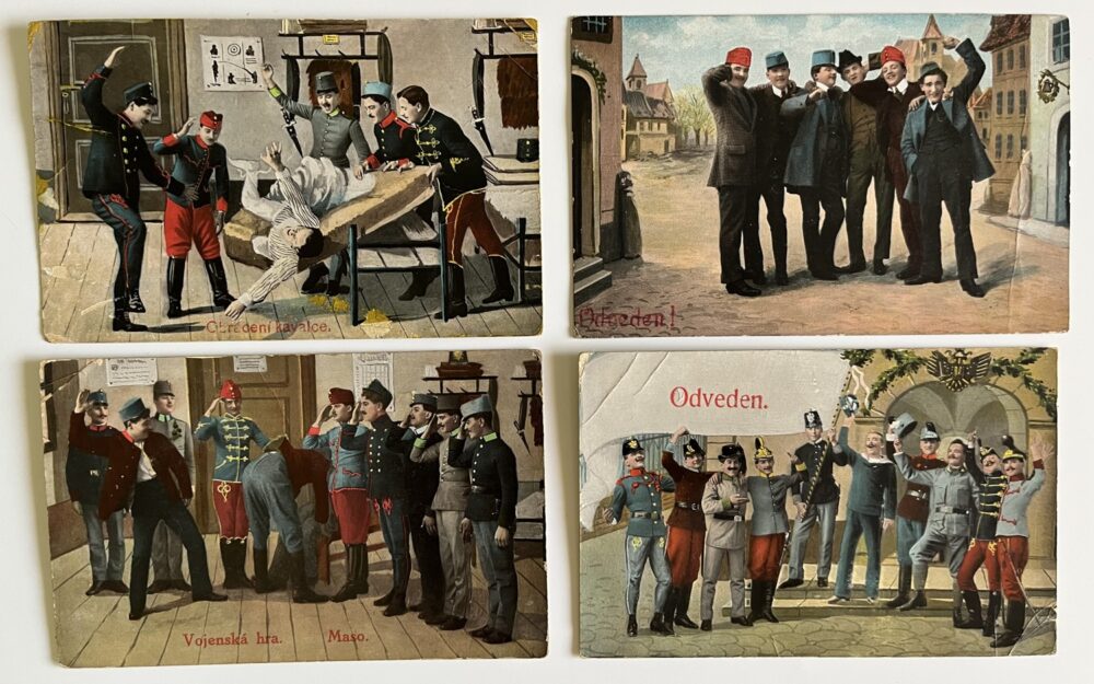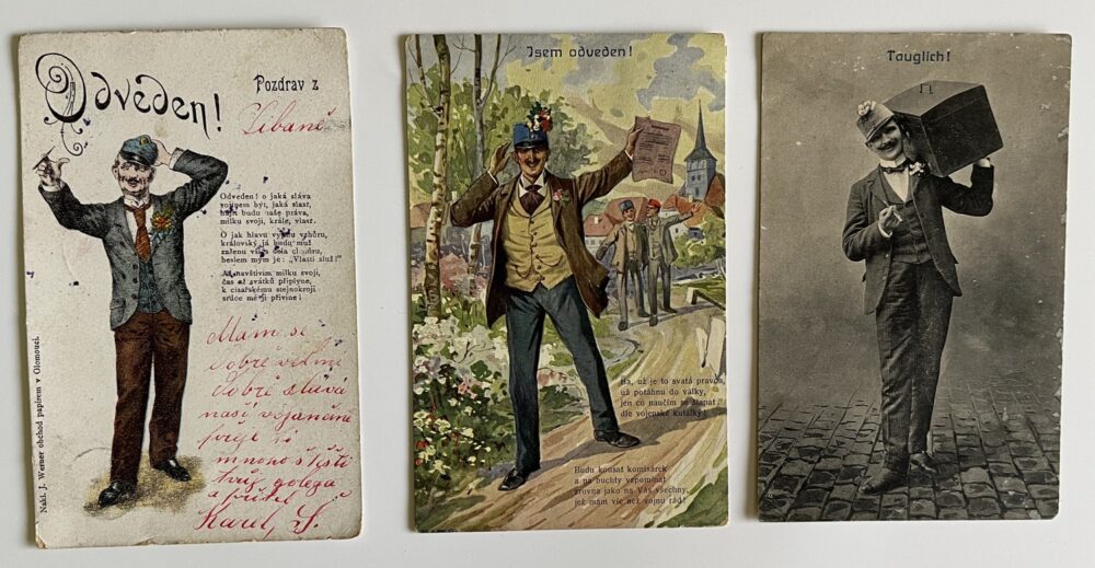 SoldVojenská pohlednice RU, WW1 Jsem odveden! Odvedenci set 3 ks