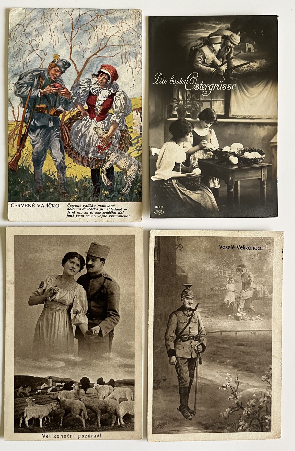 Vojenská pohlednice RU, WW1 Velikonoce voják s dívkou v kroji set 4 ks