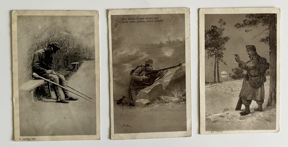 Vojenská pohlednice RU, WW1 Vojáci na frontě, výstroj set 3 ks