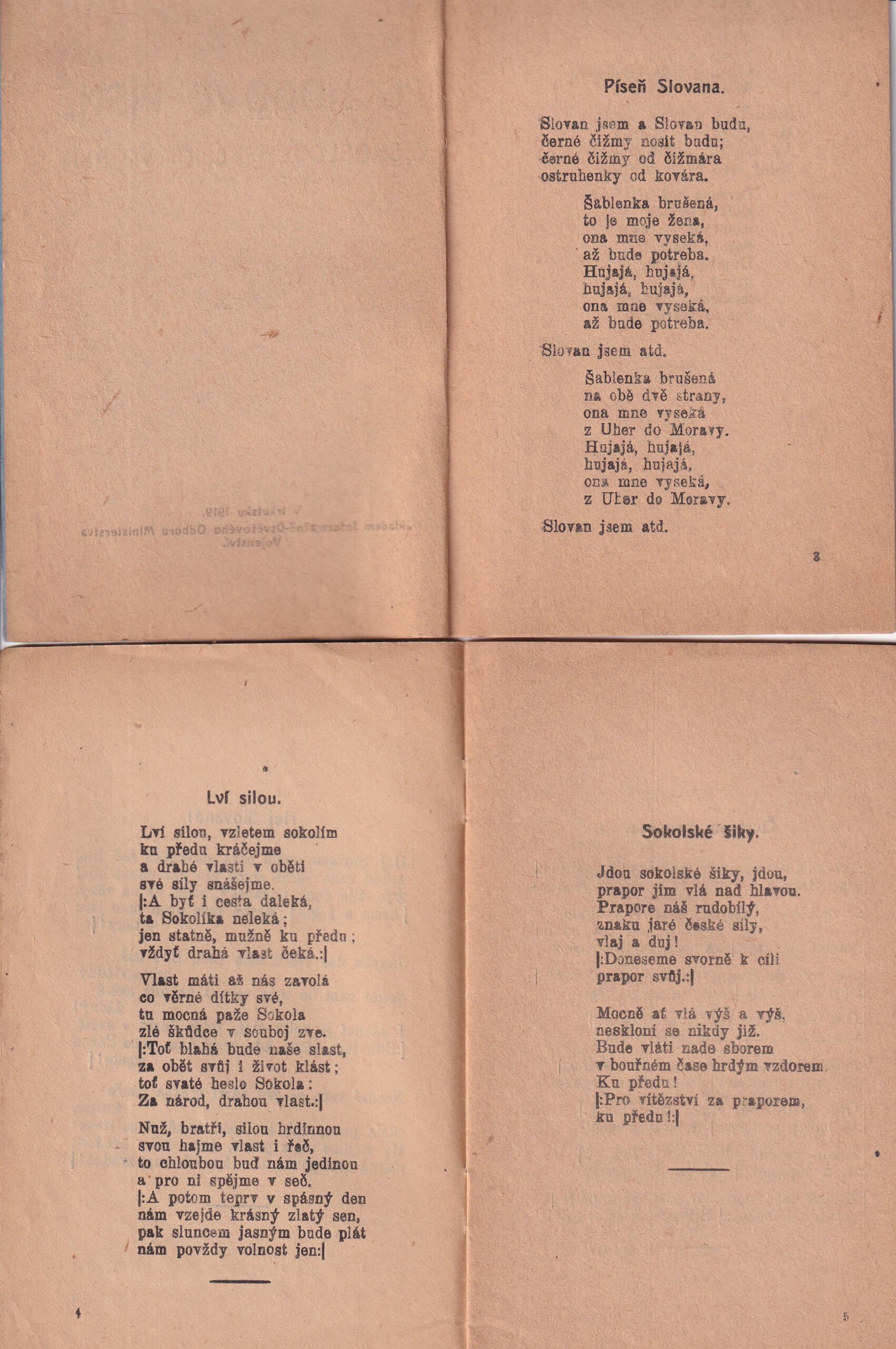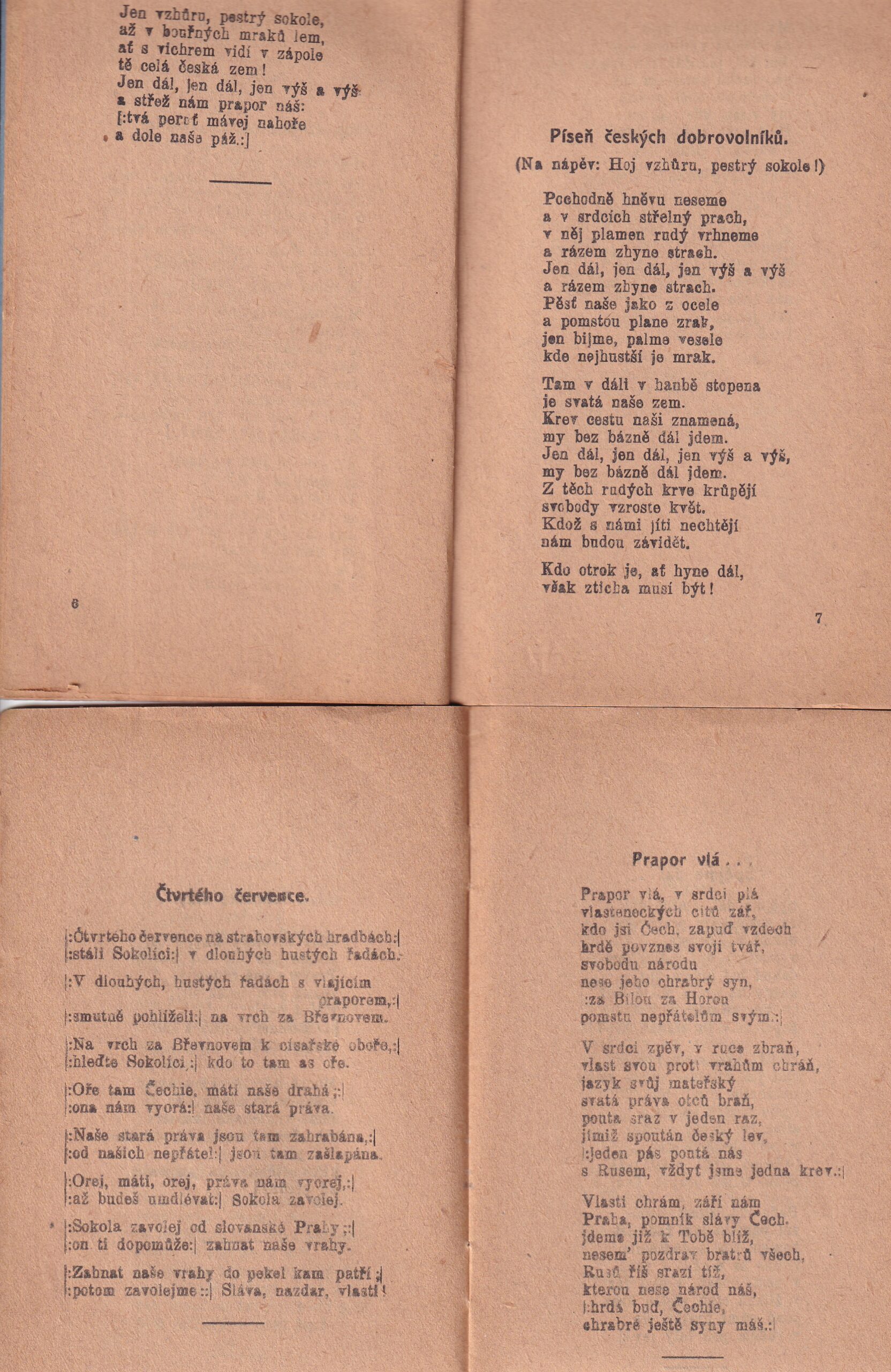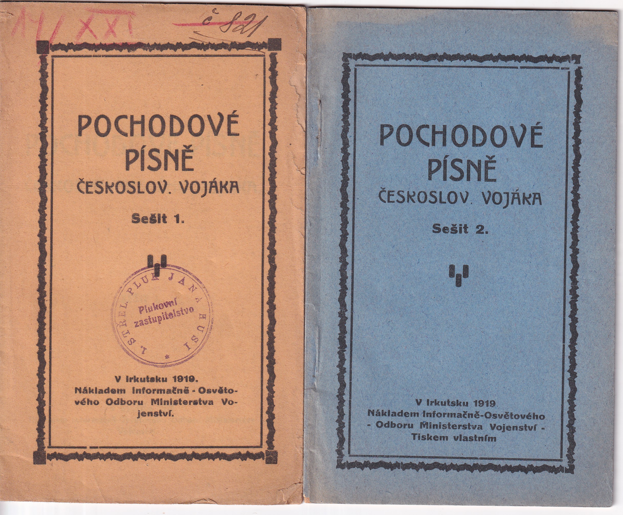 11 (K3-1) Rozměr 10 x 16 cm. Pochodové písně Československého vojáka, sešit 1. V Irkutsku 1919, razítko 1.sřel.pluk Jana Husi. Plukovní zastupitelstvo. Počet stran 24. Písně: Lví silou. Čtvrtého července. Spějme dál…Vy zelení hájové. Vrť sa děvča. Černá vlna. Jarabáček. Chodíme, chodíme. Na Veleckých lukách aj.Pochodové písně Československého vojáka, sešit 2. V Irkutsku 1919. Počet stran 23. Písně: Píseň Slovana. Píseň českých dobrovolníků. Ku předu. Husar. U Svatého Matěje. Luterán aj.