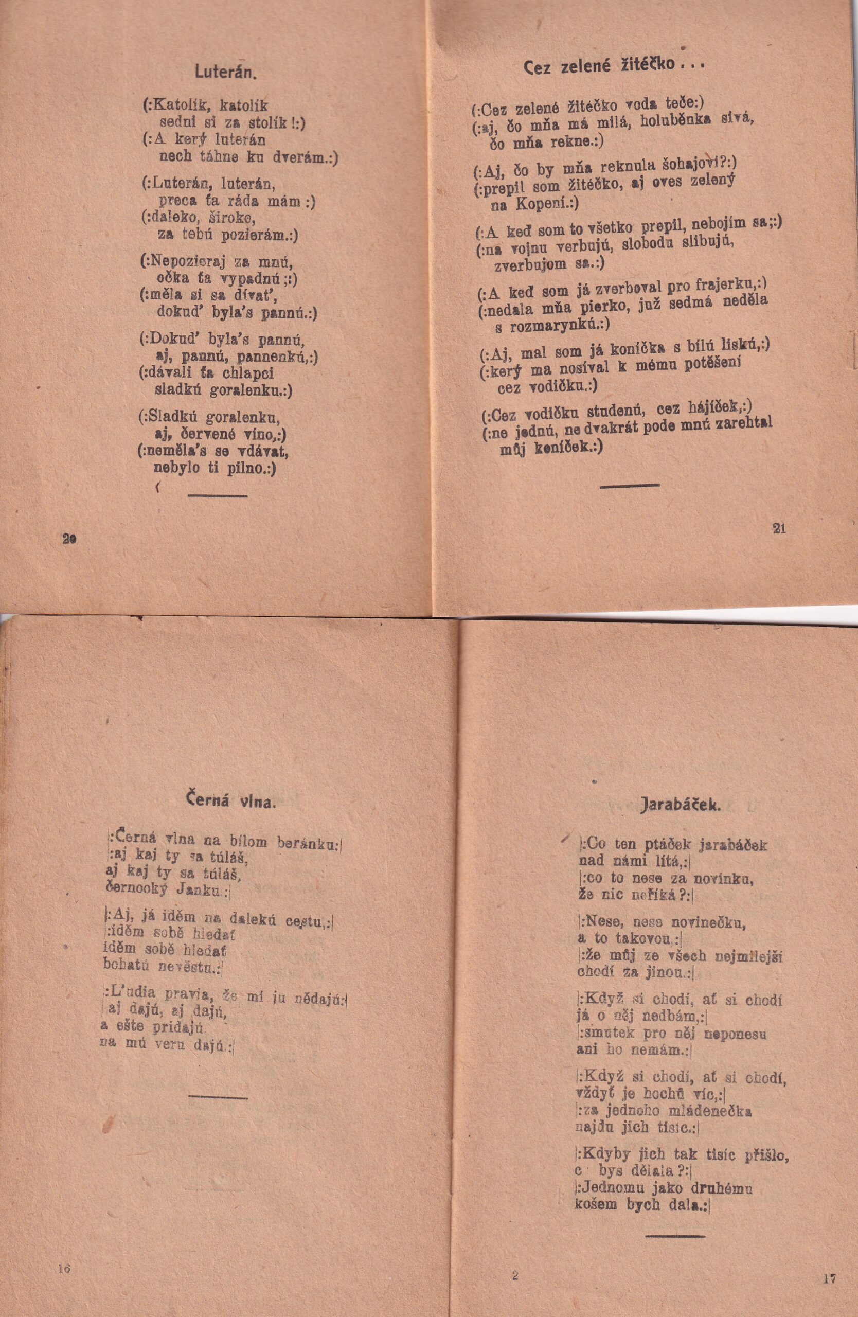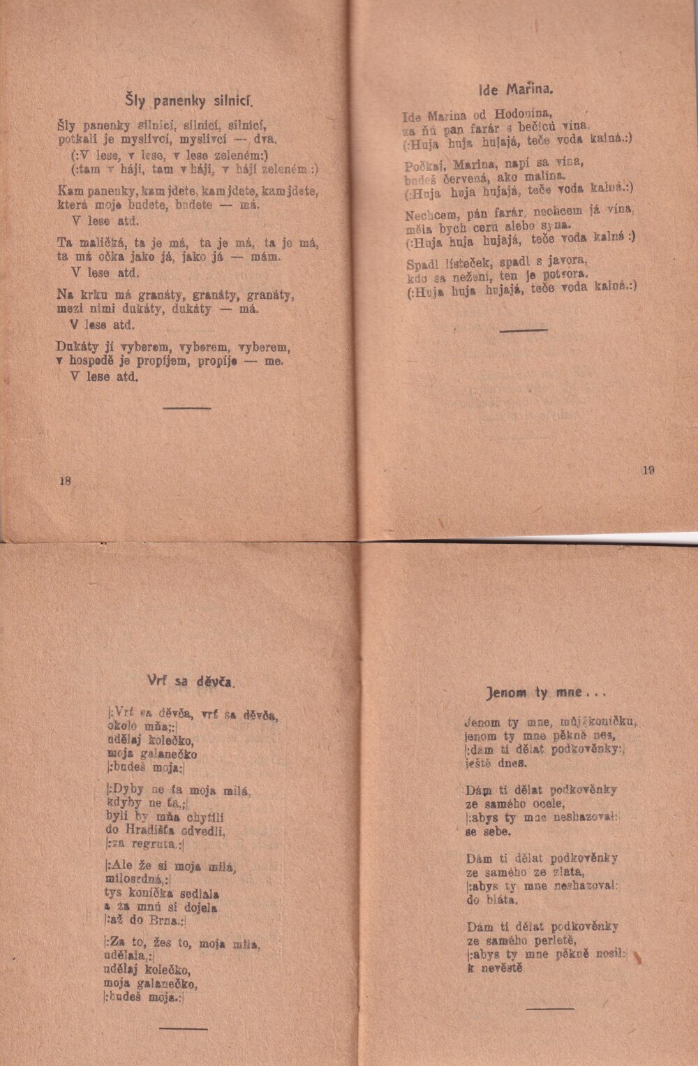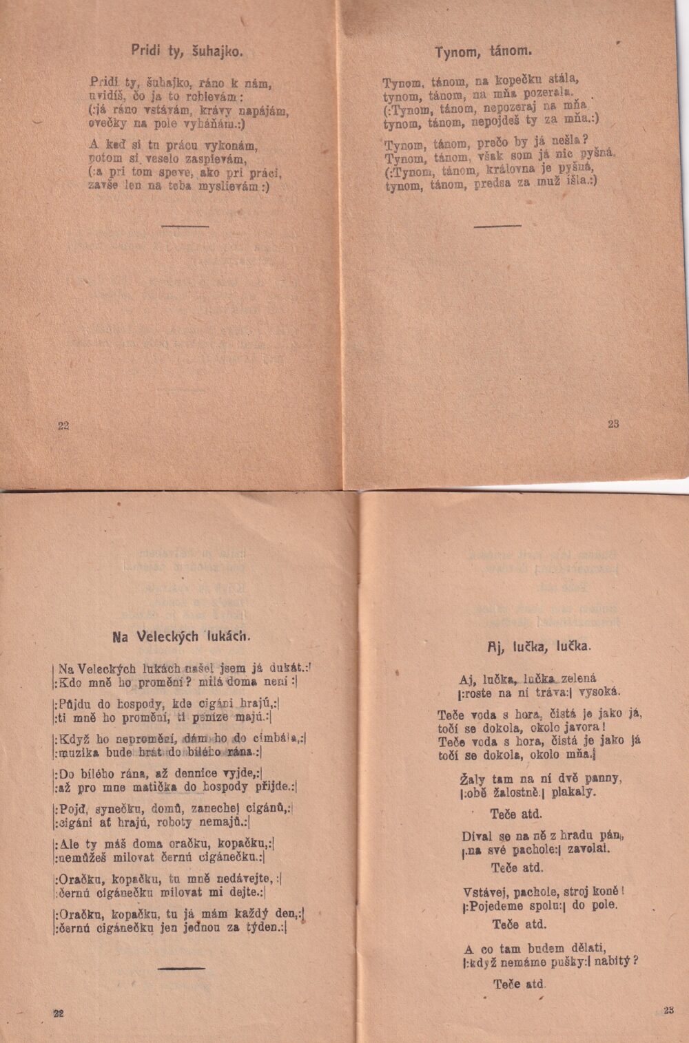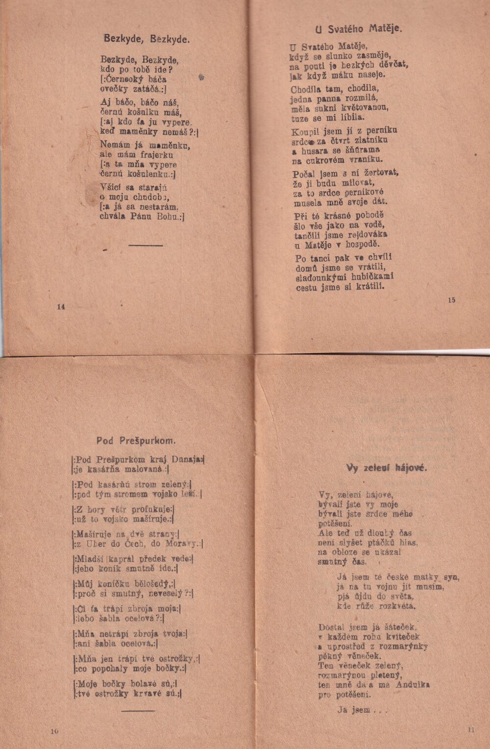 11 (K3-1) Rozměr 10 x 16 cm. Pochodové písně Československého vojáka, sešit 1. V Irkutsku 1919, razítko 1.sřel.pluk Jana Husi. Plukovní zastupitelstvo. Počet stran 24. Písně: Lví silou. Čtvrtého července. Spějme dál…Vy zelení hájové. Vrť sa děvča. Černá vlna. Jarabáček. Chodíme, chodíme. Na Veleckých lukách aj.Pochodové písně Československého vojáka, sešit 2. V Irkutsku 1919. Počet stran 23. Písně: Píseň Slovana. Píseň českých dobrovolníků. Ku předu. Husar. U Svatého Matěje. Luterán aj.