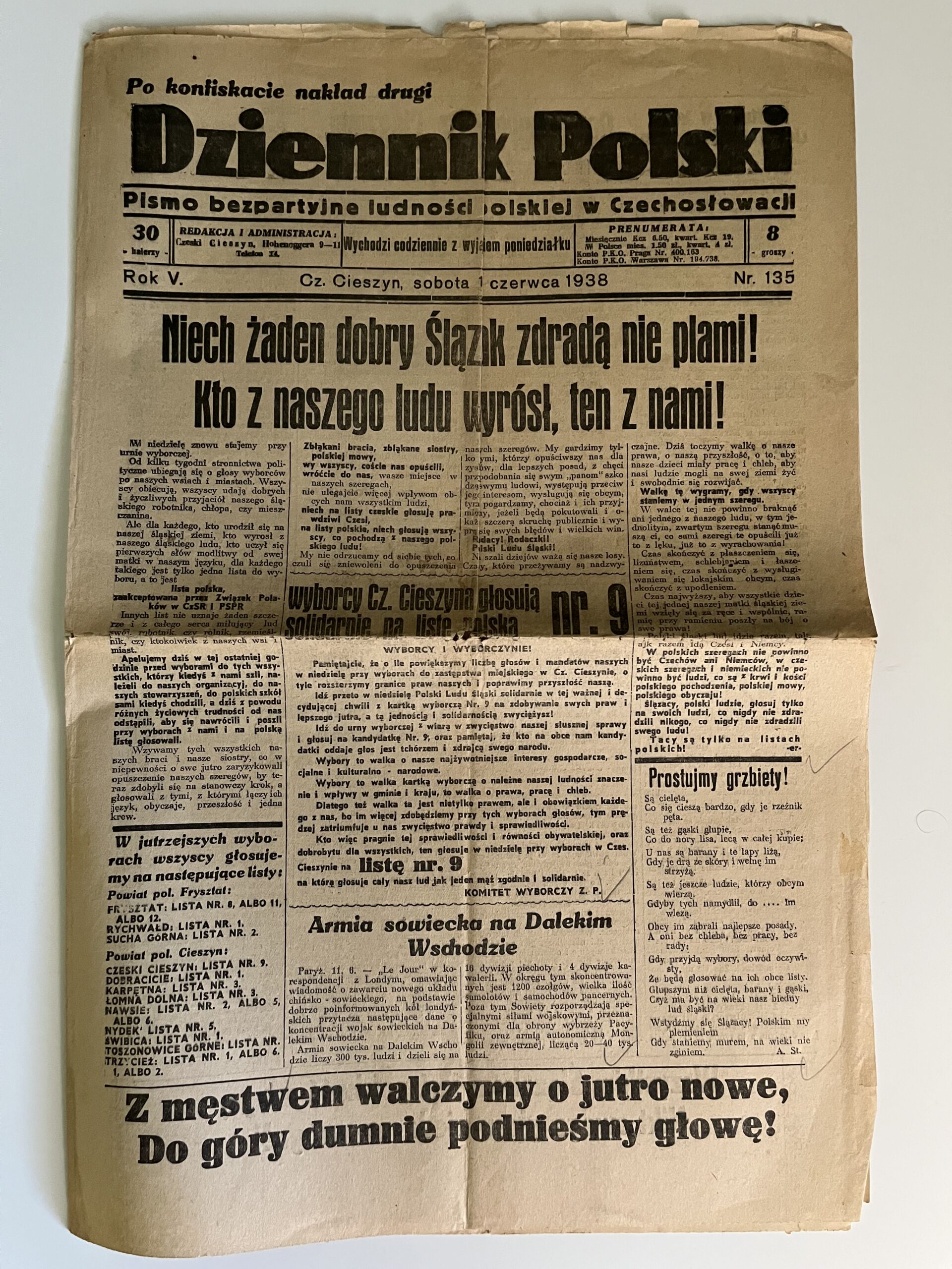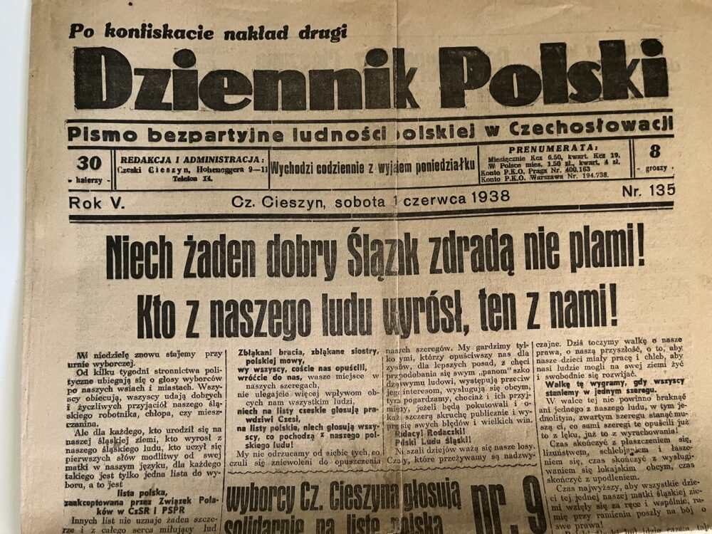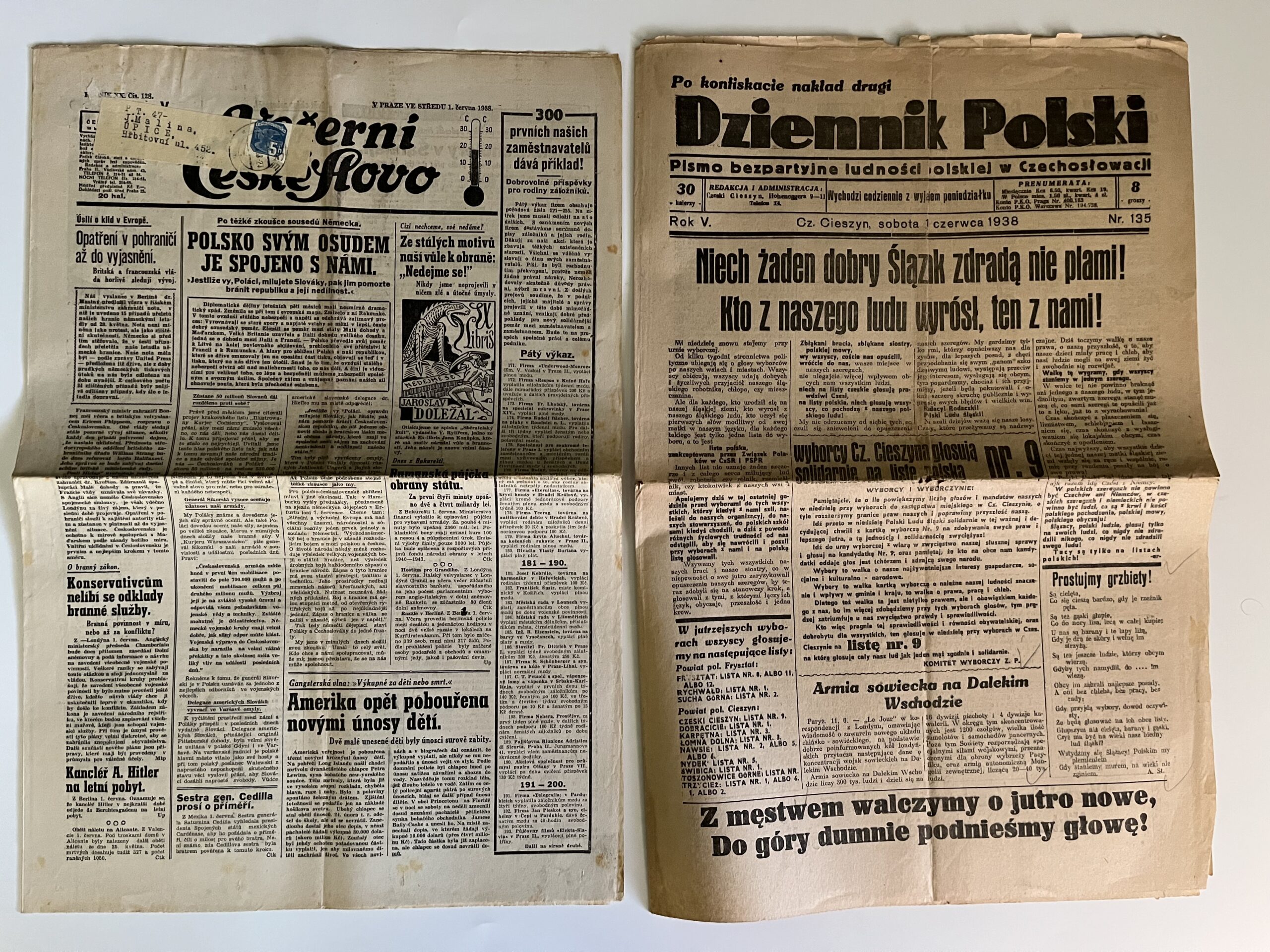12 (K3-2) Rozměr 32 x 47 cm. Dziennik Polski 11.června 1938 – Nestranický časopis polského obyvatelstva v Československu – z obsahu: Ať se žádný dobrý Slezan neposkvrní zradou! Kdo vyrostl z našich lidí, je s námi. Sovětská armáda na Dálném východě. Bojujeme statečně za nový zítřek, zvedněme hrdě hlavy!…ad. počet stran 6. Večerní České Slovo 1.června 1938 – Polsko svým osudem je spojeno s námi. Ze stálých motivů naší vůle k obraně: Nedejme se! Amerika opět pobouřena novými únosy dětí…ad. 6 stran.