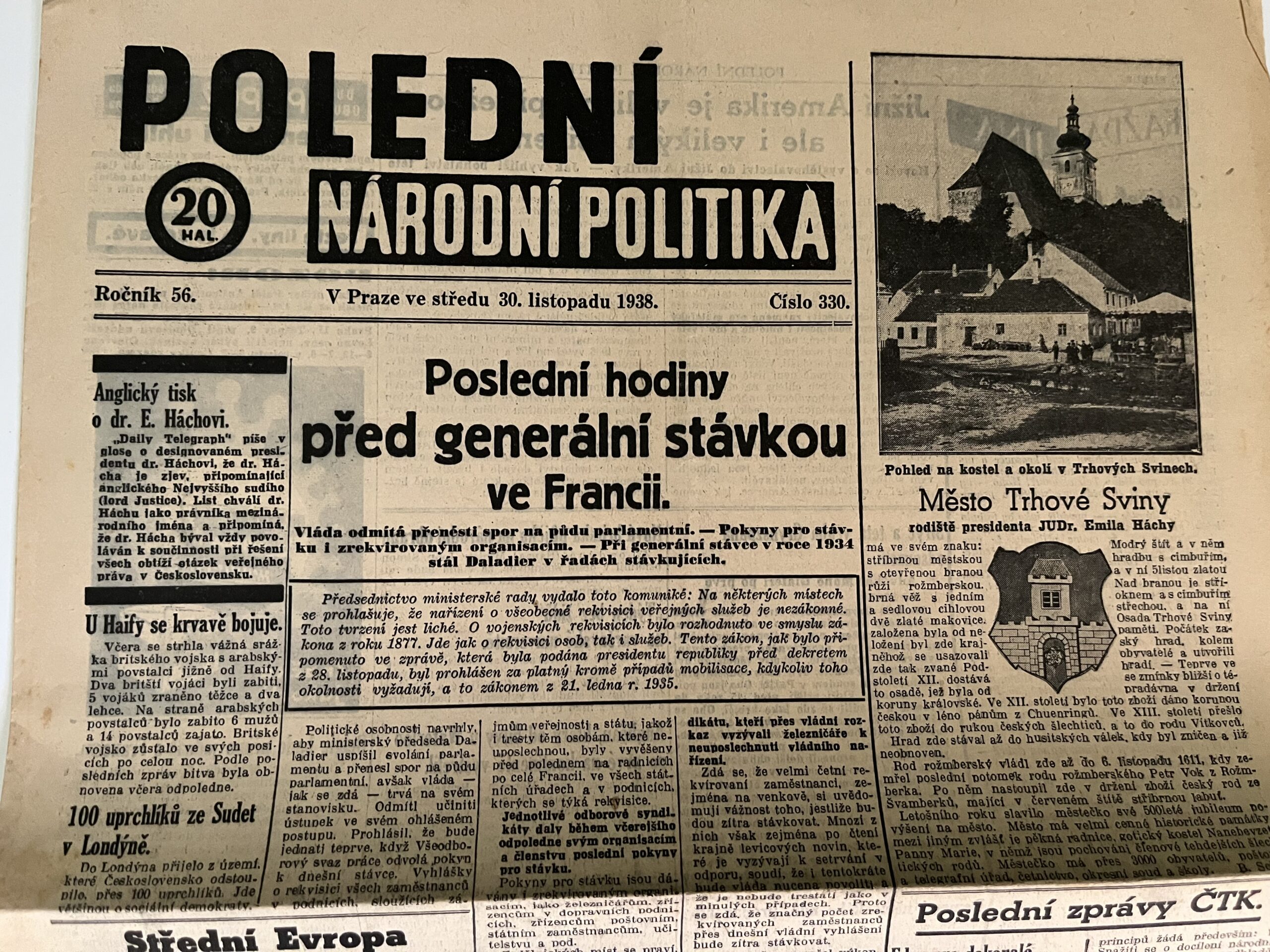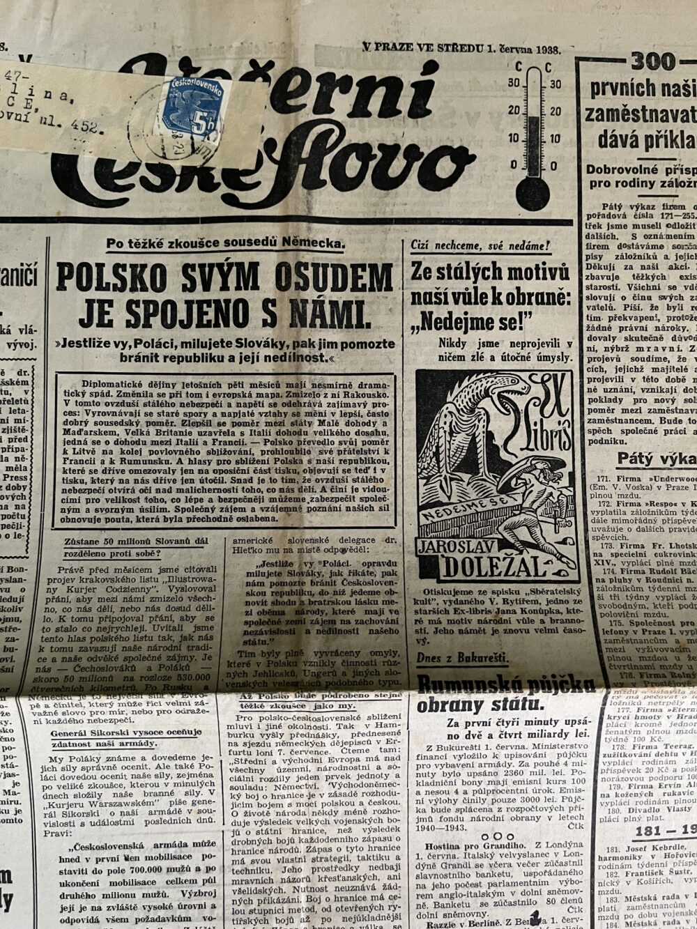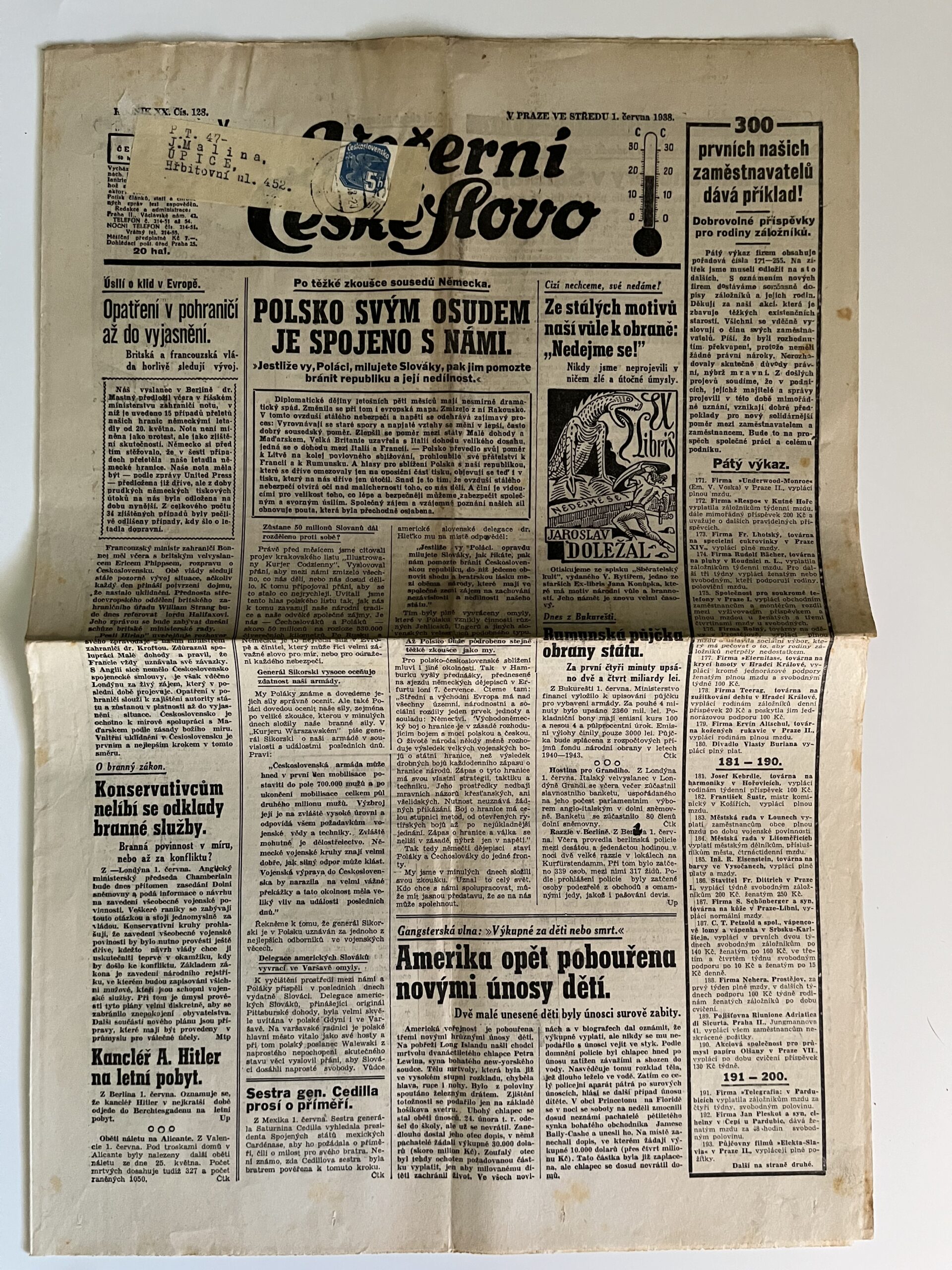 12 (K3-2) Rozměr 32 x 47 cm. Dziennik Polski 11.června 1938 – Nestranický časopis polského obyvatelstva v Československu – z obsahu: Ať se žádný dobrý Slezan neposkvrní zradou! Kdo vyrostl z našich lidí, je s námi. Sovětská armáda na Dálném východě. Bojujeme statečně za nový zítřek, zvedněme hrdě hlavy!…ad. počet stran 6. Večerní České Slovo 1.června 1938 – Polsko svým osudem je spojeno s námi. Ze stálých motivů naší vůle k obraně: Nedejme se! Amerika opět pobouřena novými únosy dětí…ad. 6 stran.