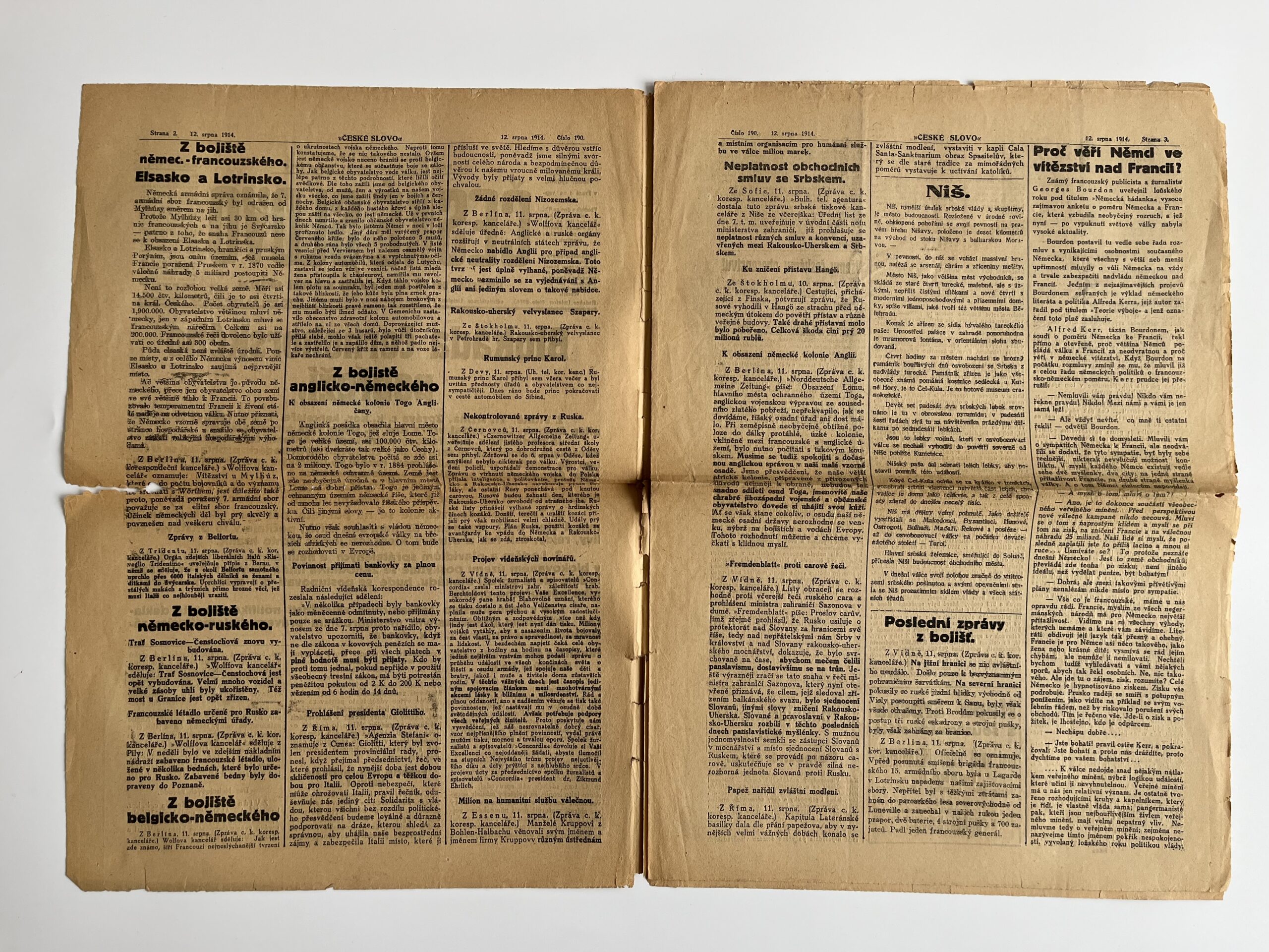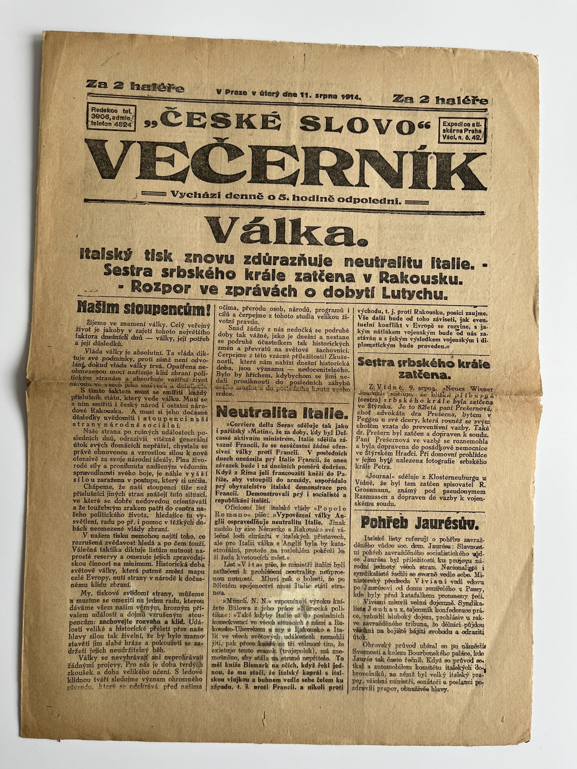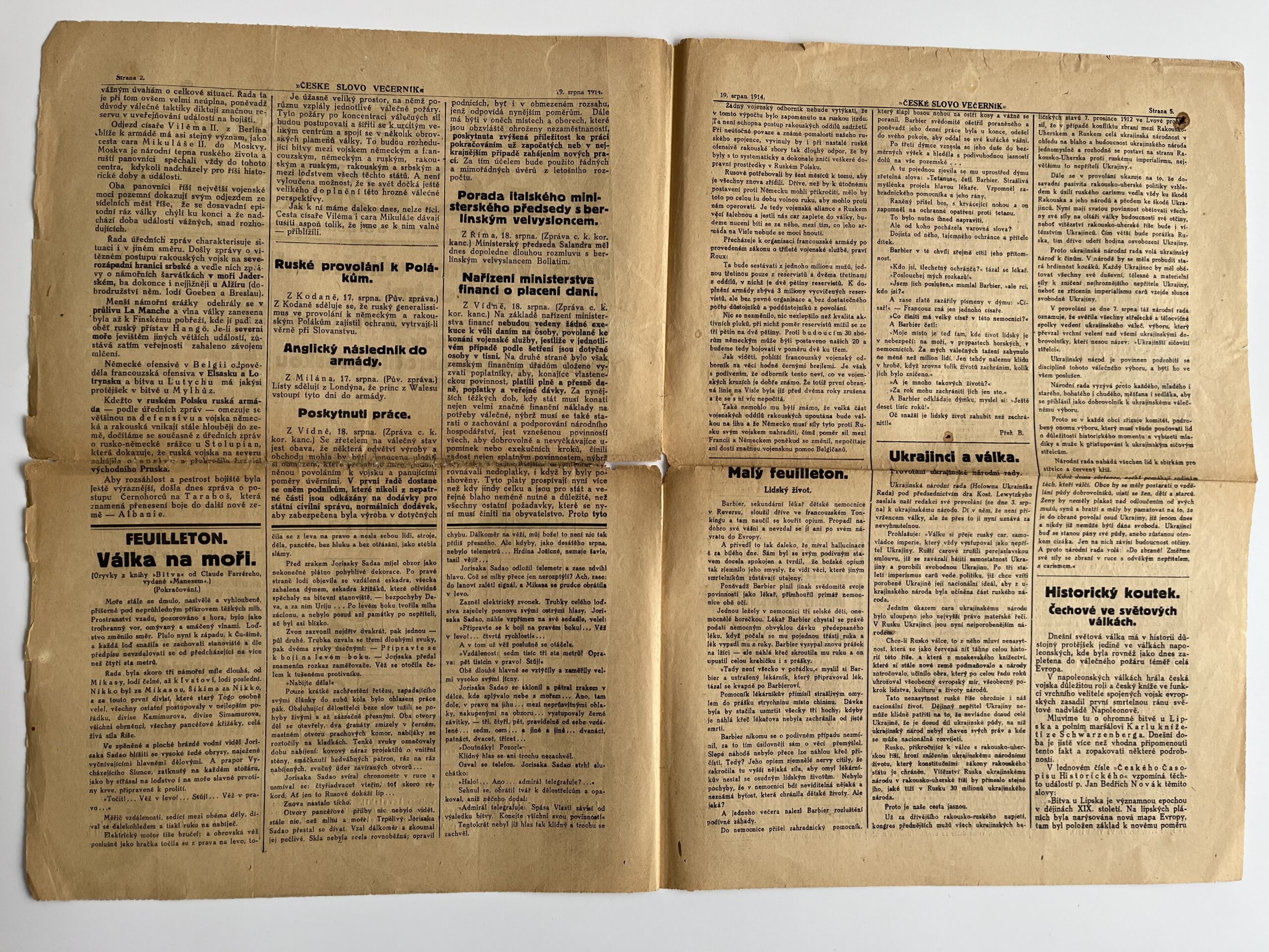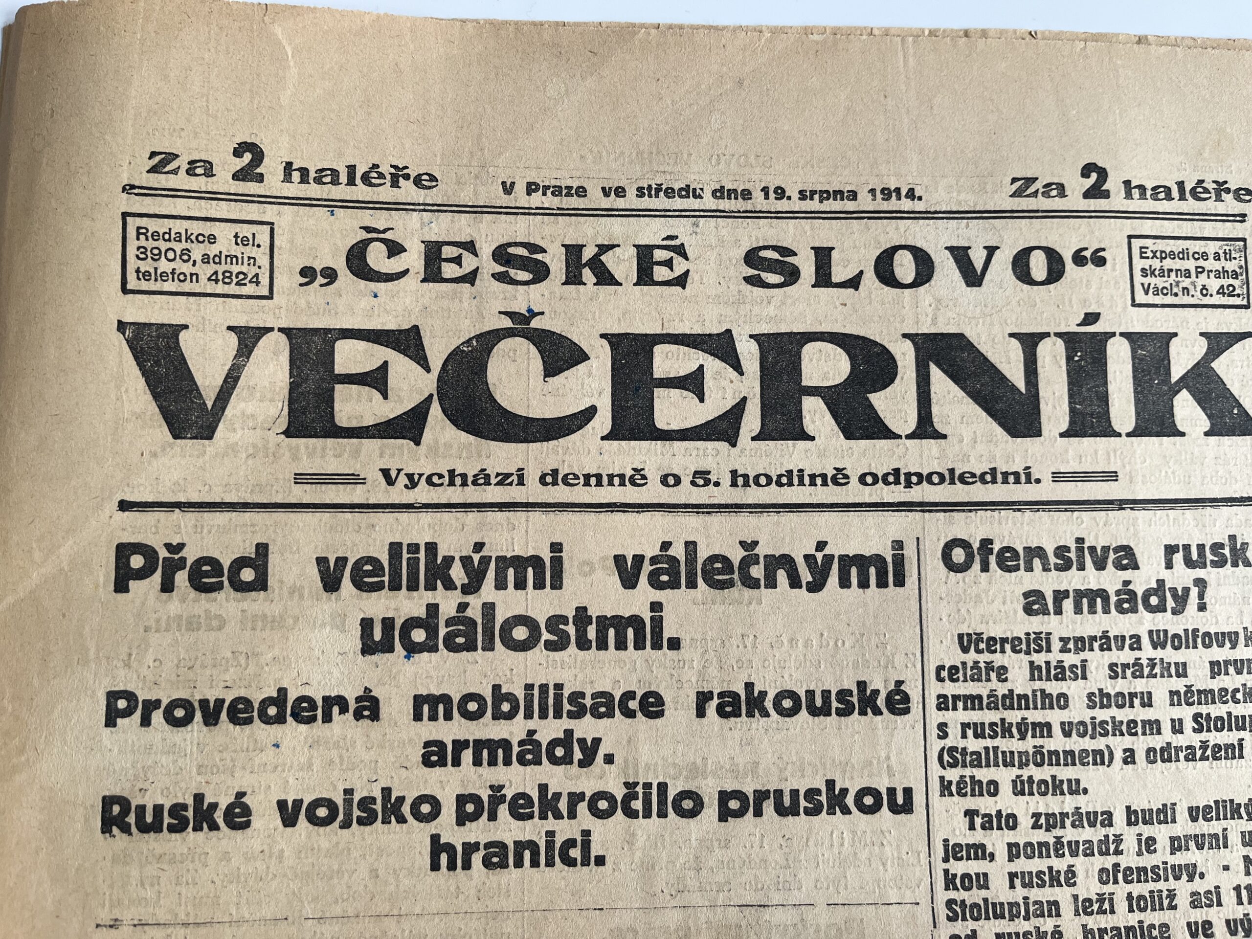 17 (K3-1) Rozměr jedné strany 28 x 39 cm. Válečné noviny Večerník,České Slovo z 11.,12.a 19.srpna 1914 3ks Noviny Večerník České Slovo ze dne 11.srpna 1914. Z obsahu novin: Válka. Italský tisk znovu zdůrazňuje neutralitu Itálie. Sestra srbského krále zatčena v Rakousku. Rozpor ve zprávách o dobytí Lutychu. Našim stoupencům!Pohřeb Jaurésův. 4 strany. České Slovo ze dne 12.srpna 1914. Z obsahu novin: Blokáda černohorského pobřeží. Fanatické pronásledování Němců v Belgii. Francie připravovala válku? V přehybech poškozeny. 8 stran. Noviny Večerník České Slovo ze dne 19.srpna 1914. Z obsahu novin: Před velikými válečnými událostmi. Provedená mobilisace rakouské armády. Ruské vojsko překročilo pruskou hranici. Ofensiva ruské armády? Hlavní osobnosti dnešního Ruska. Noviny v přehybu poškozené. 4 strany.