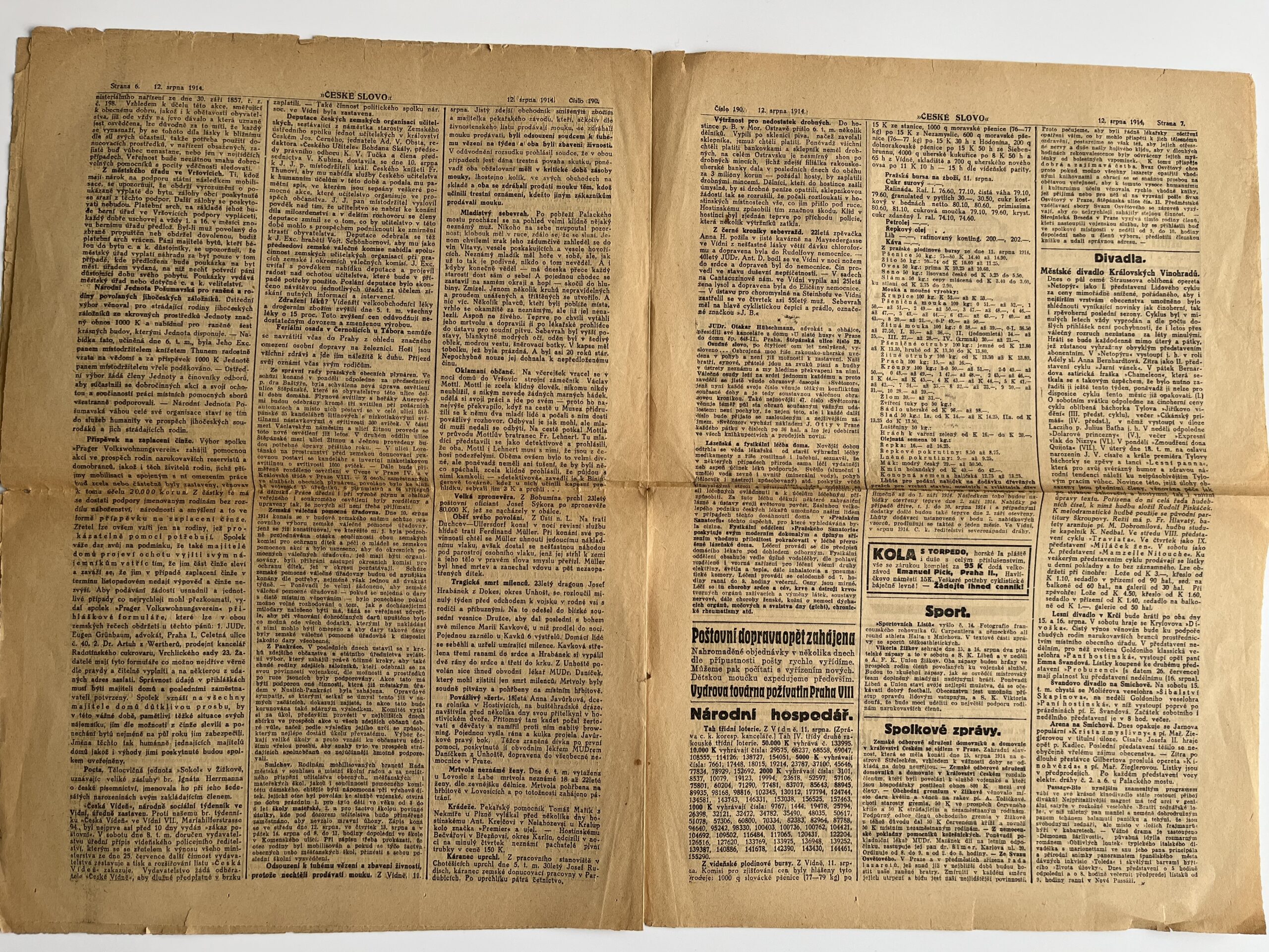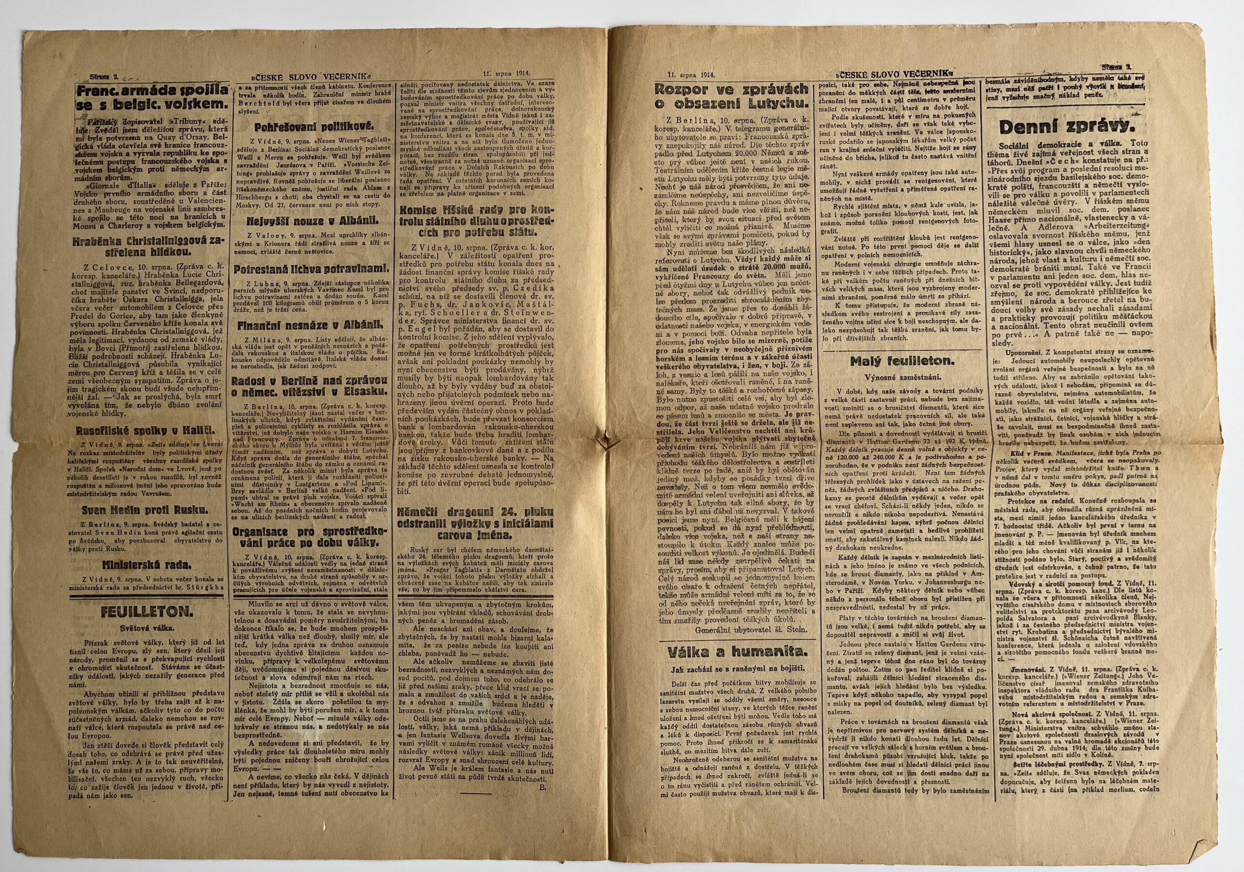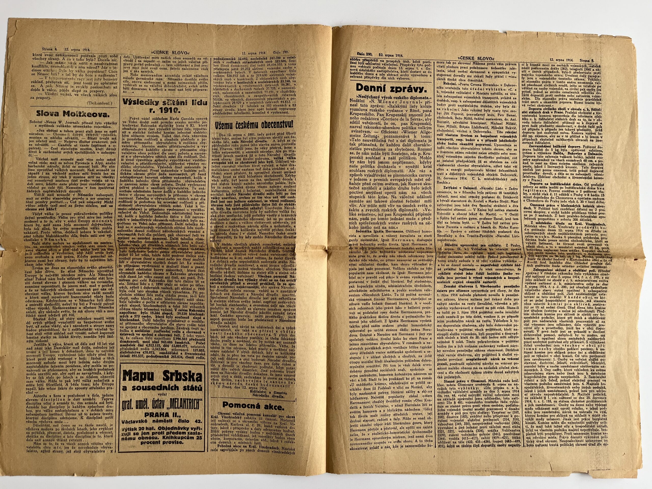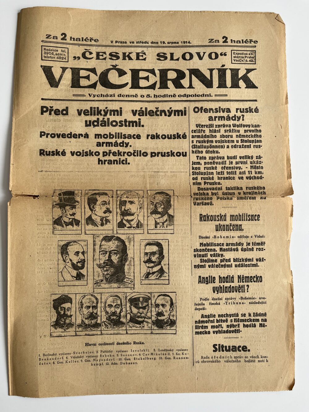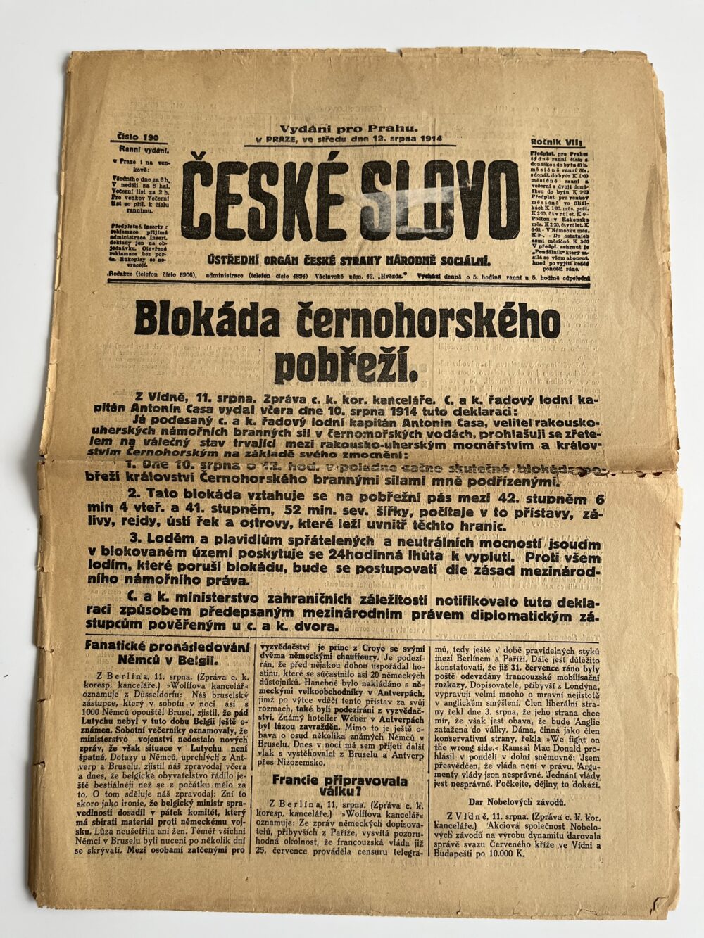 17 (K3-1) Rozměr jedné strany 28 x 39 cm. Válečné noviny Večerník,České Slovo z 11.,12.a 19.srpna 1914 3ks Noviny Večerník České Slovo ze dne 11.srpna 1914. Z obsahu novin: Válka. Italský tisk znovu zdůrazňuje neutralitu Itálie. Sestra srbského krále zatčena v Rakousku. Rozpor ve zprávách o dobytí Lutychu. Našim stoupencům!Pohřeb Jaurésův. 4 strany. České Slovo ze dne 12.srpna 1914. Z obsahu novin: Blokáda černohorského pobřeží. Fanatické pronásledování Němců v Belgii. Francie připravovala válku? V přehybech poškozeny. 8 stran. Noviny Večerník České Slovo ze dne 19.srpna 1914. Z obsahu novin: Před velikými válečnými událostmi. Provedená mobilisace rakouské armády. Ruské vojsko překročilo pruskou hranici. Ofensiva ruské armády? Hlavní osobnosti dnešního Ruska. Noviny v přehybu poškozené. 4 strany.