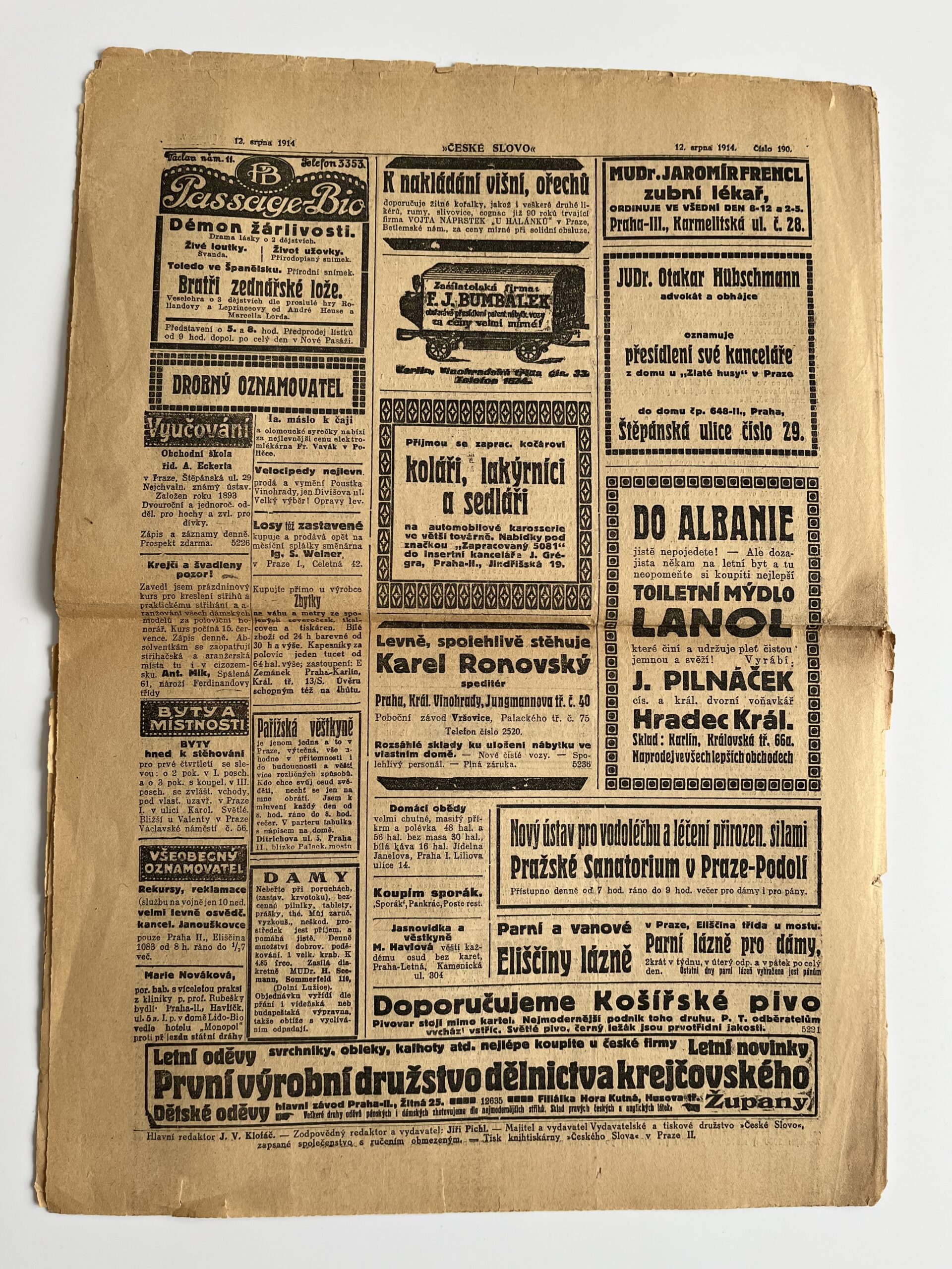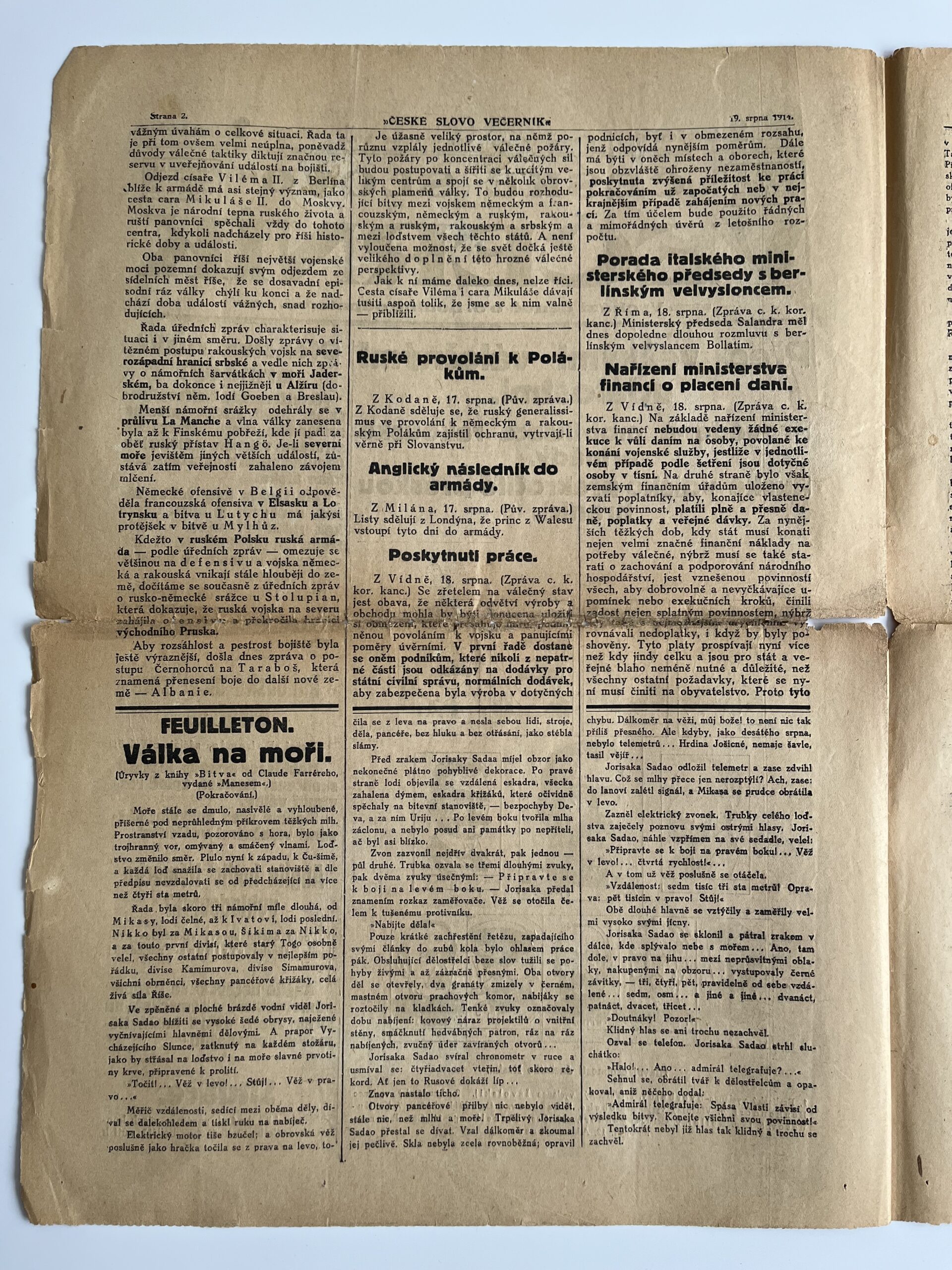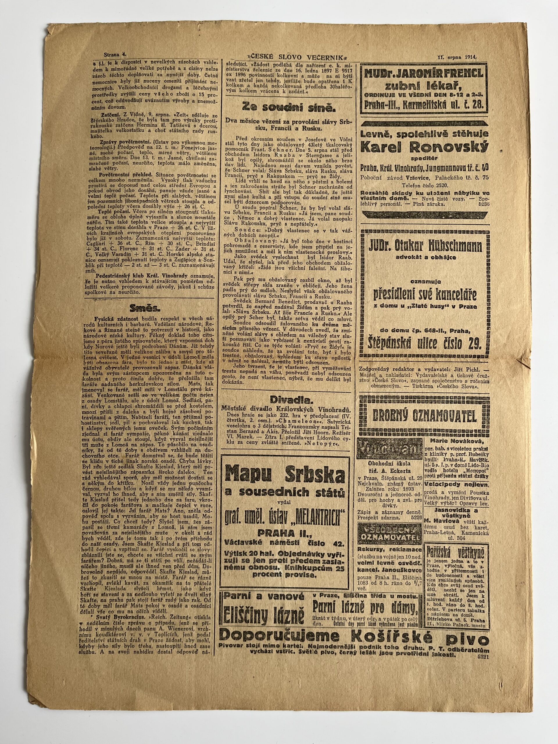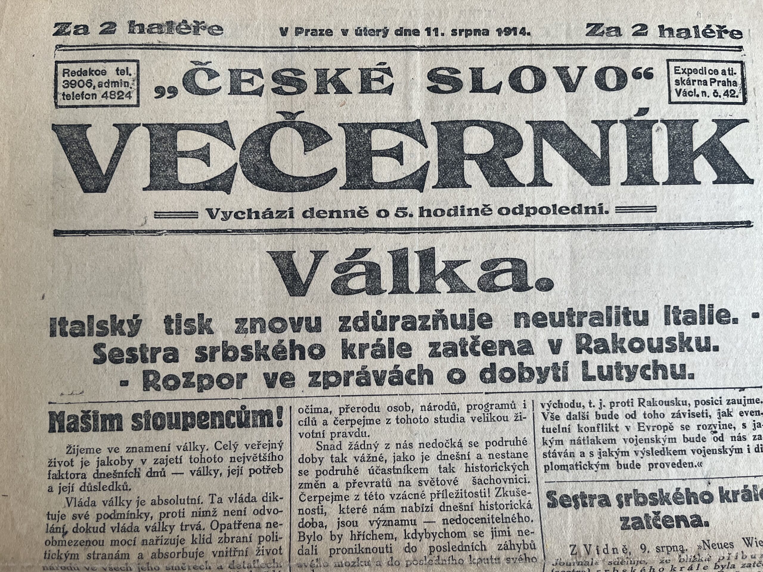 17 (K3-1) Rozměr jedné strany 28 x 39 cm. Válečné noviny Večerník,České Slovo z 11.,12.a 19.srpna 1914 3ks Noviny Večerník České Slovo ze dne 11.srpna 1914. Z obsahu novin: Válka. Italský tisk znovu zdůrazňuje neutralitu Itálie. Sestra srbského krále zatčena v Rakousku. Rozpor ve zprávách o dobytí Lutychu. Našim stoupencům!Pohřeb Jaurésův. 4 strany. České Slovo ze dne 12.srpna 1914. Z obsahu novin: Blokáda černohorského pobřeží. Fanatické pronásledování Němců v Belgii. Francie připravovala válku? V přehybech poškozeny. 8 stran. Noviny Večerník České Slovo ze dne 19.srpna 1914. Z obsahu novin: Před velikými válečnými událostmi. Provedená mobilisace rakouské armády. Ruské vojsko překročilo pruskou hranici. Ofensiva ruské armády? Hlavní osobnosti dnešního Ruska. Noviny v přehybu poškozené. 4 strany.