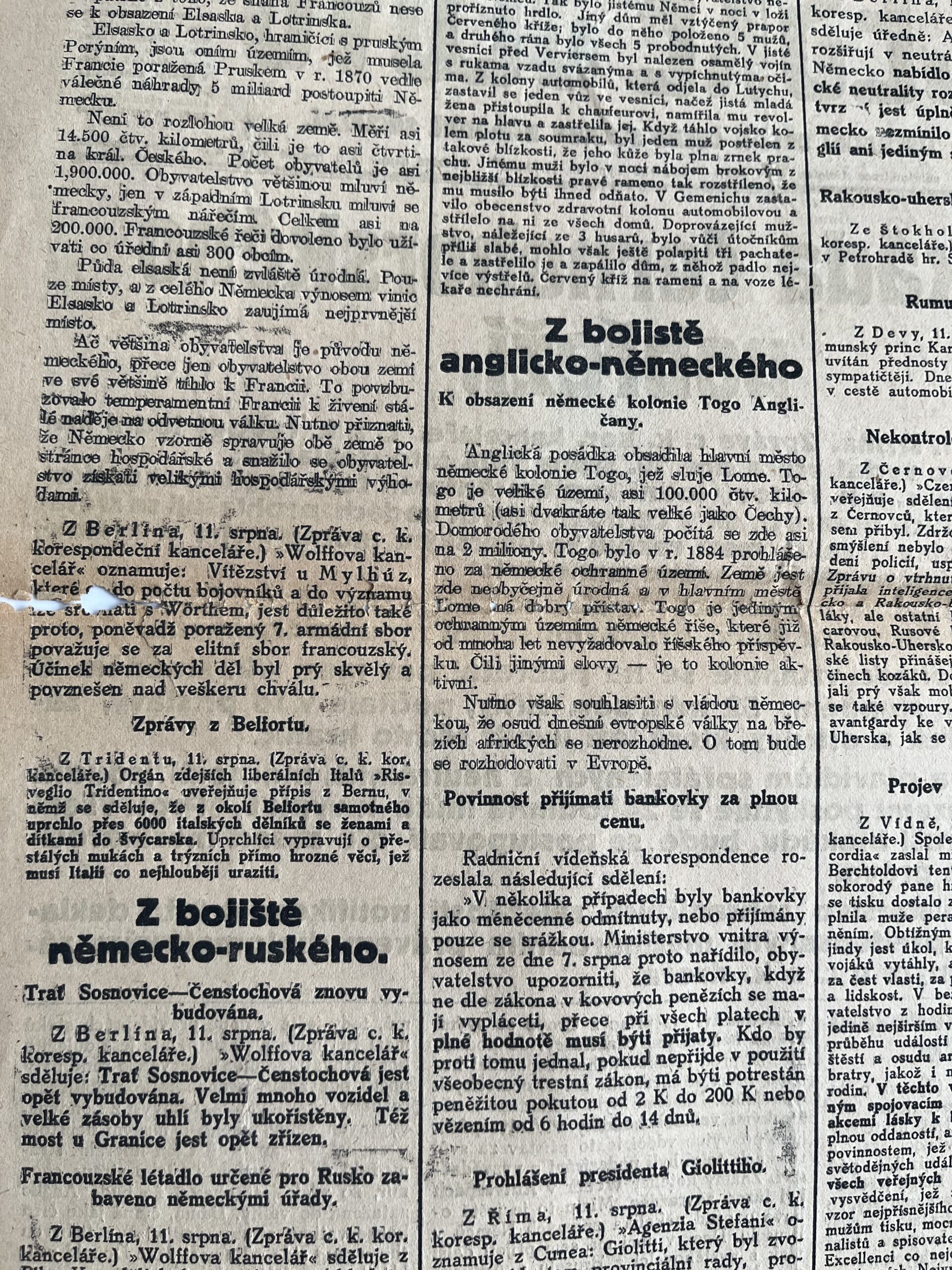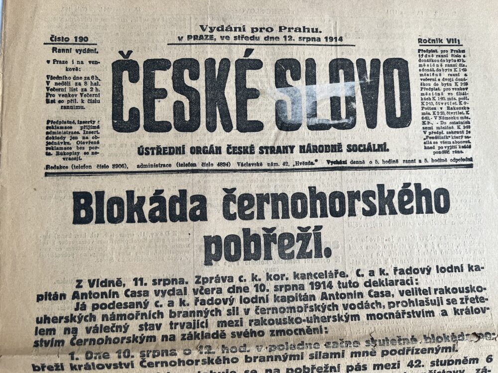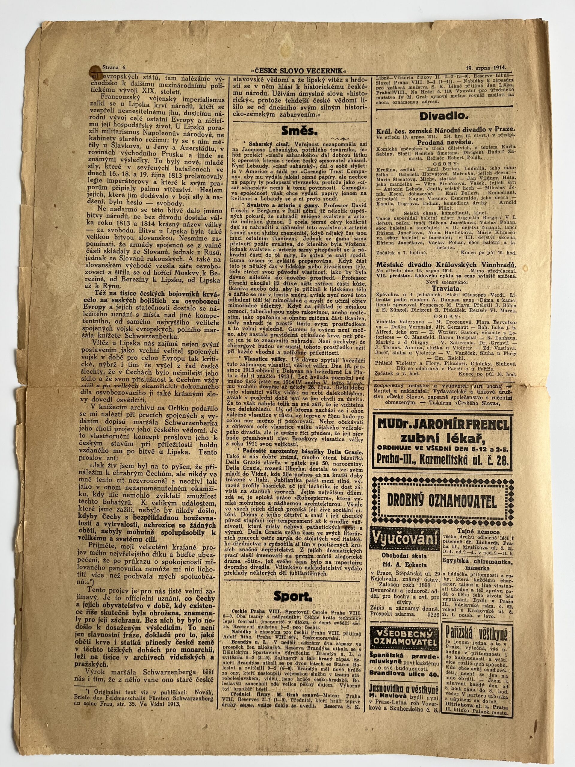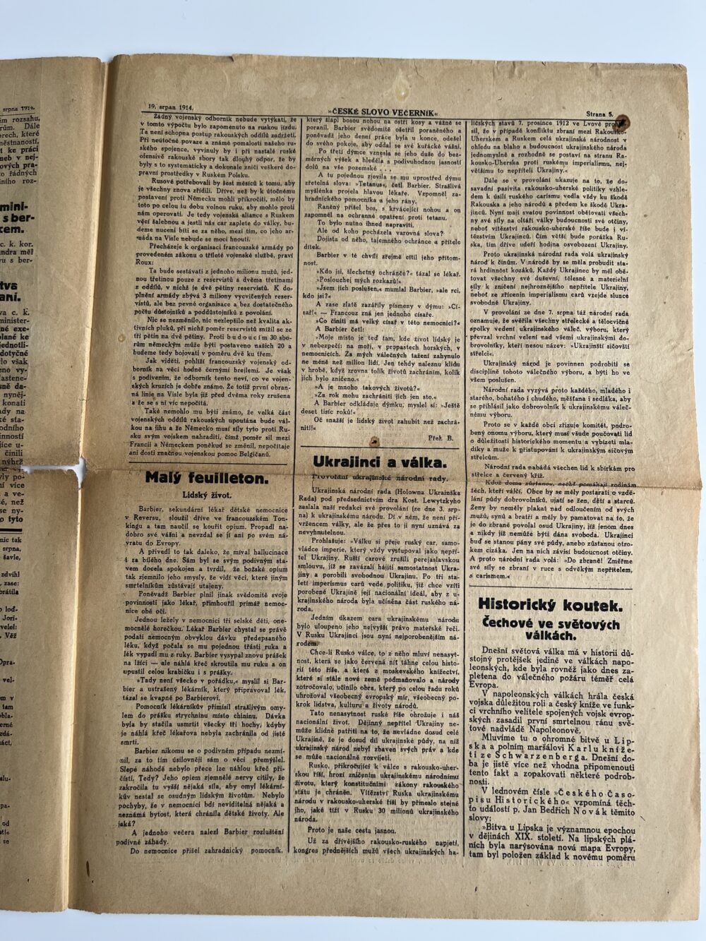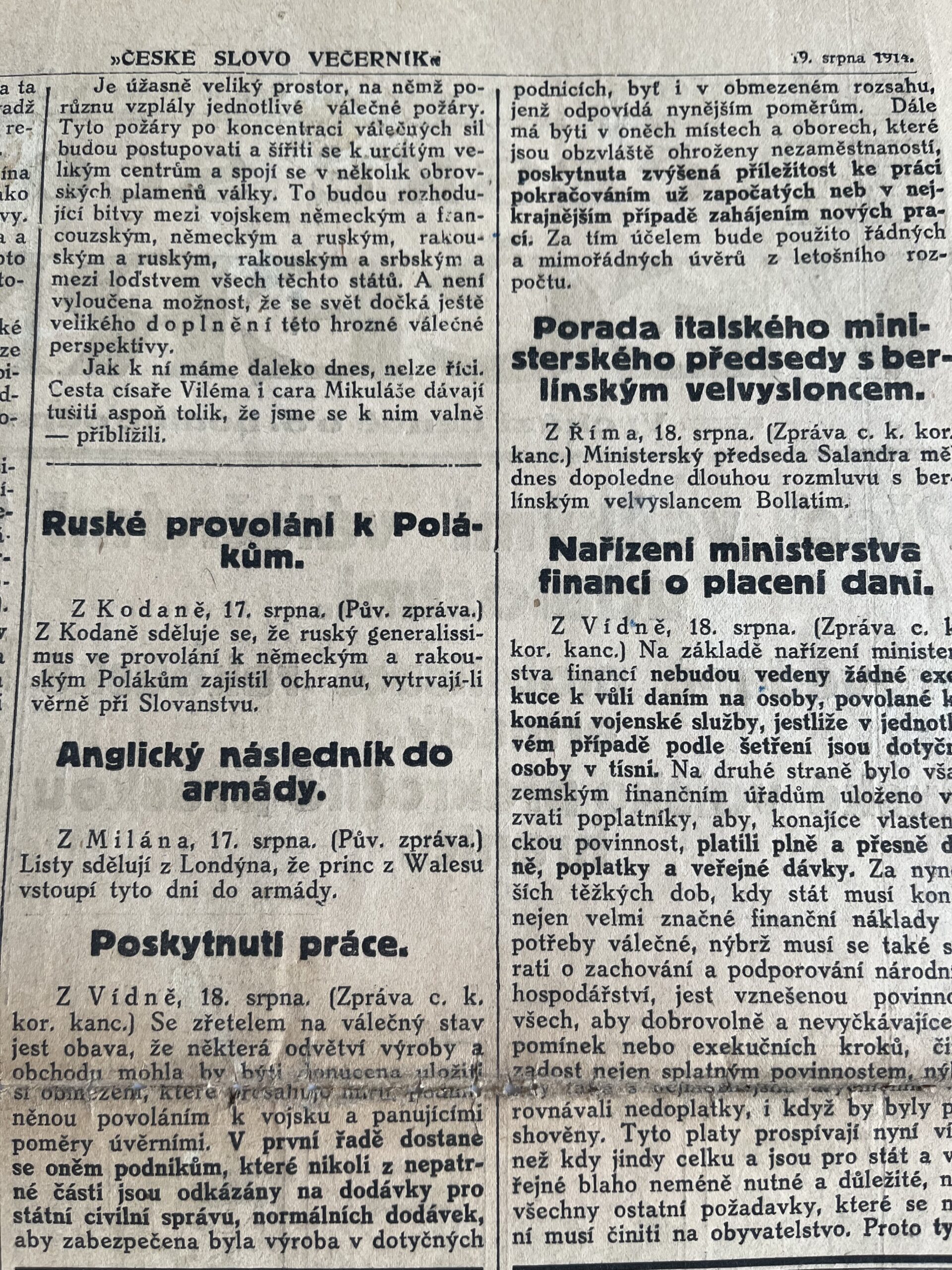 17 (K3-1) Rozměr jedné strany 28 x 39 cm. Válečné noviny Večerník,České Slovo z 11.,12.a 19.srpna 1914 3ks Noviny Večerník České Slovo ze dne 11.srpna 1914. Z obsahu novin: Válka. Italský tisk znovu zdůrazňuje neutralitu Itálie. Sestra srbského krále zatčena v Rakousku. Rozpor ve zprávách o dobytí Lutychu. Našim stoupencům!Pohřeb Jaurésův. 4 strany. České Slovo ze dne 12.srpna 1914. Z obsahu novin: Blokáda černohorského pobřeží. Fanatické pronásledování Němců v Belgii. Francie připravovala válku? V přehybech poškozeny. 8 stran. Noviny Večerník České Slovo ze dne 19.srpna 1914. Z obsahu novin: Před velikými válečnými událostmi. Provedená mobilisace rakouské armády. Ruské vojsko překročilo pruskou hranici. Ofensiva ruské armády? Hlavní osobnosti dnešního Ruska. Noviny v přehybu poškozené. 4 strany.