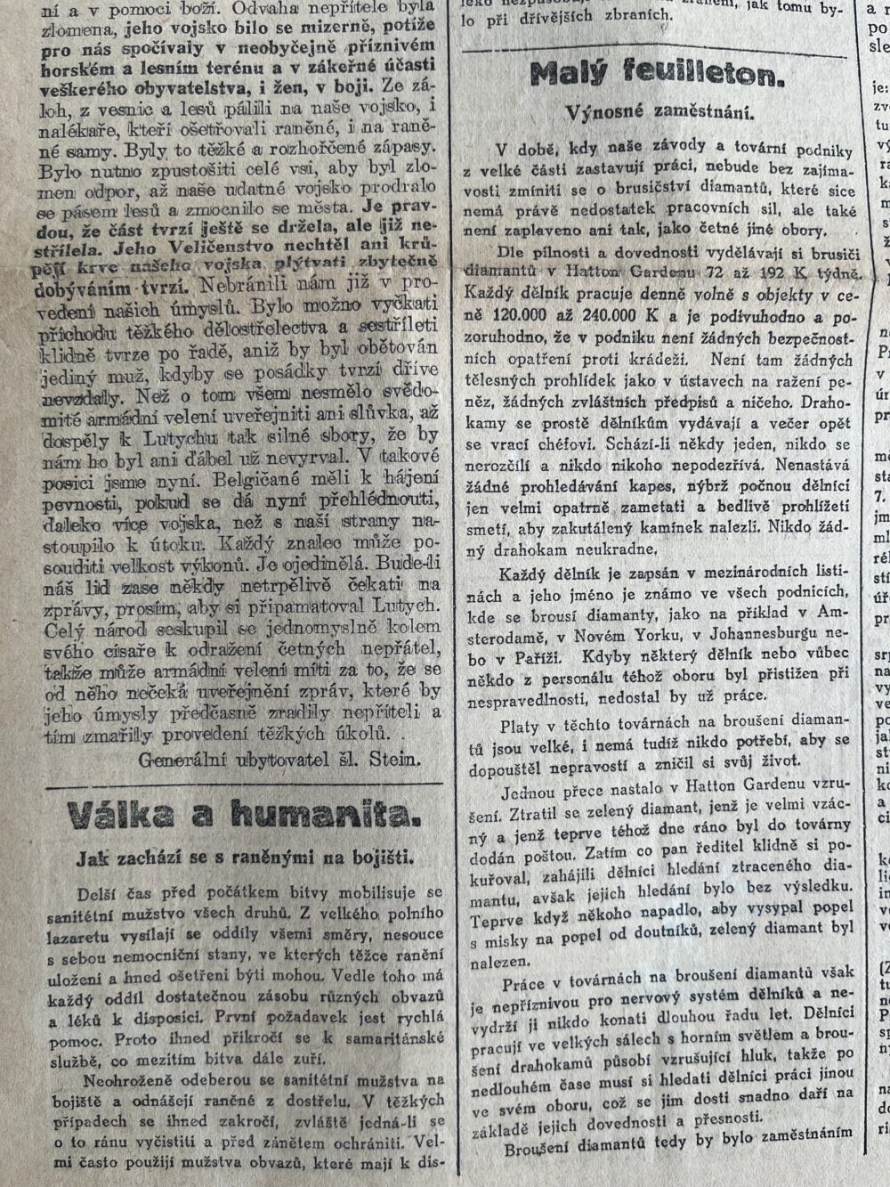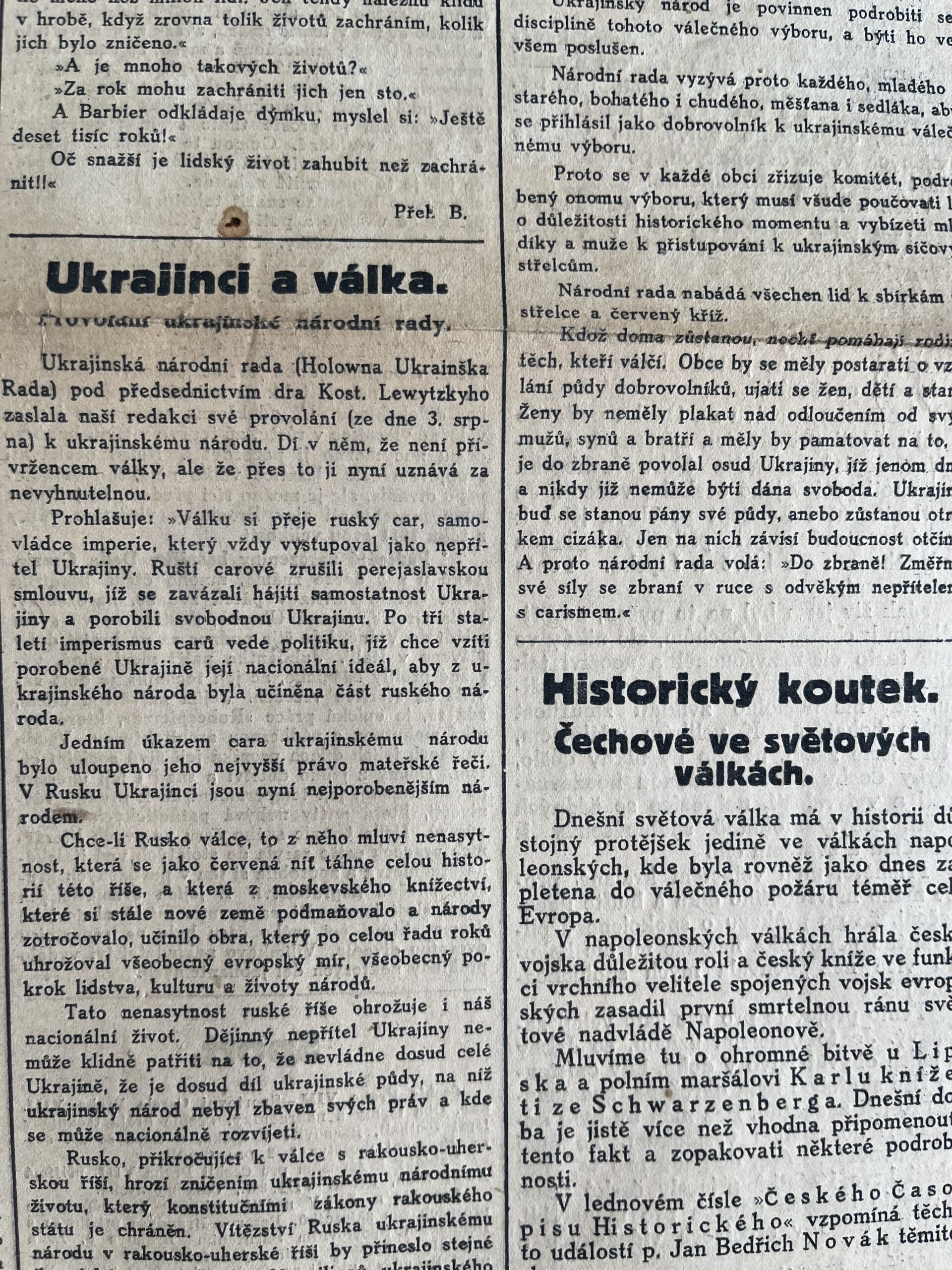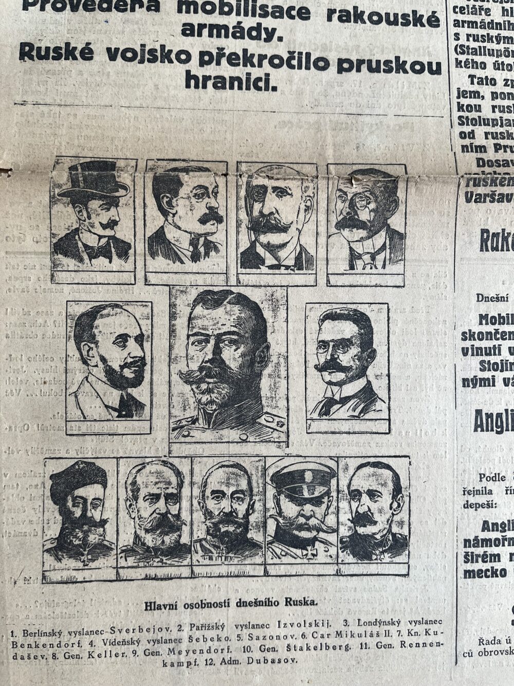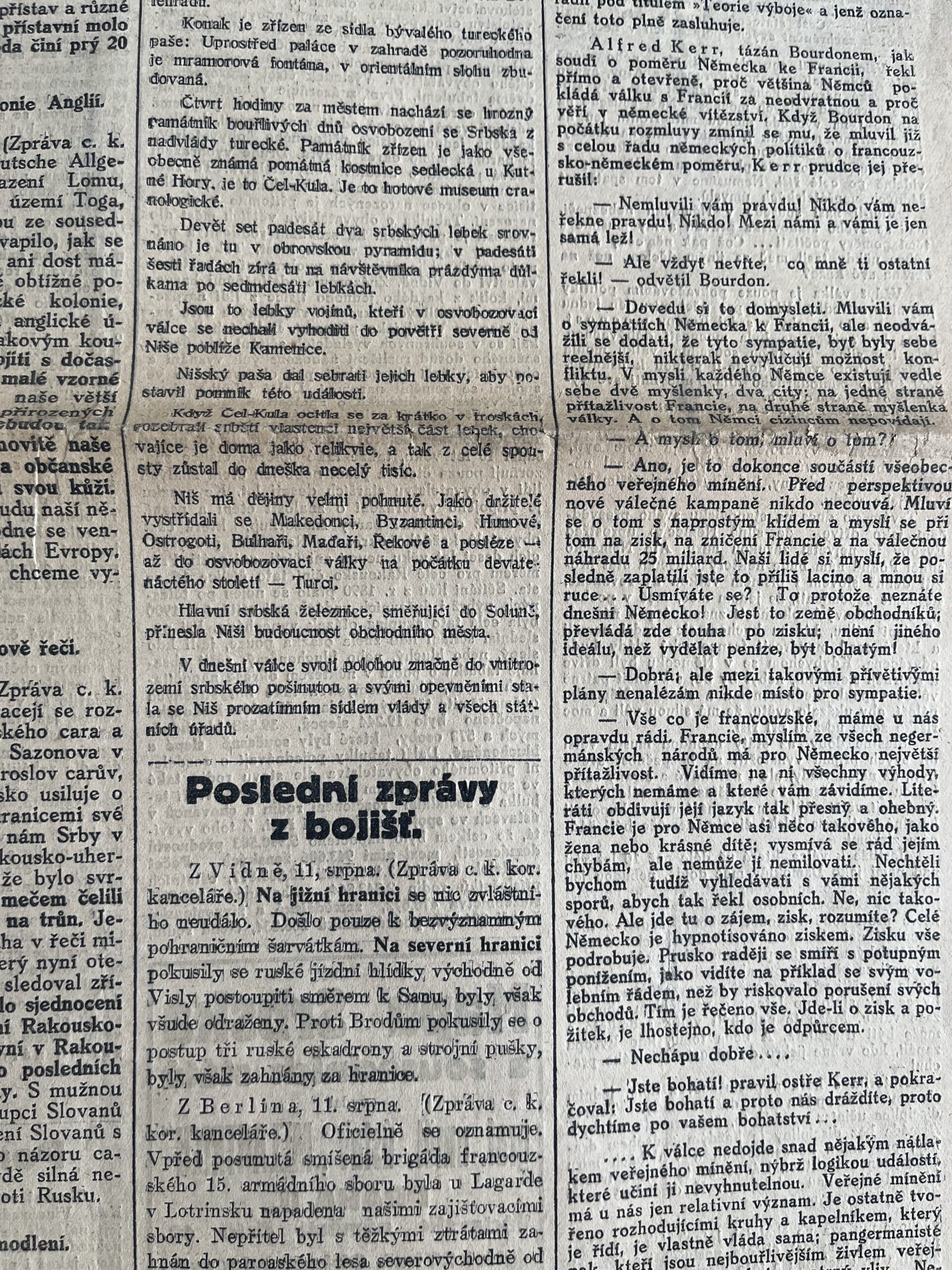 17 (K3-1) Rozměr jedné strany 28 x 39 cm. Válečné noviny Večerník,České Slovo z 11.,12.a 19.srpna 1914 3ks Noviny Večerník České Slovo ze dne 11.srpna 1914. Z obsahu novin: Válka. Italský tisk znovu zdůrazňuje neutralitu Itálie. Sestra srbského krále zatčena v Rakousku. Rozpor ve zprávách o dobytí Lutychu. Našim stoupencům!Pohřeb Jaurésův. 4 strany. České Slovo ze dne 12.srpna 1914. Z obsahu novin: Blokáda černohorského pobřeží. Fanatické pronásledování Němců v Belgii. Francie připravovala válku? V přehybech poškozeny. 8 stran. Noviny Večerník České Slovo ze dne 19.srpna 1914. Z obsahu novin: Před velikými válečnými událostmi. Provedená mobilisace rakouské armády. Ruské vojsko překročilo pruskou hranici. Ofensiva ruské armády? Hlavní osobnosti dnešního Ruska. Noviny v přehybu poškozené. 4 strany.