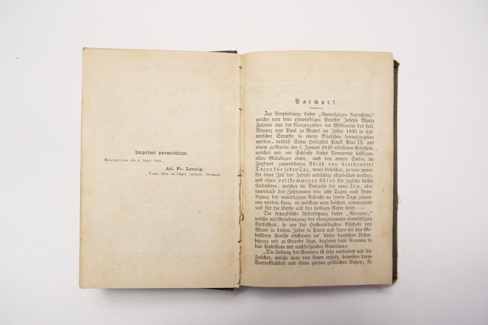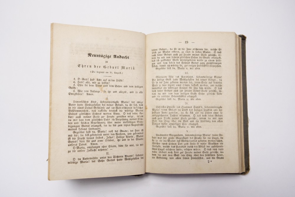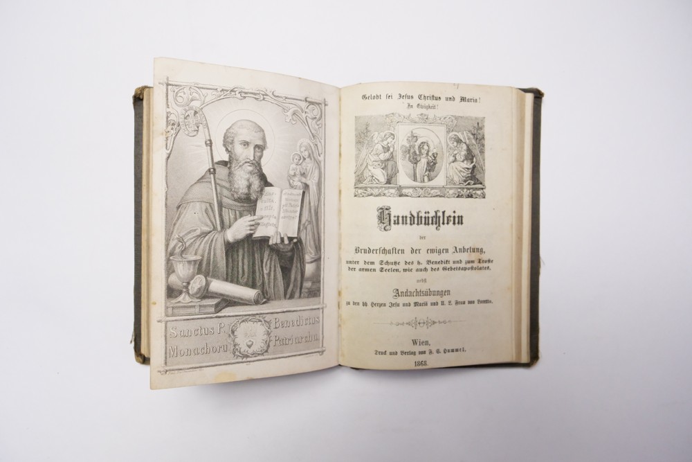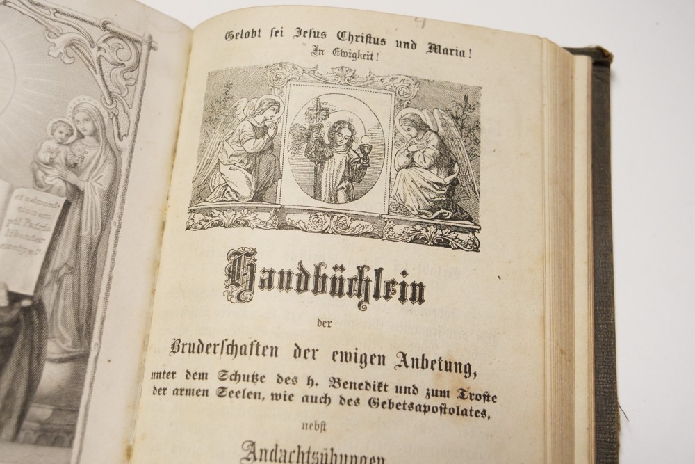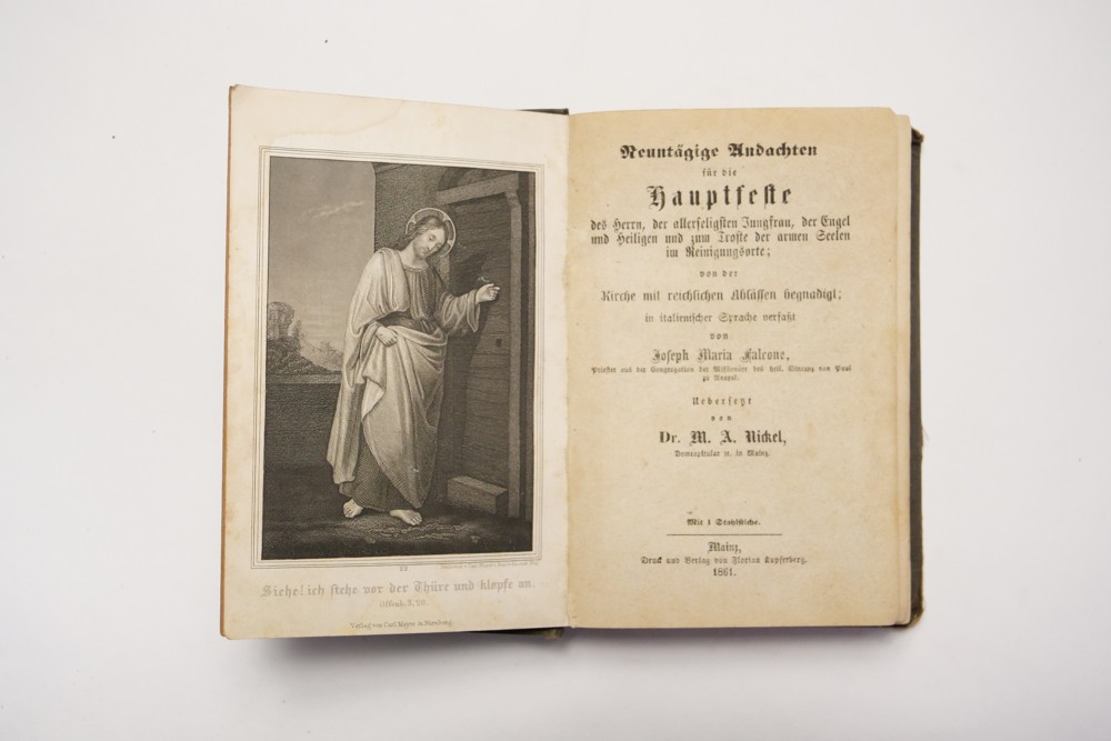 16 (ggm) 3x Kniha náboženského charakteru Vídeň, Mainz 1861/1868/1871 rytinové obrázky včetně věnování z roku 1871. Rozměr 15 x 11 cm, první část 183 stran r. 1861, druhá část 34 stran r.1871, třetí část 100 stran r.1868
