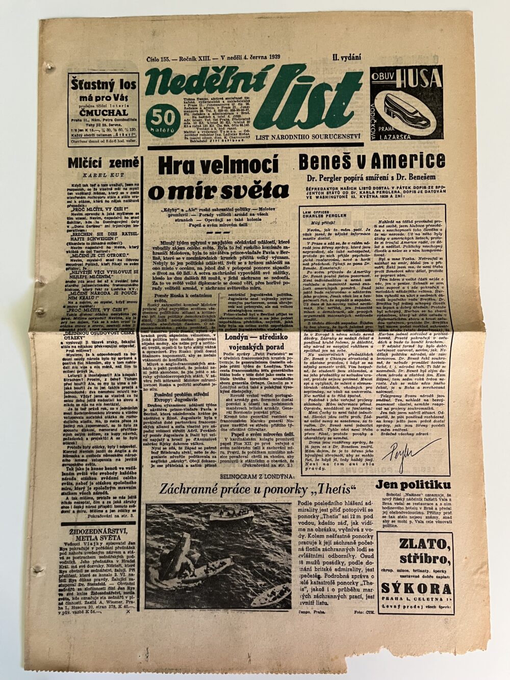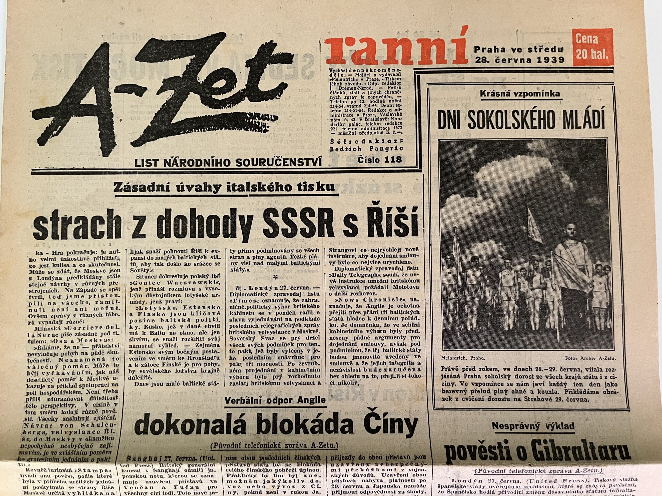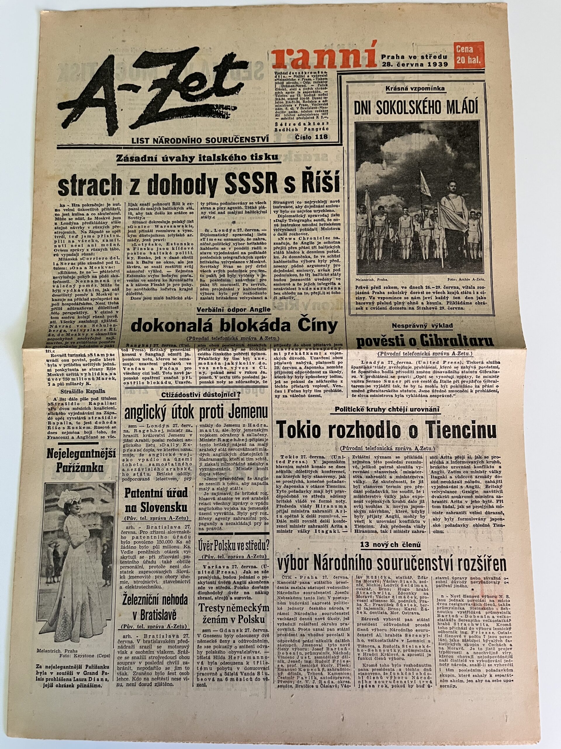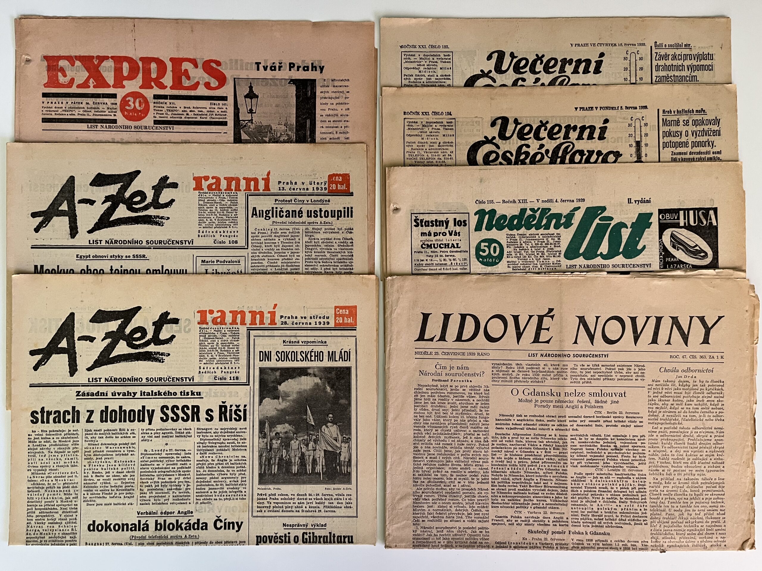 7 (K3-2) Lidové,Expres,A-Zet,Nedělní list,Večerní Čes.Slovo Rozměr 32 x 47 cm. Celek novin obsahuje Expres List národního souručenství 30.června 1939 – Zase dva požáry v Londýně. Dvě britské válečné lodi uzavřeny ve Fučau. Tvář Prahy. Tajnosti sklepení „Starého Hudsona“…ad. 1 list. A-Zet List národního souručenství 28.června 1939 – Zásadní úvahy italského tisku. Strach z dohody SSSR s Říší. Dni sokolského mládí. Dokonalá blokáda Číny. Pověsti o Gibraltaru…ad. 8 stran. A-Zet List národního souručenství 13.června 1939 – Moskva chce tajnou smlouvu. Německý kulturní týden. Angličané ustoupili. V Bělehradě návrat prince Pavla. Polský vyzvědač v Gdansku…ad.8 stran. Nedělní list List národního souručenství 4.června 1939 – Hra velmocí o mír světa. Beneš v Americe. Záchranné práce u ponorky „Thetis“…ad. 4 strany. Lidové noviny List národního souručenství 23.července – O Gdansku nelze smlouvat. Před dohodou s Charváty…ad. 12 stran. Večerní České Slovo List národního souručenství – Britská propaganda bouří Evropu. Alšův „Špalíček“ již zítra v rukou veřejnosti. K zákazu stávek a výluk na území Protektorátu. Stavební pozemky ve Velké Praze…ad. 6 stran. Večerní České Slovo List národního souručenství 5.června 1939 – Hlas významné výzvy. Cesta z bloudění. Chamberlainovo úsilí o dohodu. Vášeň v dostihové hře: od pětikoruny výš. Veřejné vyšetřování o ponorce Thetis…ad. 6 stran.