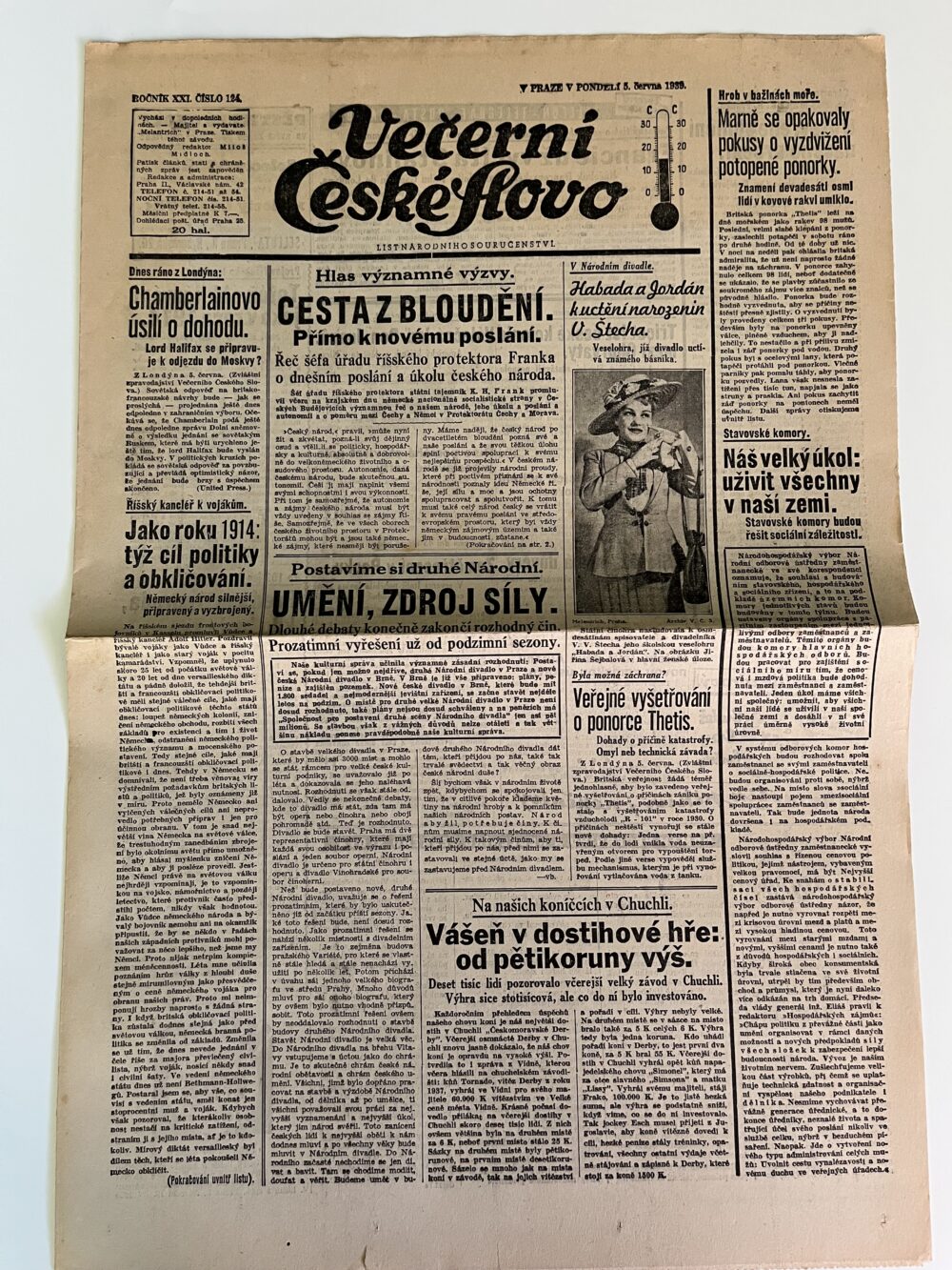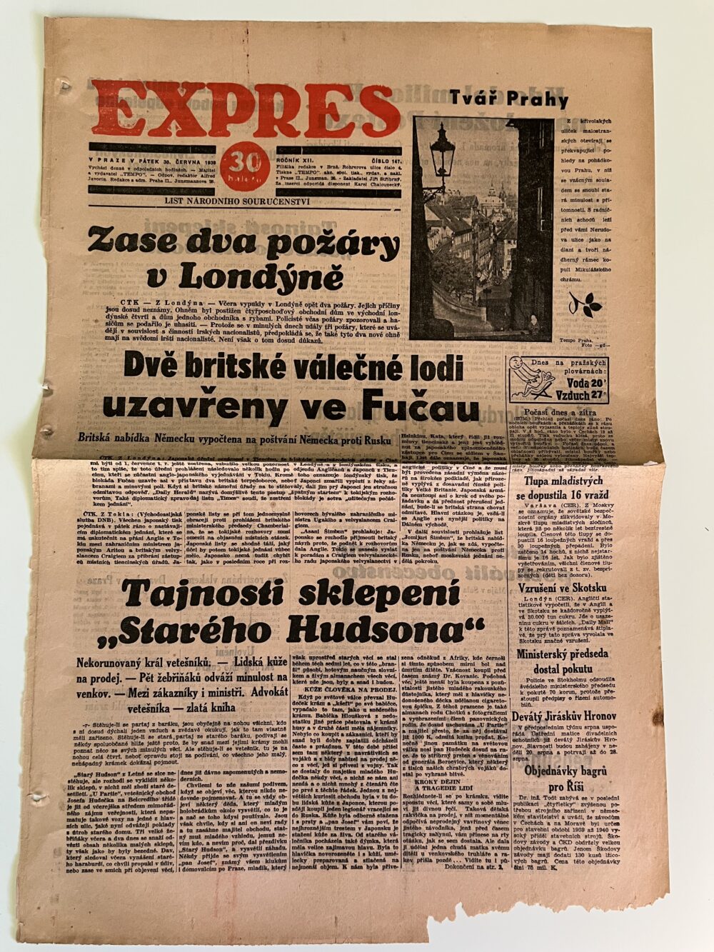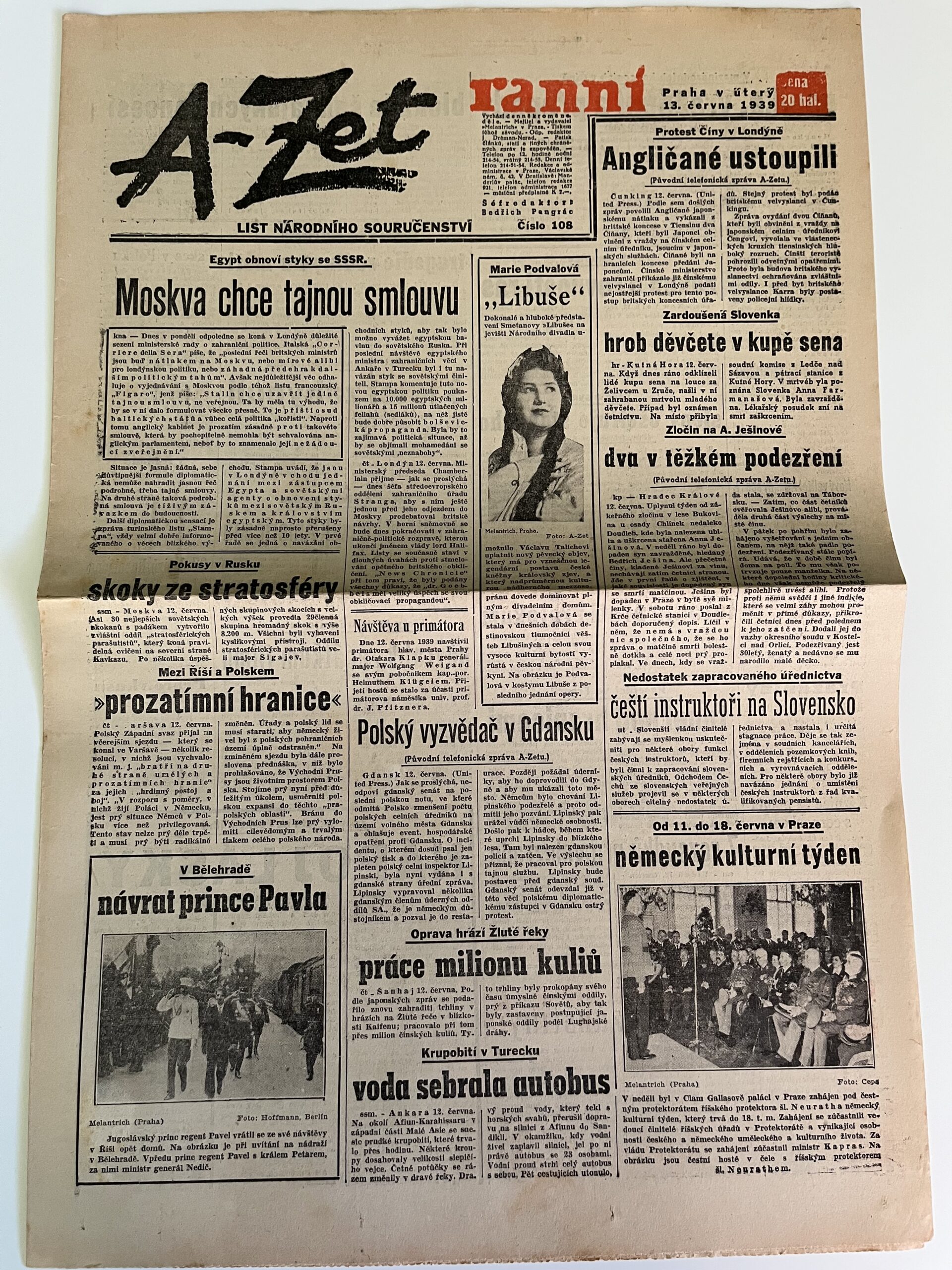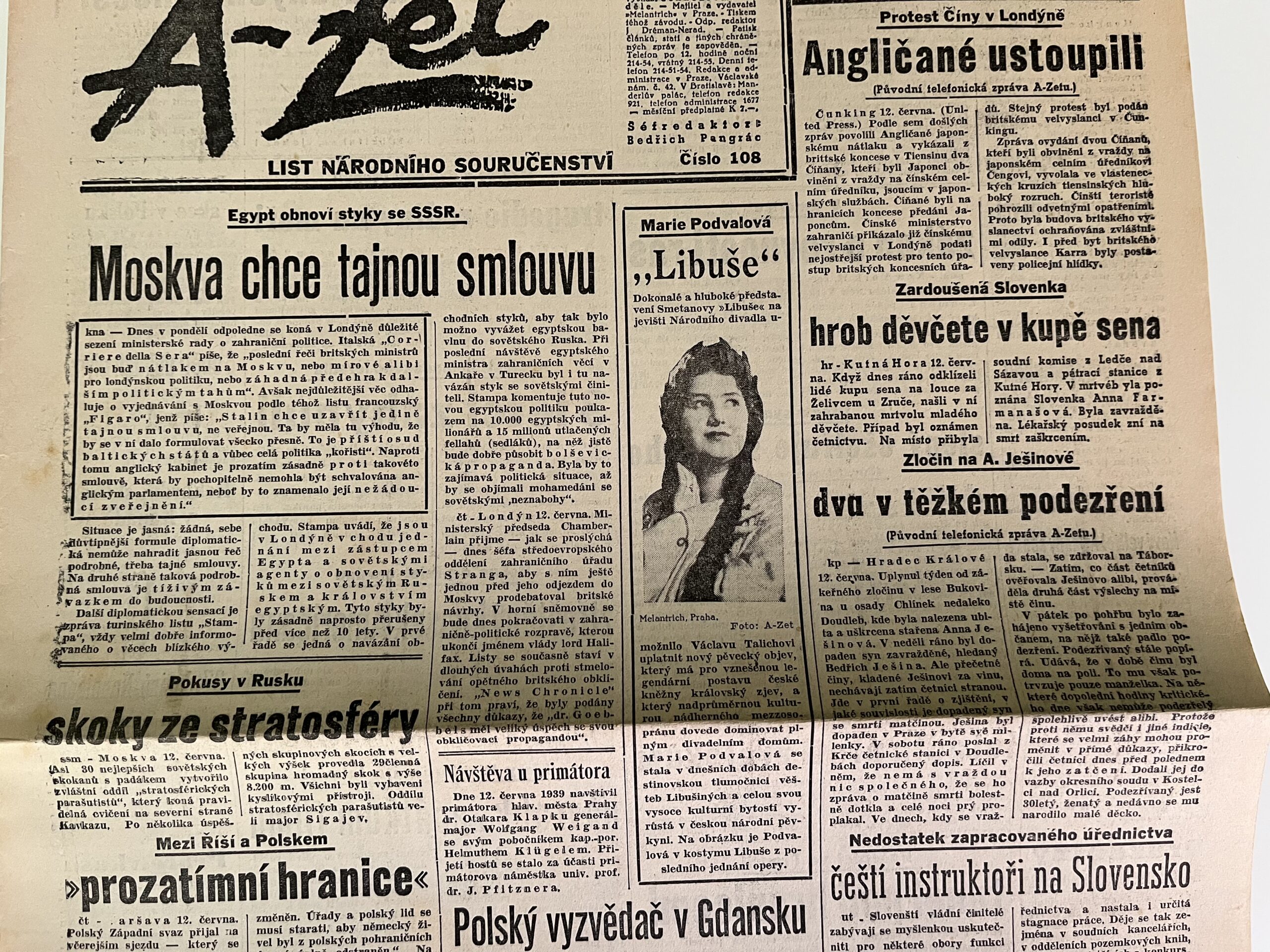 7 (K3-2) Lidové,Expres,A-Zet,Nedělní list,Večerní Čes.Slovo Rozměr 32 x 47 cm. Celek novin obsahuje Expres List národního souručenství 30.června 1939 – Zase dva požáry v Londýně. Dvě britské válečné lodi uzavřeny ve Fučau. Tvář Prahy. Tajnosti sklepení „Starého Hudsona“…ad. 1 list. A-Zet List národního souručenství 28.června 1939 – Zásadní úvahy italského tisku. Strach z dohody SSSR s Říší. Dni sokolského mládí. Dokonalá blokáda Číny. Pověsti o Gibraltaru…ad. 8 stran. A-Zet List národního souručenství 13.června 1939 – Moskva chce tajnou smlouvu. Německý kulturní týden. Angličané ustoupili. V Bělehradě návrat prince Pavla. Polský vyzvědač v Gdansku…ad.8 stran. Nedělní list List národního souručenství 4.června 1939 – Hra velmocí o mír světa. Beneš v Americe. Záchranné práce u ponorky „Thetis“…ad. 4 strany. Lidové noviny List národního souručenství 23.července – O Gdansku nelze smlouvat. Před dohodou s Charváty…ad. 12 stran. Večerní České Slovo List národního souručenství – Britská propaganda bouří Evropu. Alšův „Špalíček“ již zítra v rukou veřejnosti. K zákazu stávek a výluk na území Protektorátu. Stavební pozemky ve Velké Praze…ad. 6 stran. Večerní České Slovo List národního souručenství 5.června 1939 – Hlas významné výzvy. Cesta z bloudění. Chamberlainovo úsilí o dohodu. Vášeň v dostihové hře: od pětikoruny výš. Veřejné vyšetřování o ponorce Thetis…ad. 6 stran.