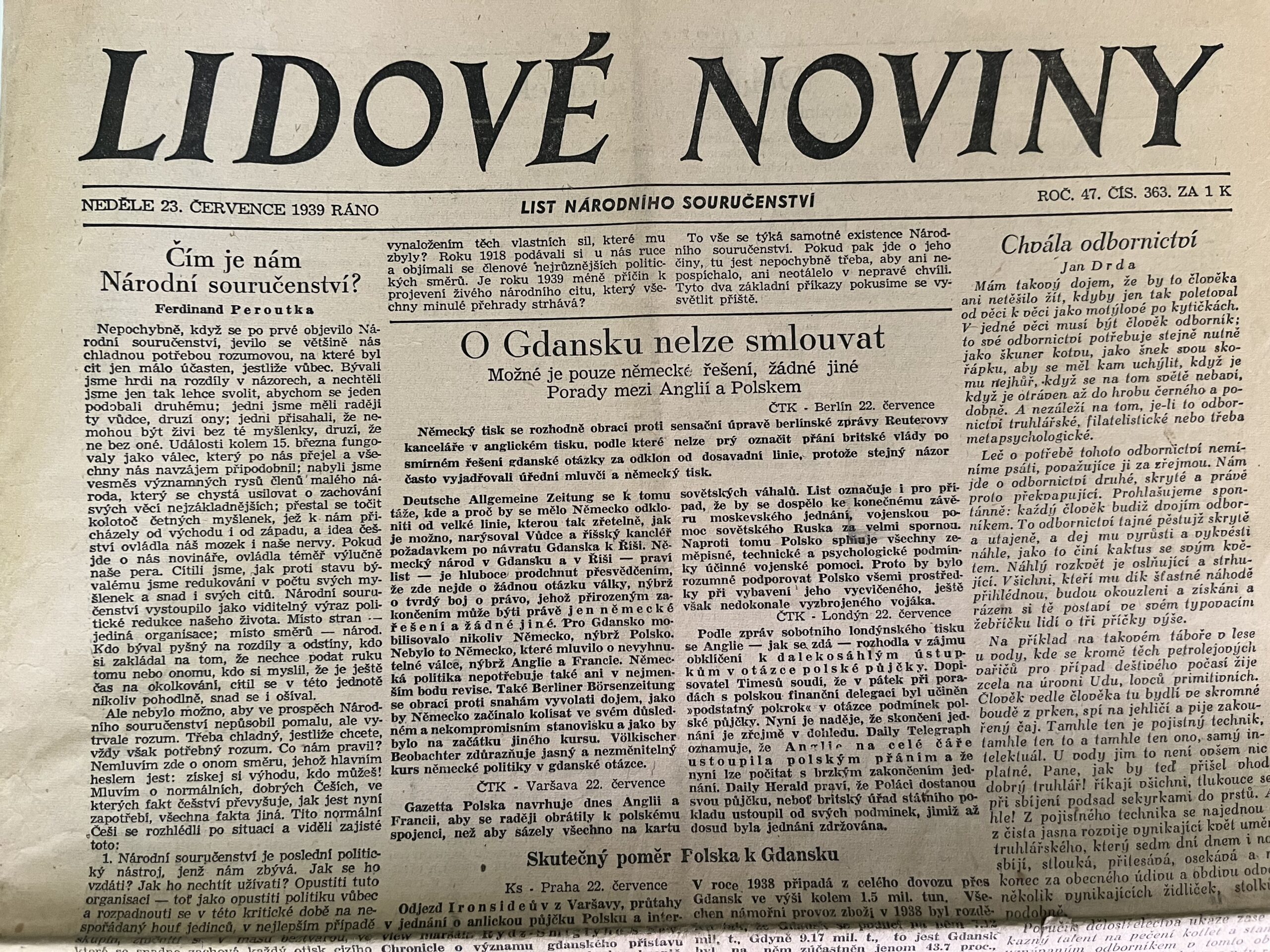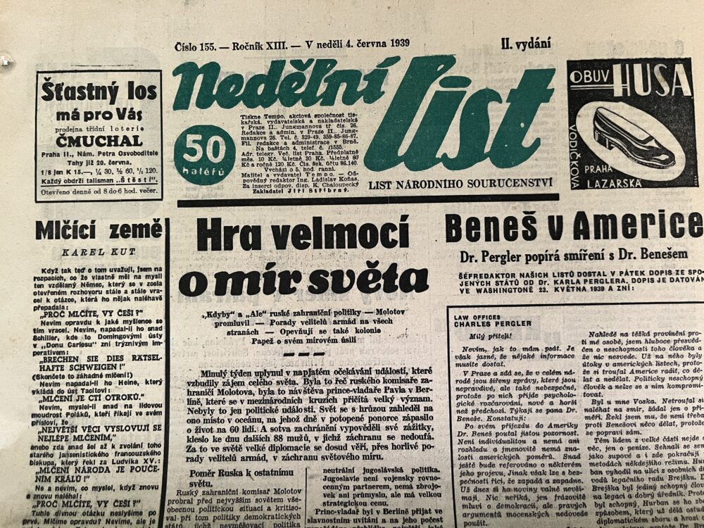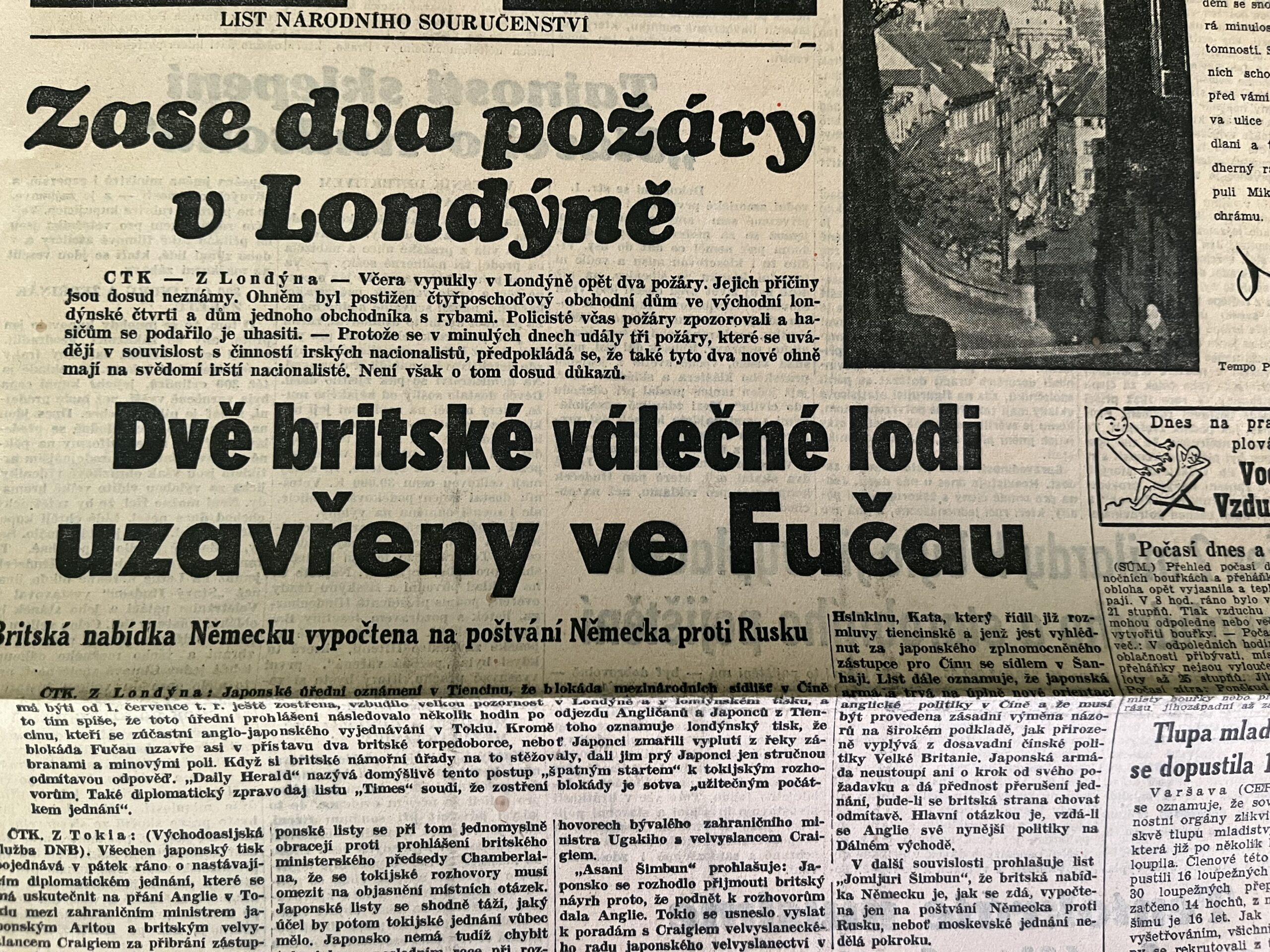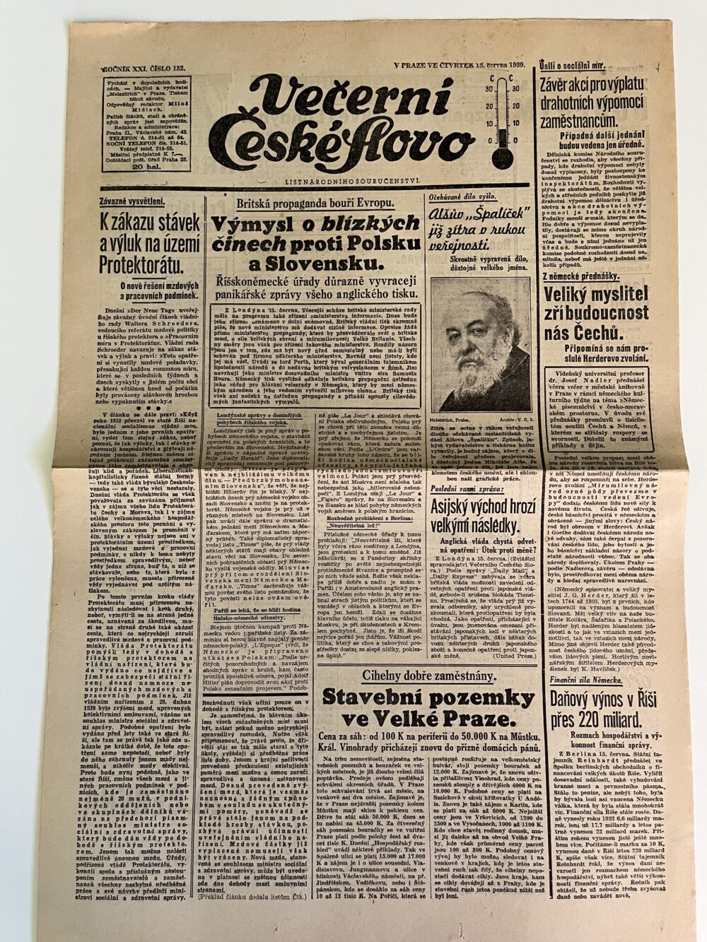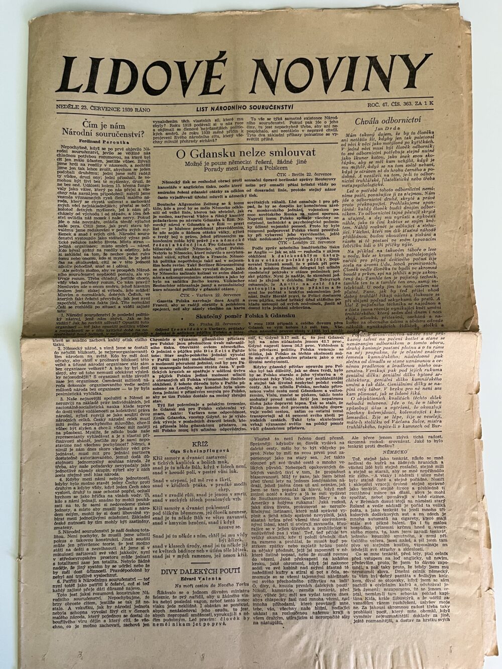 7 (K3-2) Lidové,Expres,A-Zet,Nedělní list,Večerní Čes.Slovo Rozměr 32 x 47 cm. Celek novin obsahuje Expres List národního souručenství 30.června 1939 – Zase dva požáry v Londýně. Dvě britské válečné lodi uzavřeny ve Fučau. Tvář Prahy. Tajnosti sklepení „Starého Hudsona“…ad. 1 list. A-Zet List národního souručenství 28.června 1939 – Zásadní úvahy italského tisku. Strach z dohody SSSR s Říší. Dni sokolského mládí. Dokonalá blokáda Číny. Pověsti o Gibraltaru…ad. 8 stran. A-Zet List národního souručenství 13.června 1939 – Moskva chce tajnou smlouvu. Německý kulturní týden. Angličané ustoupili. V Bělehradě návrat prince Pavla. Polský vyzvědač v Gdansku…ad.8 stran. Nedělní list List národního souručenství 4.června 1939 – Hra velmocí o mír světa. Beneš v Americe. Záchranné práce u ponorky „Thetis“…ad. 4 strany. Lidové noviny List národního souručenství 23.července – O Gdansku nelze smlouvat. Před dohodou s Charváty…ad. 12 stran. Večerní České Slovo List národního souručenství – Britská propaganda bouří Evropu. Alšův „Špalíček“ již zítra v rukou veřejnosti. K zákazu stávek a výluk na území Protektorátu. Stavební pozemky ve Velké Praze…ad. 6 stran. Večerní České Slovo List národního souručenství 5.června 1939 – Hlas významné výzvy. Cesta z bloudění. Chamberlainovo úsilí o dohodu. Vášeň v dostihové hře: od pětikoruny výš. Veřejné vyšetřování o ponorce Thetis…ad. 6 stran.