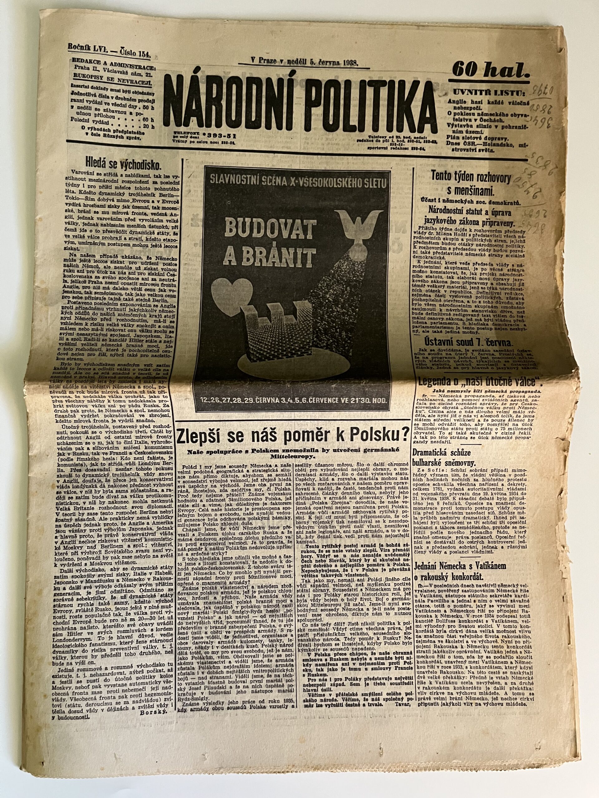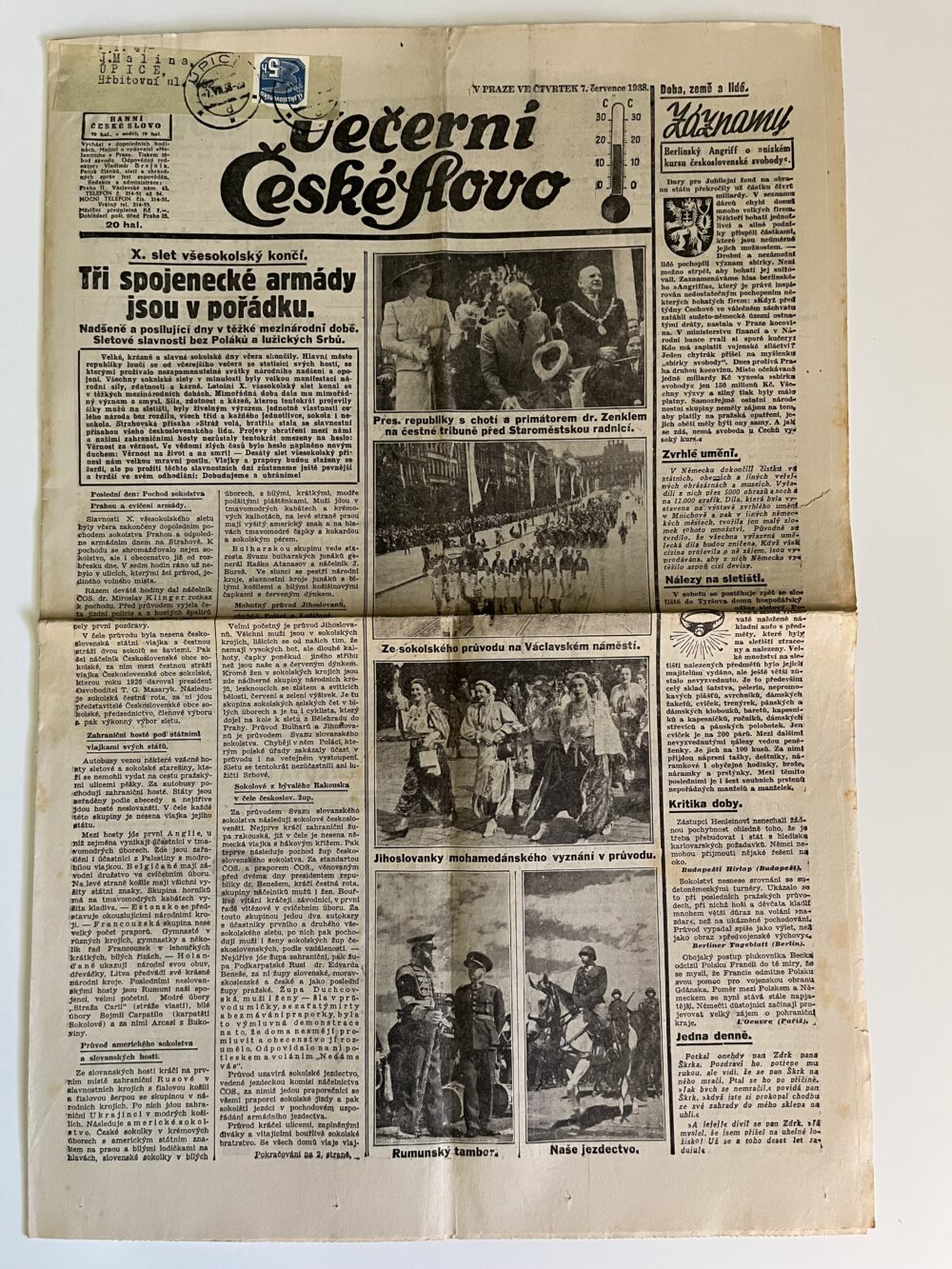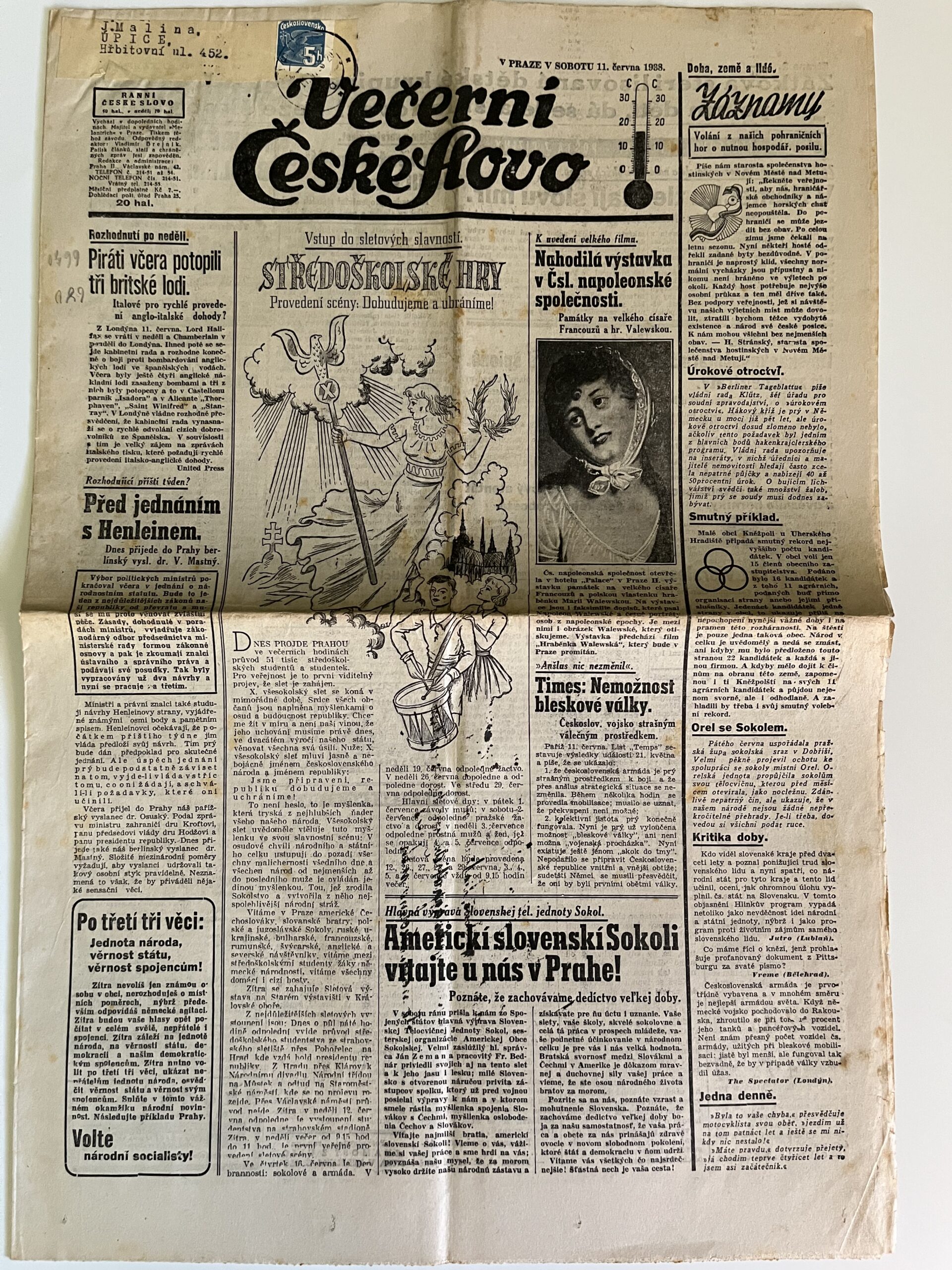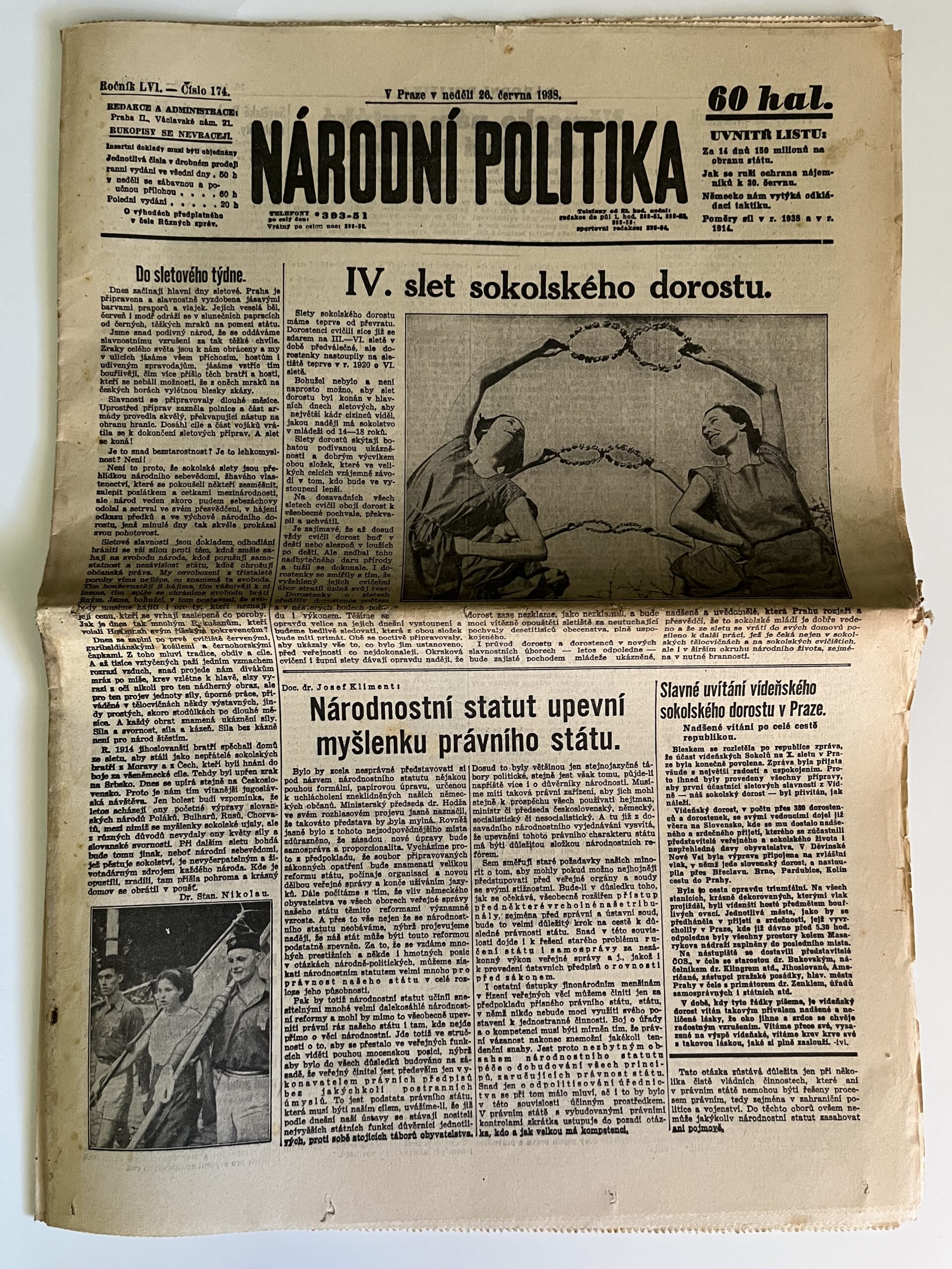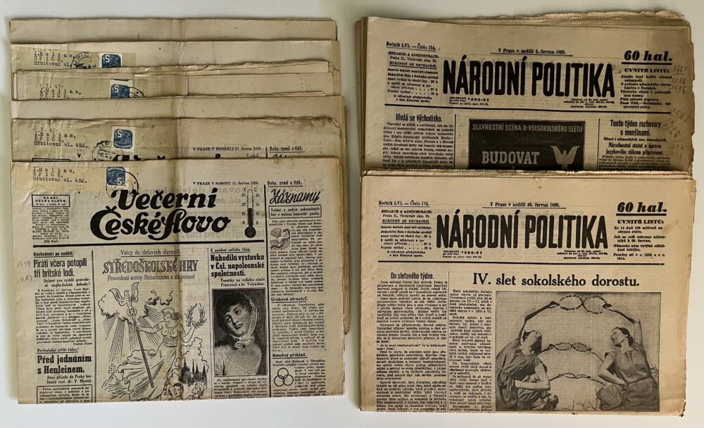 10 (K3-2) Zbrojení, údálosti před protektorátem, ap. Rozměr 32 x 47 cm. Celek obsahuje Národní politika 26.června 1938 – IV.slet sokolského dorostu. Do sletového týdne. Národní statut upevní myšlenku právního státu. Slavné uvítání vídeňského sokolského dorostu v Praze…ad. 16 stran + Nedělní zábavná a poučná příloha Národní politiky 16 stran. Národní politika 5.června 1938 – Budovat a bránit – Slavnostní scéna X-Všesokolského sletu. Zlepší se náš poměr k Polsku? Jednání Německa s Vatikánem o rakouský konkordát…ad. 16 stran. + Nedělní zábavná a poučná příloha Národní politiky 16 stran. Večerní České Slovo 11.června 1938 – Vstup do sletových slavností. Piráti potopili tři britské lodi. K uvedení filmu: Nahodilá výstavka v Čsl. napoleonské společnoti. Times: Nemožnost bleskové války…ad. 8 stran. Večerní České Slovo 27.června 1938 – Marxistická nákaza mezi úderníky. Slet dorostu-vstup do vrcholných dnů desátého sletu. Německá opevnění na Alandech…ad. 6 stran. Večerní České Slovo 6.května 1938 – Čím a jak překážíme panu Henleinovi? V. Británie v naší věci zakročí v Berlíně. Obrovská bitevní scéna v Neapolském zálivu…ad. 8 stran. Večerní České Slovo 4.června 1938 – Aby ruce všech byly zdravé a silné. Marl. Diettrichová odmítla půsebení v Německu. Údaje o pohybech vojska k našim hranicím…ad. 8 stran. Večerní České Slovo 28.května 1938 – Národ prokázal vůli žít a být svobodný. Panu presidentovi dr. Edv. Beneši v těžké době vděk k narozeninám…ad. 8 stran. Večerní České Slovo 7.července 1938 – X. slet všesokolský končí. Naše jezdectvo. Rumunský tambor. Kritika doby…ad. 6 stran. Některé noviny v přehybu poškozeny.