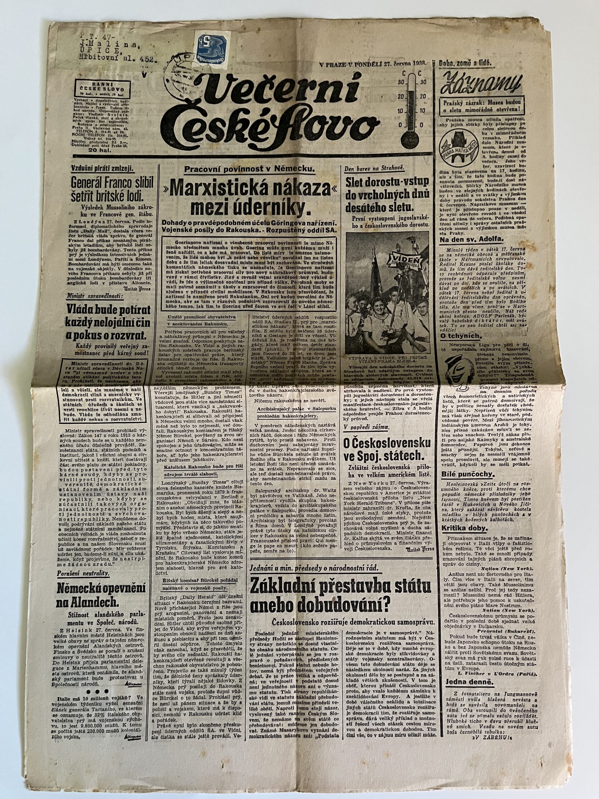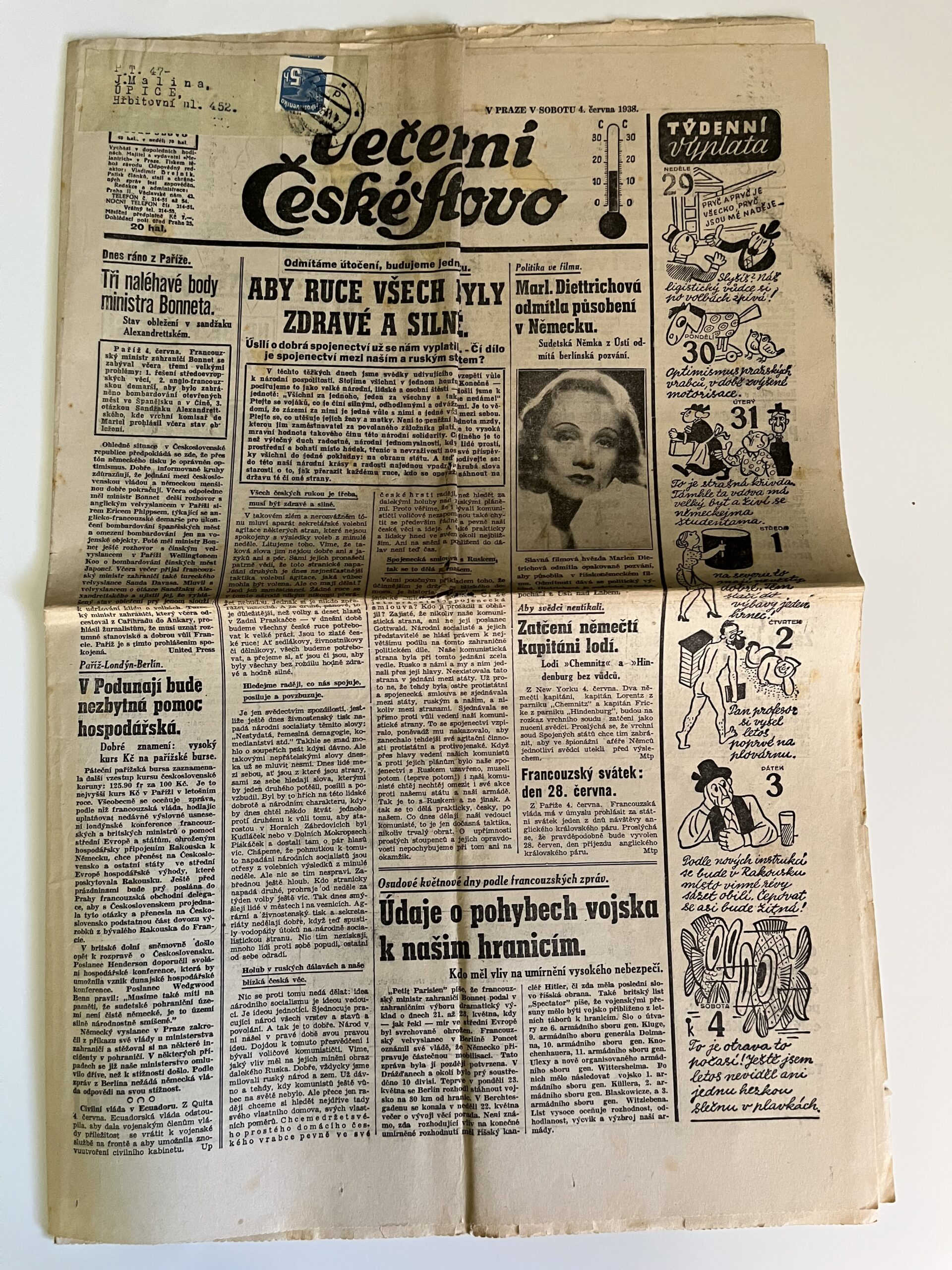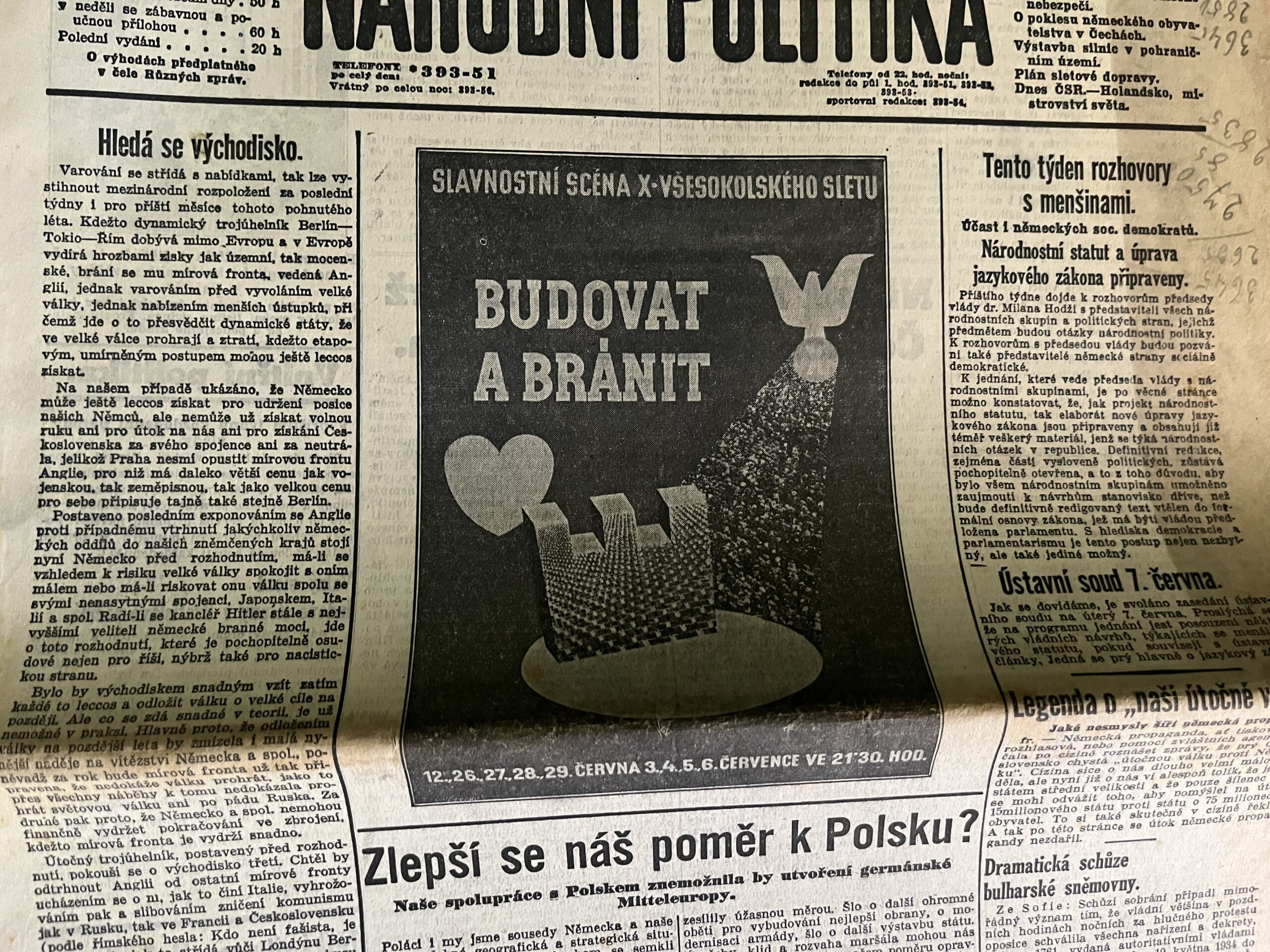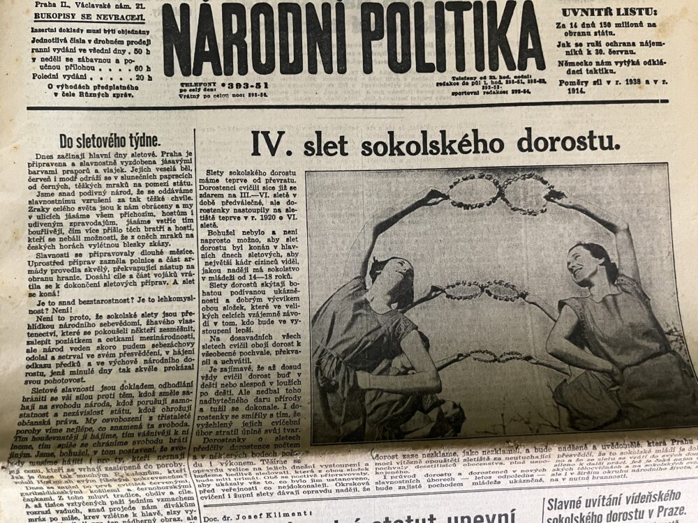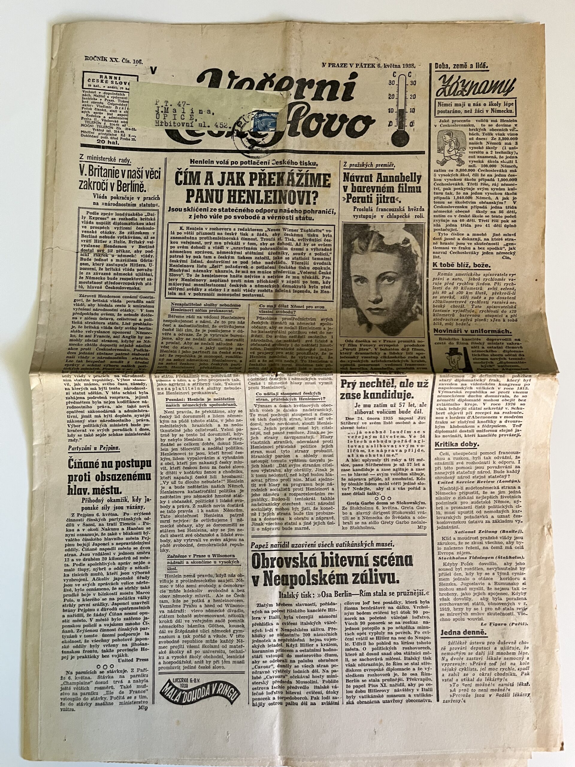 10 (K3-2) Zbrojení, údálosti před protektorátem, ap. Rozměr 32 x 47 cm. Celek obsahuje Národní politika 26.června 1938 – IV.slet sokolského dorostu. Do sletového týdne. Národní statut upevní myšlenku právního státu. Slavné uvítání vídeňského sokolského dorostu v Praze…ad. 16 stran + Nedělní zábavná a poučná příloha Národní politiky 16 stran. Národní politika 5.června 1938 – Budovat a bránit – Slavnostní scéna X-Všesokolského sletu. Zlepší se náš poměr k Polsku? Jednání Německa s Vatikánem o rakouský konkordát…ad. 16 stran. + Nedělní zábavná a poučná příloha Národní politiky 16 stran. Večerní České Slovo 11.června 1938 – Vstup do sletových slavností. Piráti potopili tři britské lodi. K uvedení filmu: Nahodilá výstavka v Čsl. napoleonské společnoti. Times: Nemožnost bleskové války…ad. 8 stran. Večerní České Slovo 27.června 1938 – Marxistická nákaza mezi úderníky. Slet dorostu-vstup do vrcholných dnů desátého sletu. Německá opevnění na Alandech…ad. 6 stran. Večerní České Slovo 6.května 1938 – Čím a jak překážíme panu Henleinovi? V. Británie v naší věci zakročí v Berlíně. Obrovská bitevní scéna v Neapolském zálivu…ad. 8 stran. Večerní České Slovo 4.června 1938 – Aby ruce všech byly zdravé a silné. Marl. Diettrichová odmítla půsebení v Německu. Údaje o pohybech vojska k našim hranicím…ad. 8 stran. Večerní České Slovo 28.května 1938 – Národ prokázal vůli žít a být svobodný. Panu presidentovi dr. Edv. Beneši v těžké době vděk k narozeninám…ad. 8 stran. Večerní České Slovo 7.července 1938 – X. slet všesokolský končí. Naše jezdectvo. Rumunský tambor. Kritika doby…ad. 6 stran. Některé noviny v přehybu poškozeny.