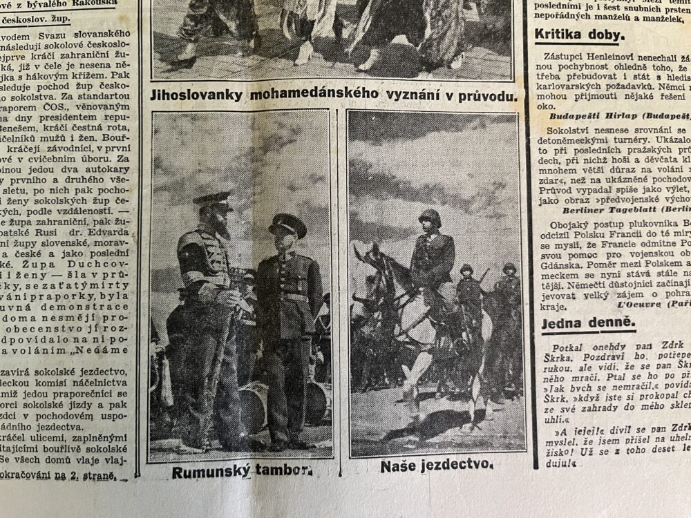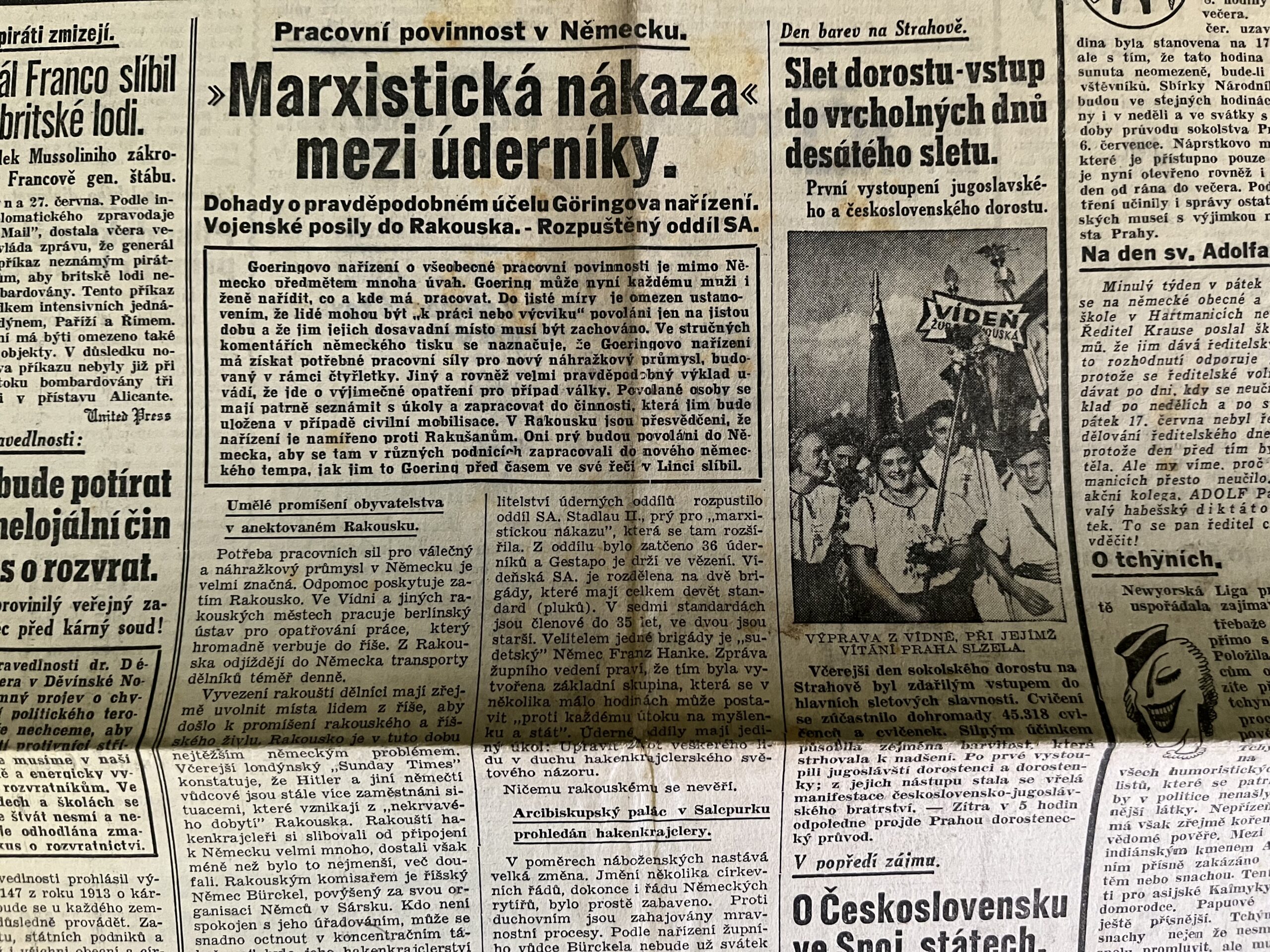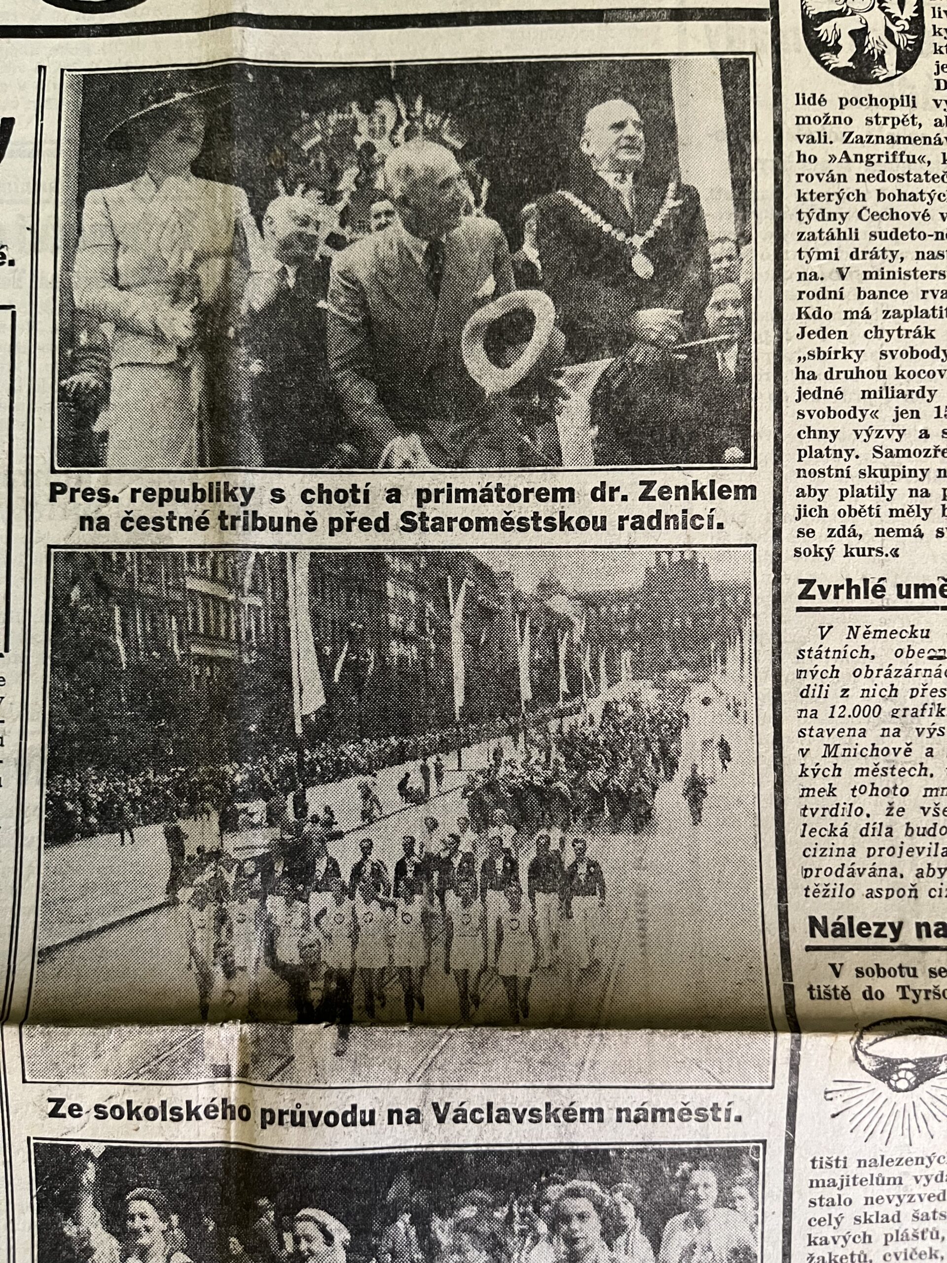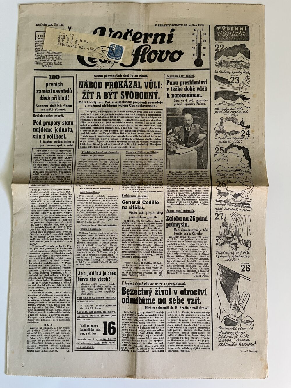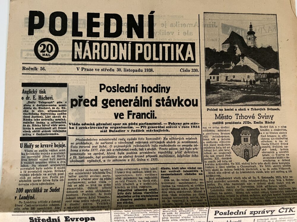 10 (K3-2) Zbrojení, údálosti před protektorátem, ap. Rozměr 32 x 47 cm. Celek obsahuje Národní politika 26.června 1938 – IV.slet sokolského dorostu. Do sletového týdne. Národní statut upevní myšlenku právního státu. Slavné uvítání vídeňského sokolského dorostu v Praze…ad. 16 stran + Nedělní zábavná a poučná příloha Národní politiky 16 stran. Národní politika 5.června 1938 – Budovat a bránit – Slavnostní scéna X-Všesokolského sletu. Zlepší se náš poměr k Polsku? Jednání Německa s Vatikánem o rakouský konkordát…ad. 16 stran. + Nedělní zábavná a poučná příloha Národní politiky 16 stran. Večerní České Slovo 11.června 1938 – Vstup do sletových slavností. Piráti potopili tři britské lodi. K uvedení filmu: Nahodilá výstavka v Čsl. napoleonské společnoti. Times: Nemožnost bleskové války…ad. 8 stran. Večerní České Slovo 27.června 1938 – Marxistická nákaza mezi úderníky. Slet dorostu-vstup do vrcholných dnů desátého sletu. Německá opevnění na Alandech…ad. 6 stran. Večerní České Slovo 6.května 1938 – Čím a jak překážíme panu Henleinovi? V. Británie v naší věci zakročí v Berlíně. Obrovská bitevní scéna v Neapolském zálivu…ad. 8 stran. Večerní České Slovo 4.června 1938 – Aby ruce všech byly zdravé a silné. Marl. Diettrichová odmítla půsebení v Německu. Údaje o pohybech vojska k našim hranicím…ad. 8 stran. Večerní České Slovo 28.května 1938 – Národ prokázal vůli žít a být svobodný. Panu presidentovi dr. Edv. Beneši v těžké době vděk k narozeninám…ad. 8 stran. Večerní České Slovo 7.července 1938 – X. slet všesokolský končí. Naše jezdectvo. Rumunský tambor. Kritika doby…ad. 6 stran. Některé noviny v přehybu poškozeny.