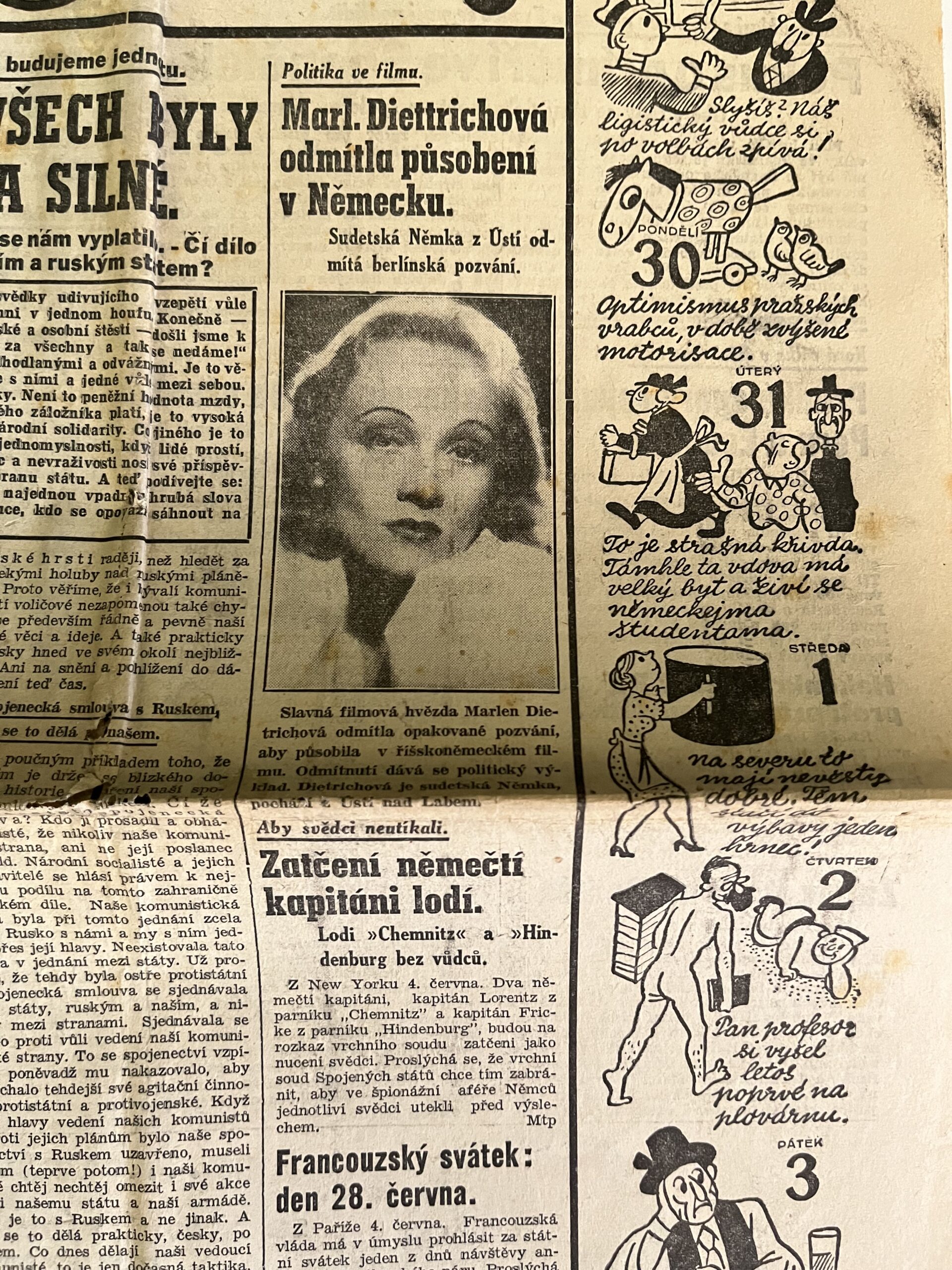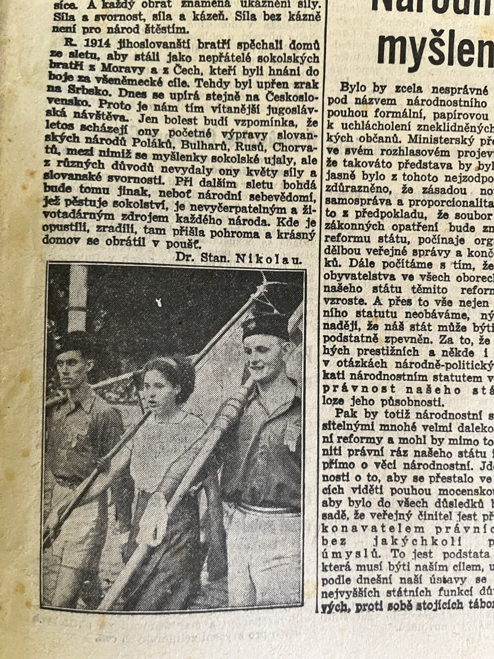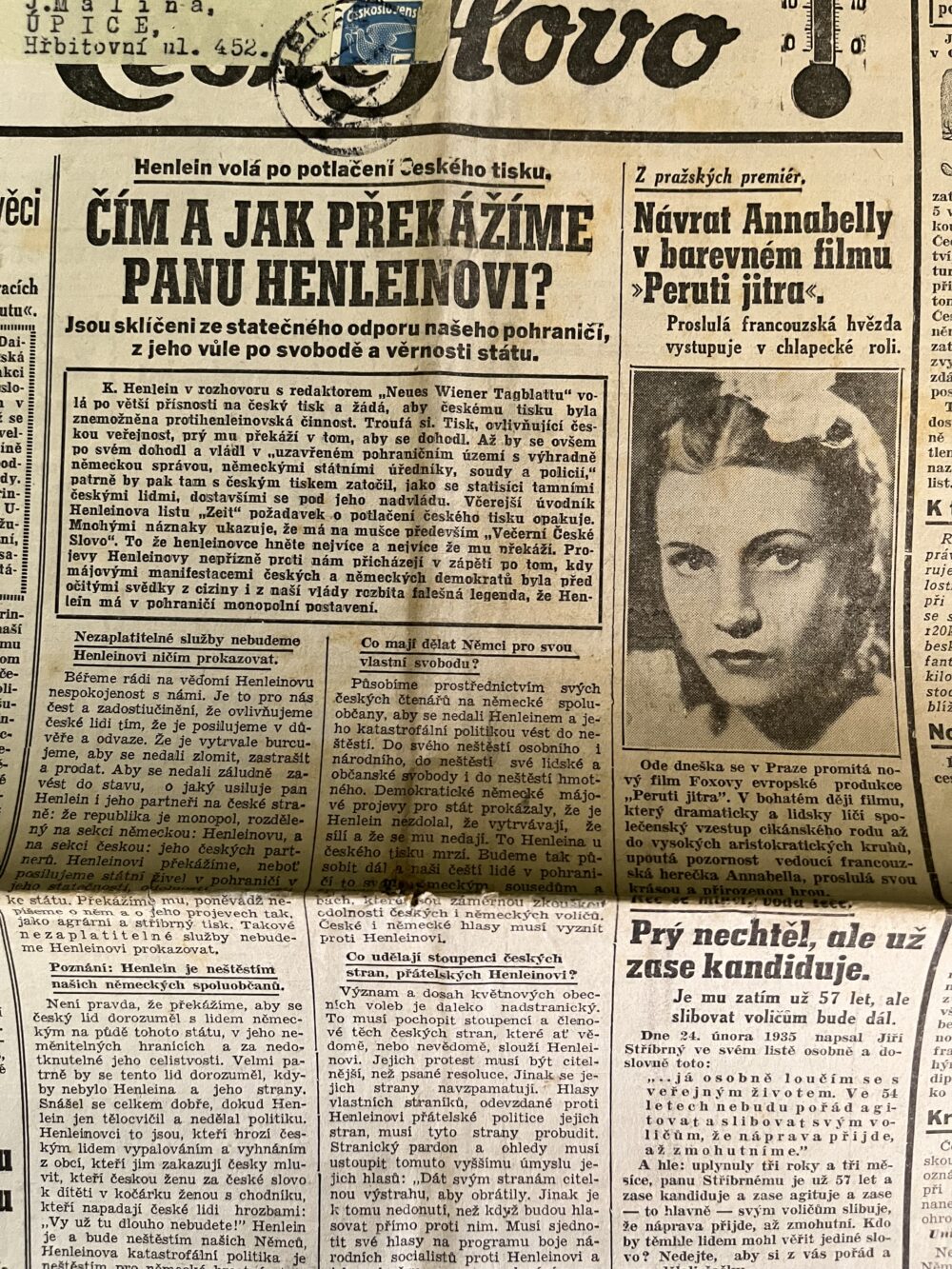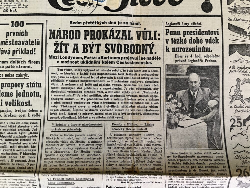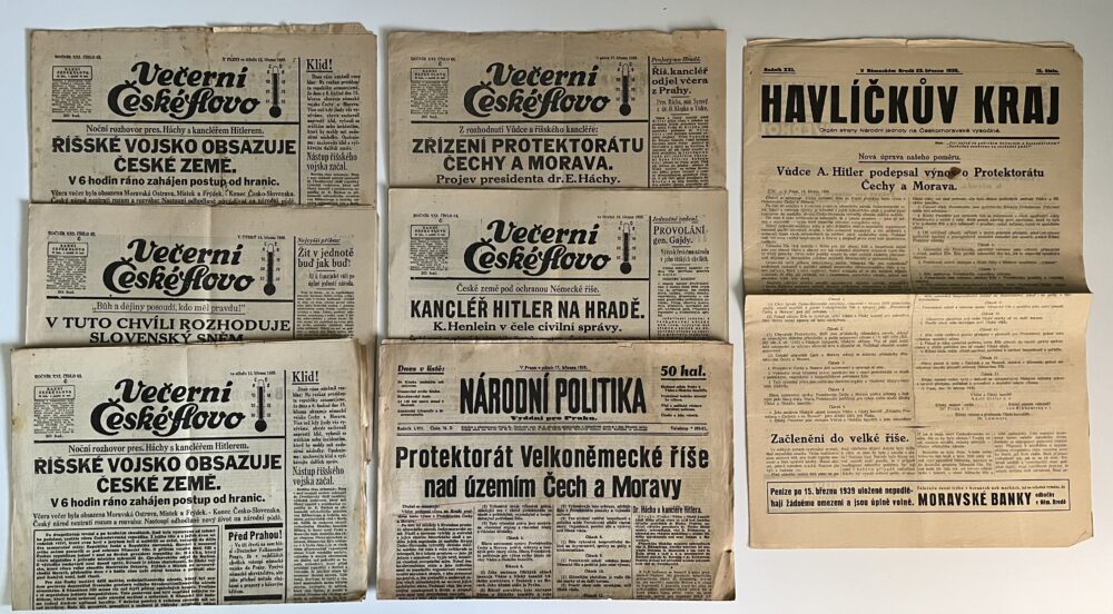 10 (K3-2) Zbrojení, údálosti před protektorátem, ap. Rozměr 32 x 47 cm. Celek obsahuje Národní politika 26.června 1938 – IV.slet sokolského dorostu. Do sletového týdne. Národní statut upevní myšlenku právního státu. Slavné uvítání vídeňského sokolského dorostu v Praze…ad. 16 stran + Nedělní zábavná a poučná příloha Národní politiky 16 stran. Národní politika 5.června 1938 – Budovat a bránit – Slavnostní scéna X-Všesokolského sletu. Zlepší se náš poměr k Polsku? Jednání Německa s Vatikánem o rakouský konkordát…ad. 16 stran. + Nedělní zábavná a poučná příloha Národní politiky 16 stran. Večerní České Slovo 11.června 1938 – Vstup do sletových slavností. Piráti potopili tři britské lodi. K uvedení filmu: Nahodilá výstavka v Čsl. napoleonské společnoti. Times: Nemožnost bleskové války…ad. 8 stran. Večerní České Slovo 27.června 1938 – Marxistická nákaza mezi úderníky. Slet dorostu-vstup do vrcholných dnů desátého sletu. Německá opevnění na Alandech…ad. 6 stran. Večerní České Slovo 6.května 1938 – Čím a jak překážíme panu Henleinovi? V. Británie v naší věci zakročí v Berlíně. Obrovská bitevní scéna v Neapolském zálivu…ad. 8 stran. Večerní České Slovo 4.června 1938 – Aby ruce všech byly zdravé a silné. Marl. Diettrichová odmítla půsebení v Německu. Údaje o pohybech vojska k našim hranicím…ad. 8 stran. Večerní České Slovo 28.května 1938 – Národ prokázal vůli žít a být svobodný. Panu presidentovi dr. Edv. Beneši v těžké době vděk k narozeninám…ad. 8 stran. Večerní České Slovo 7.července 1938 – X. slet všesokolský končí. Naše jezdectvo. Rumunský tambor. Kritika doby…ad. 6 stran. Některé noviny v přehybu poškozeny.