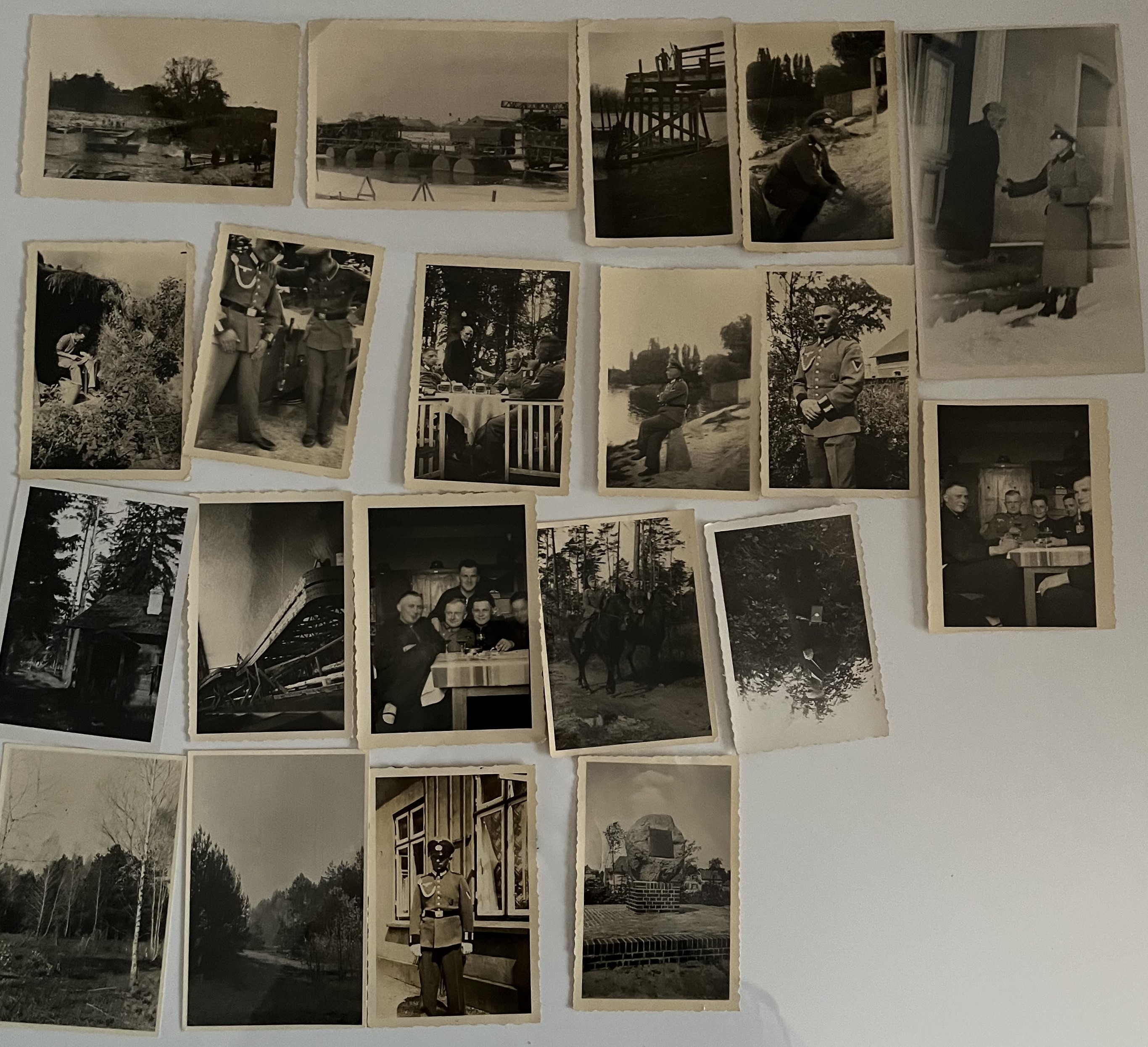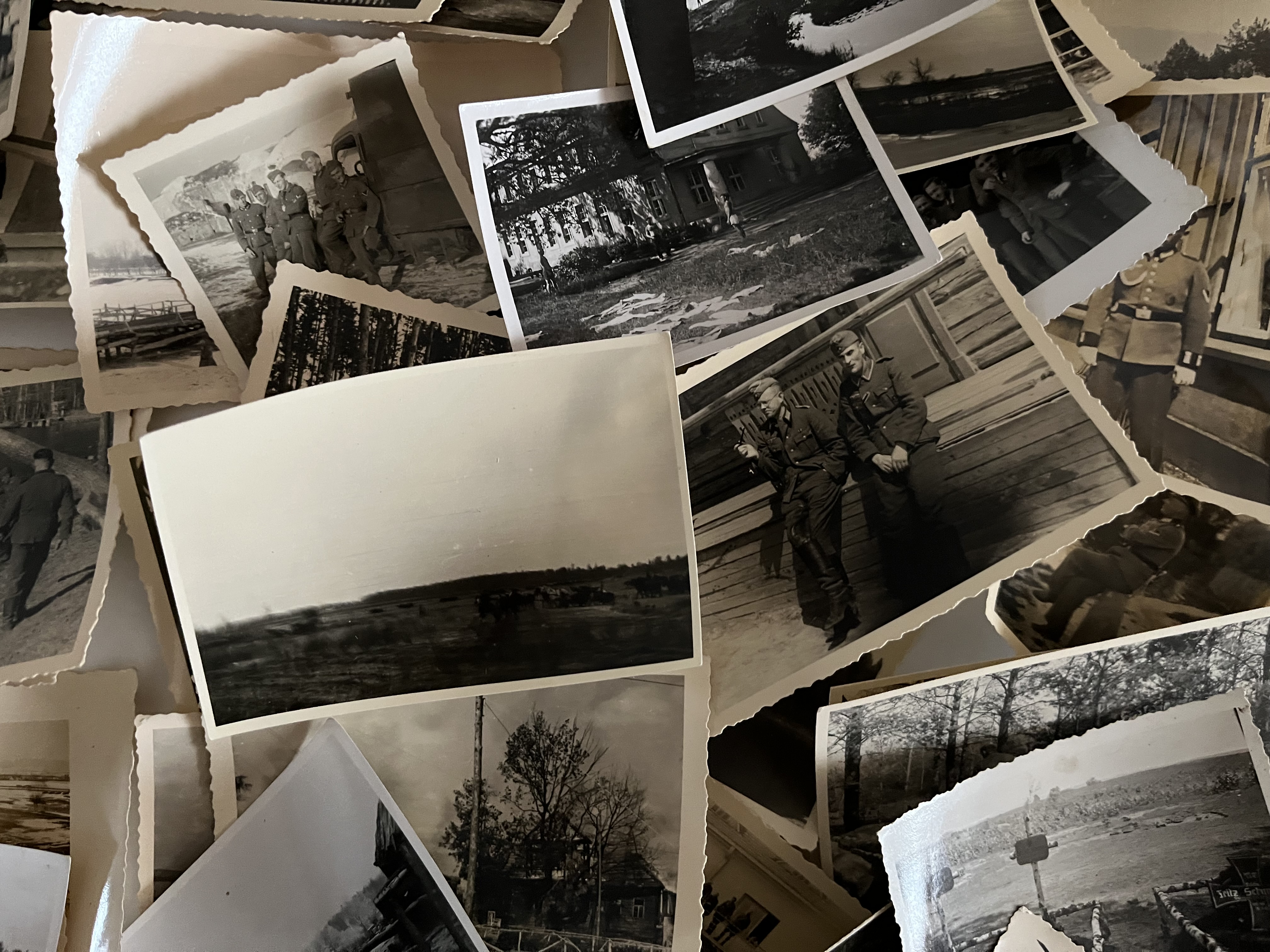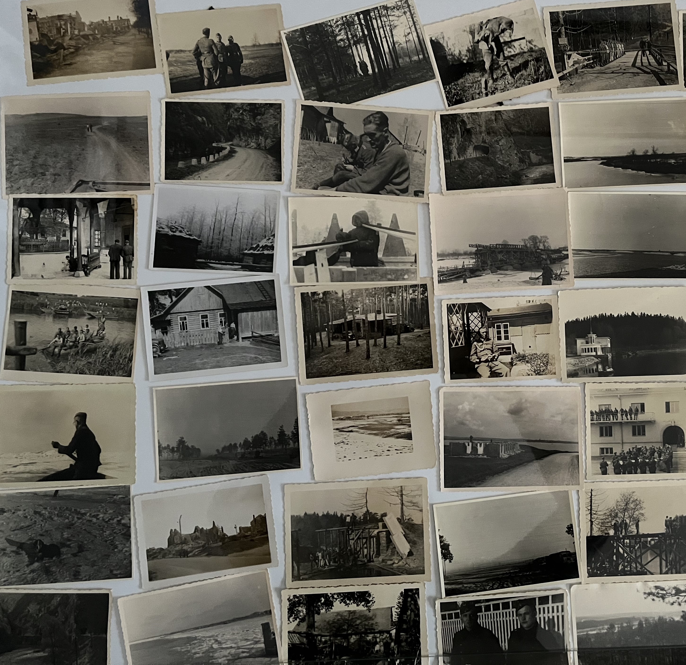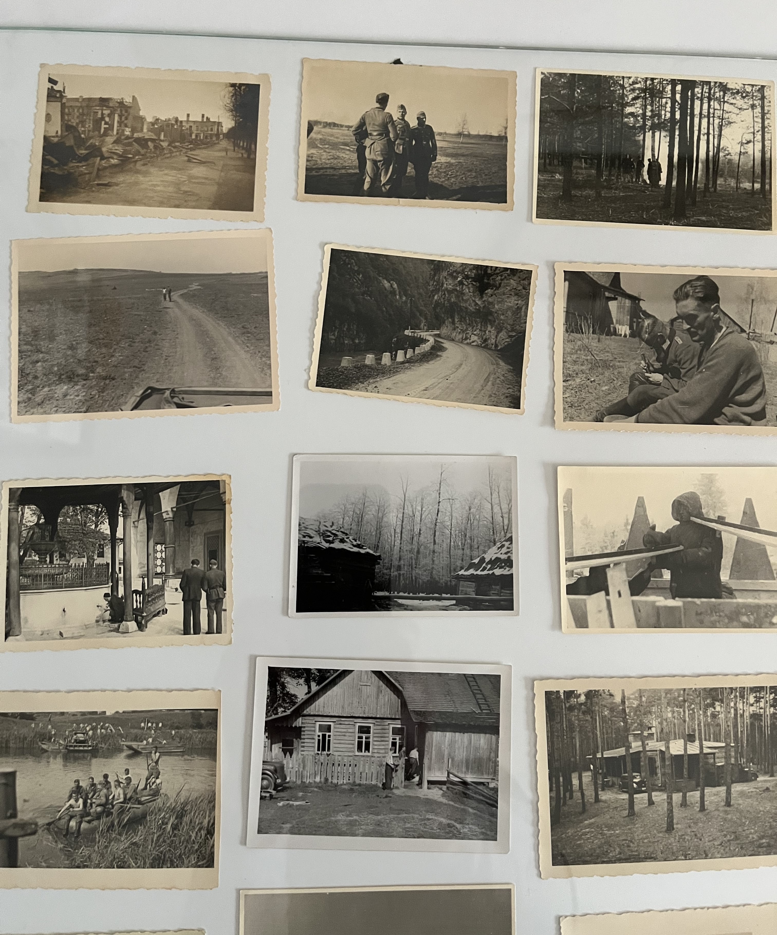 26 (K3-3) Z běžného života a bojů ve válečné Evropě r.1938-1945. Vojenská technika, život na frontě, mapování postupu. Fotografie mají různé formáty, nejmenší 3 x 4 cm, největší 13 x 18 cm. Rozměr kufříku 22,5 x 19 cm, v. 6 cm, obsahuje 144 ks menších formátu. Album rozměr 32 x 24 cm. V albumu jsou fota nalepená, místy archy poškozeny odlepením fotografií. Fotografií v albumu 256 ks. Fotografie civilní i vojenské z fronty, okupované oblasti….Fotografie např. Přelom roku 1941/1942. Německé divadlo Lille Tannhäuser. Z dovolené Kassel, Německo, září 1941.Brusel – Radnice. Velký trh. Mnichov. Prázdniny květen 1942. Graz, Štýrský Hradec. Antverpy. Vojáci s rodinou. V terénu. aj. Kromě domácí fronty obsahuje i řadu kvalitních a dokumentačních záběrů z bojiště a života na frontě německých vojáků včetně civilistů. Některé fotografie obsahují popisky na druhé straně. Zajímavý dokumentační materiál. Vojenská technika, výstroj, výzbroj, bajonety, helmy, zvířata na frontě.