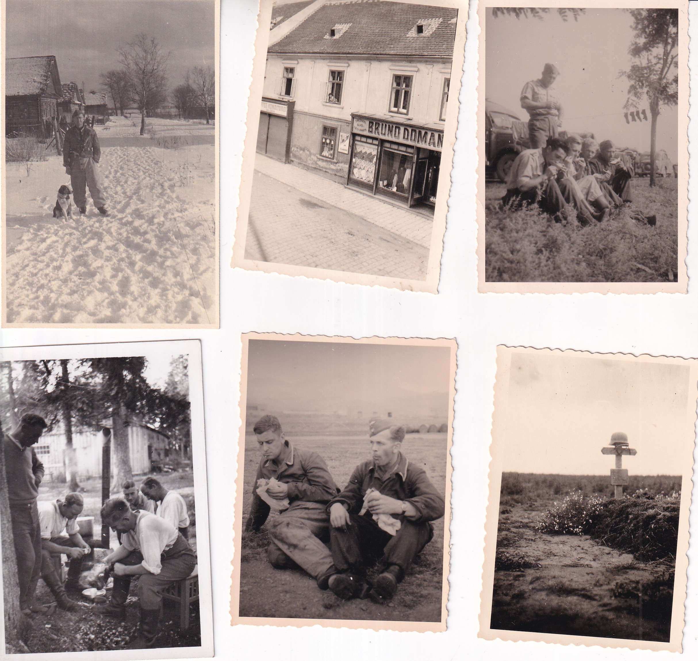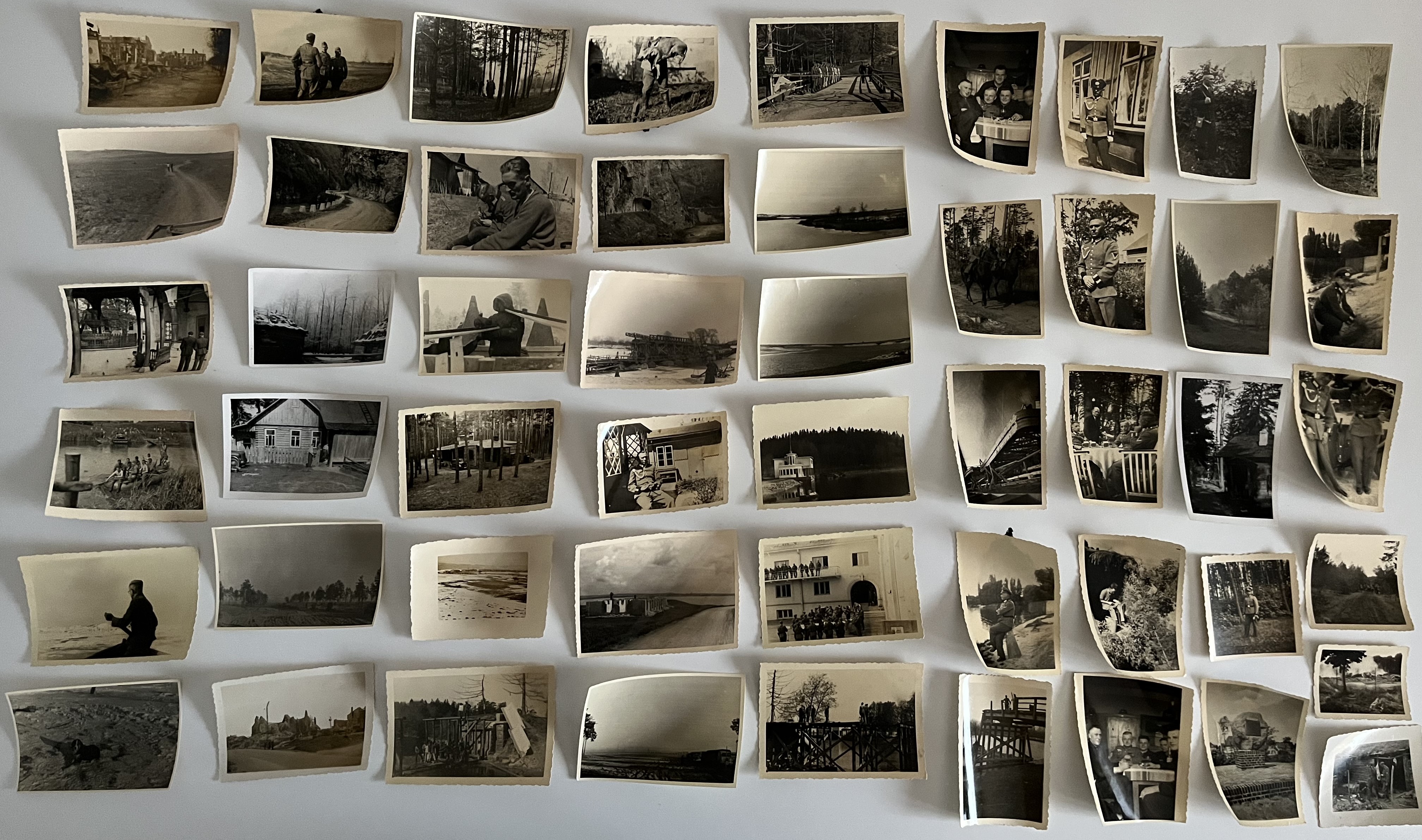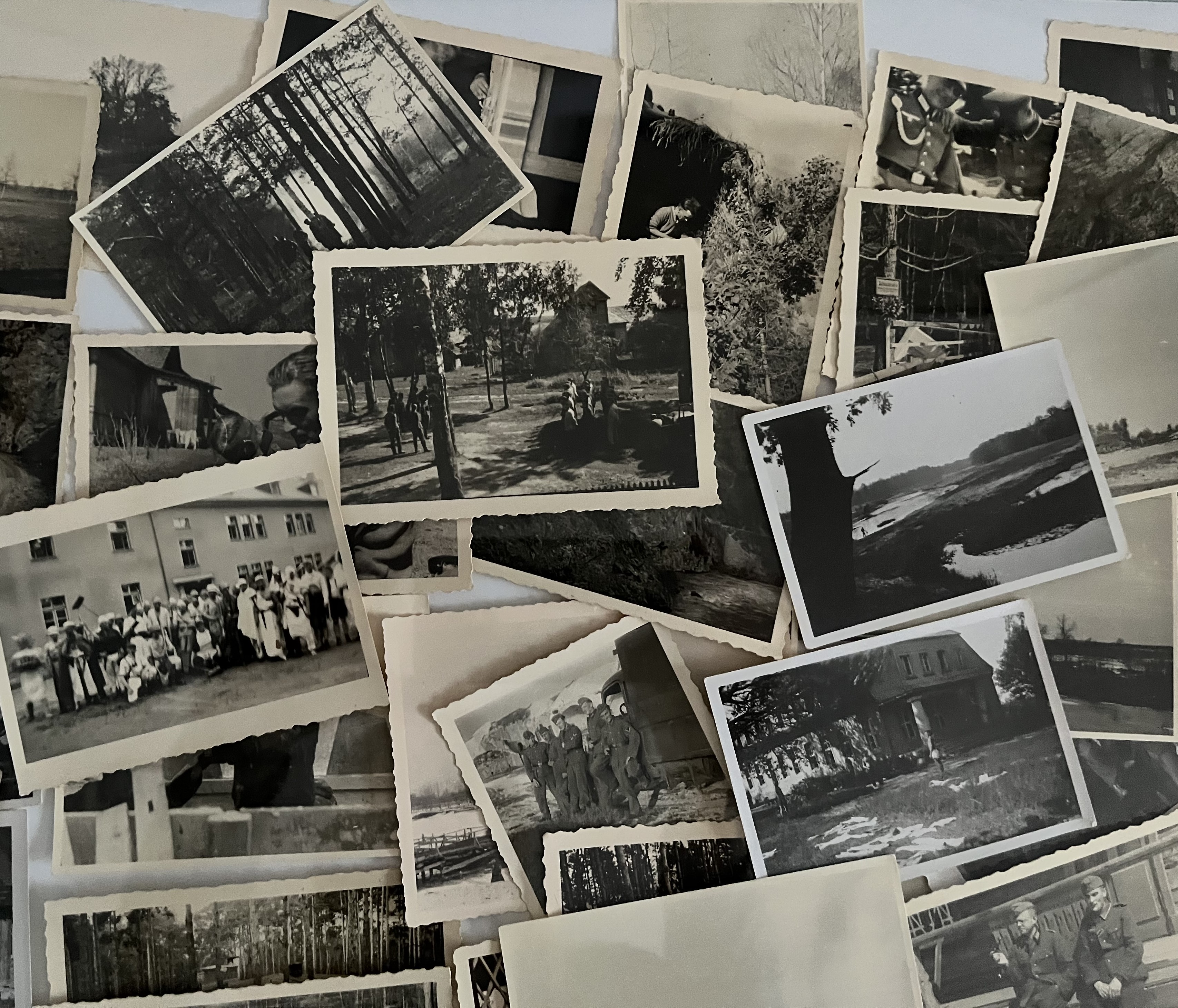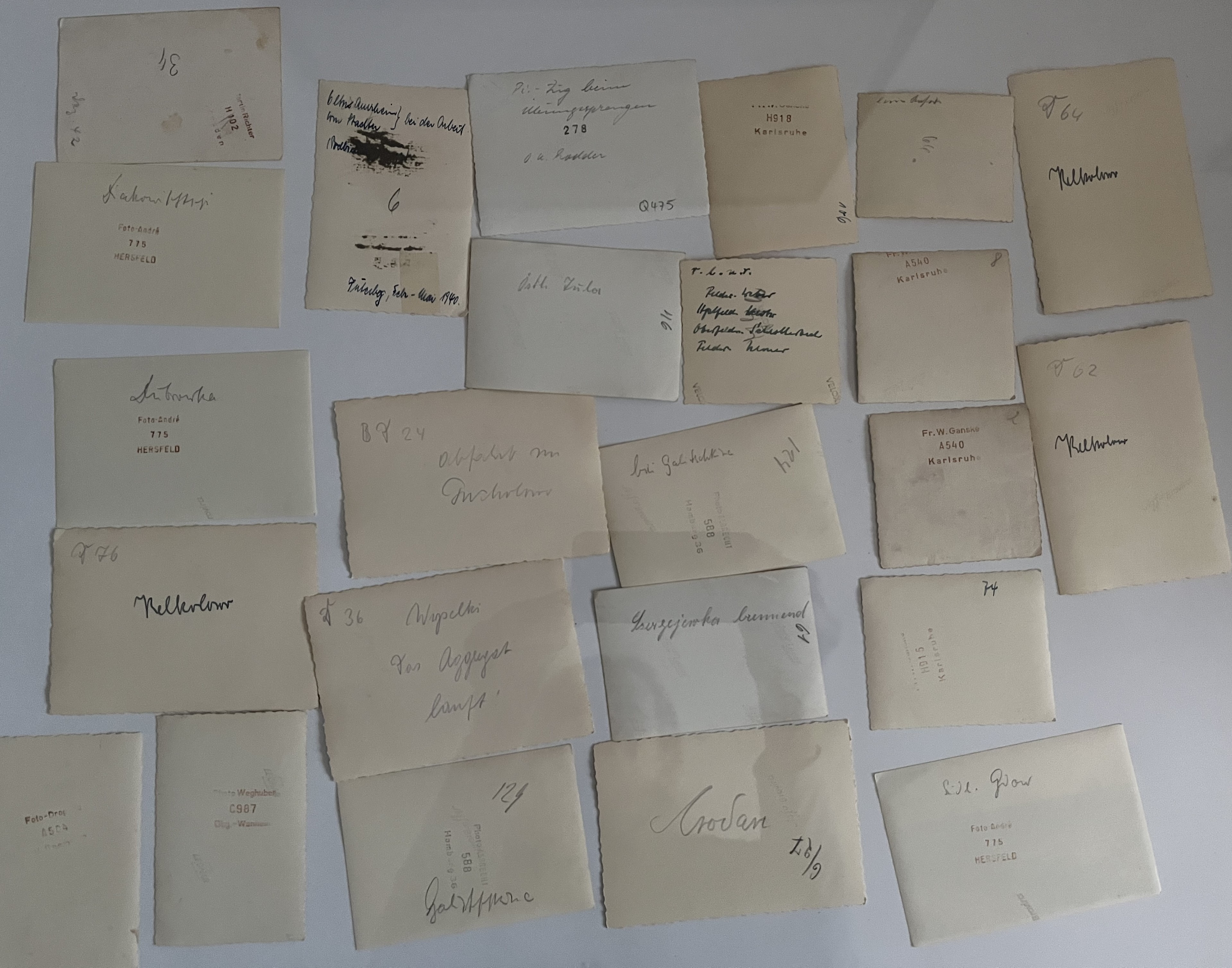 26 (K3-3) Z běžného života a bojů ve válečné Evropě r.1938-1945. Vojenská technika, život na frontě, mapování postupu. Fotografie mají různé formáty, nejmenší 3 x 4 cm, největší 13 x 18 cm. Rozměr kufříku 22,5 x 19 cm, v. 6 cm, obsahuje 144 ks menších formátu. Album rozměr 32 x 24 cm. V albumu jsou fota nalepená, místy archy poškozeny odlepením fotografií. Fotografií v albumu 256 ks. Fotografie civilní i vojenské z fronty, okupované oblasti….Fotografie např. Přelom roku 1941/1942. Německé divadlo Lille Tannhäuser. Z dovolené Kassel, Německo, září 1941.Brusel – Radnice. Velký trh. Mnichov. Prázdniny květen 1942. Graz, Štýrský Hradec. Antverpy. Vojáci s rodinou. V terénu. aj. Kromě domácí fronty obsahuje i řadu kvalitních a dokumentačních záběrů z bojiště a života na frontě německých vojáků včetně civilistů. Některé fotografie obsahují popisky na druhé straně. Zajímavý dokumentační materiál. Vojenská technika, výstroj, výzbroj, bajonety, helmy, zvířata na frontě.