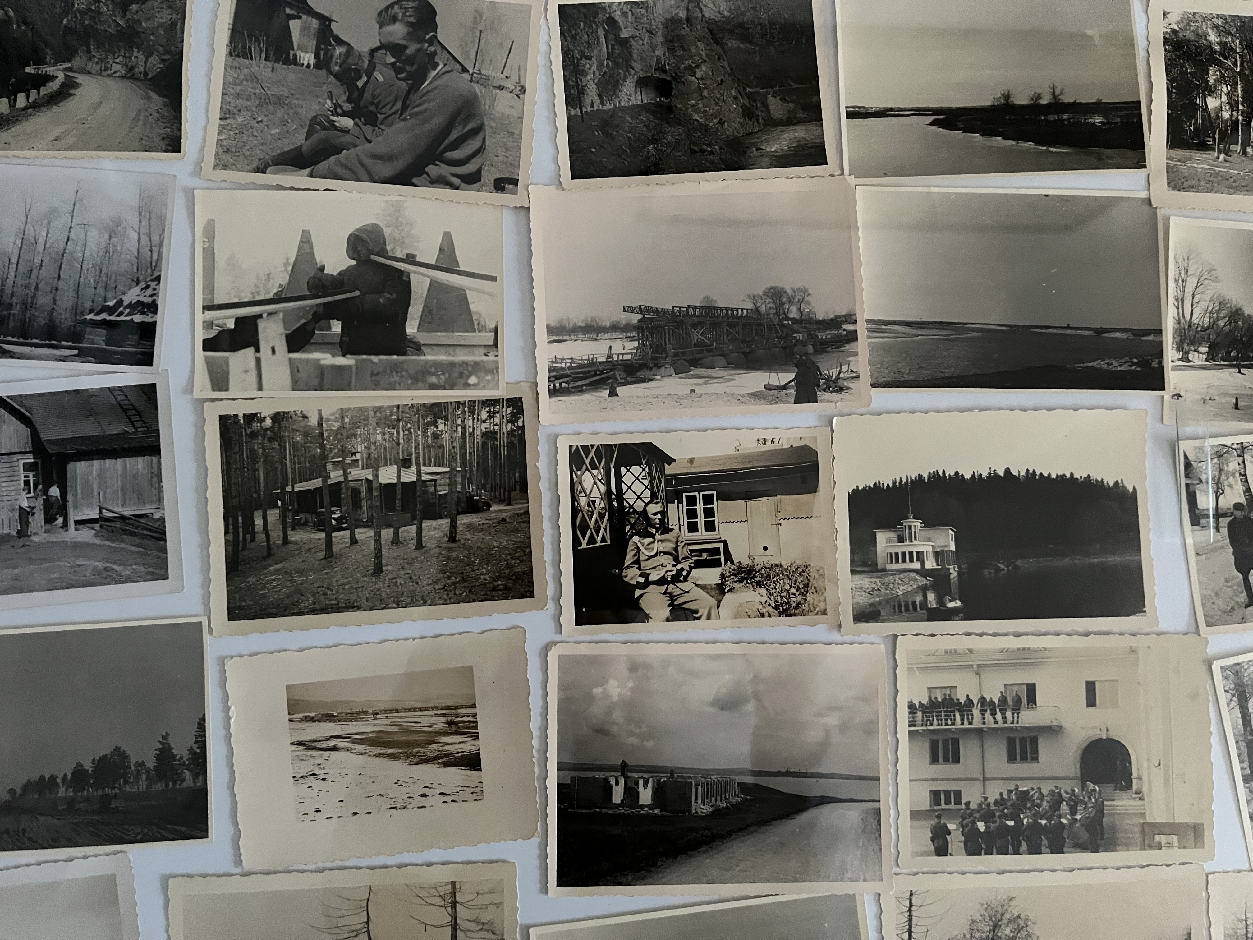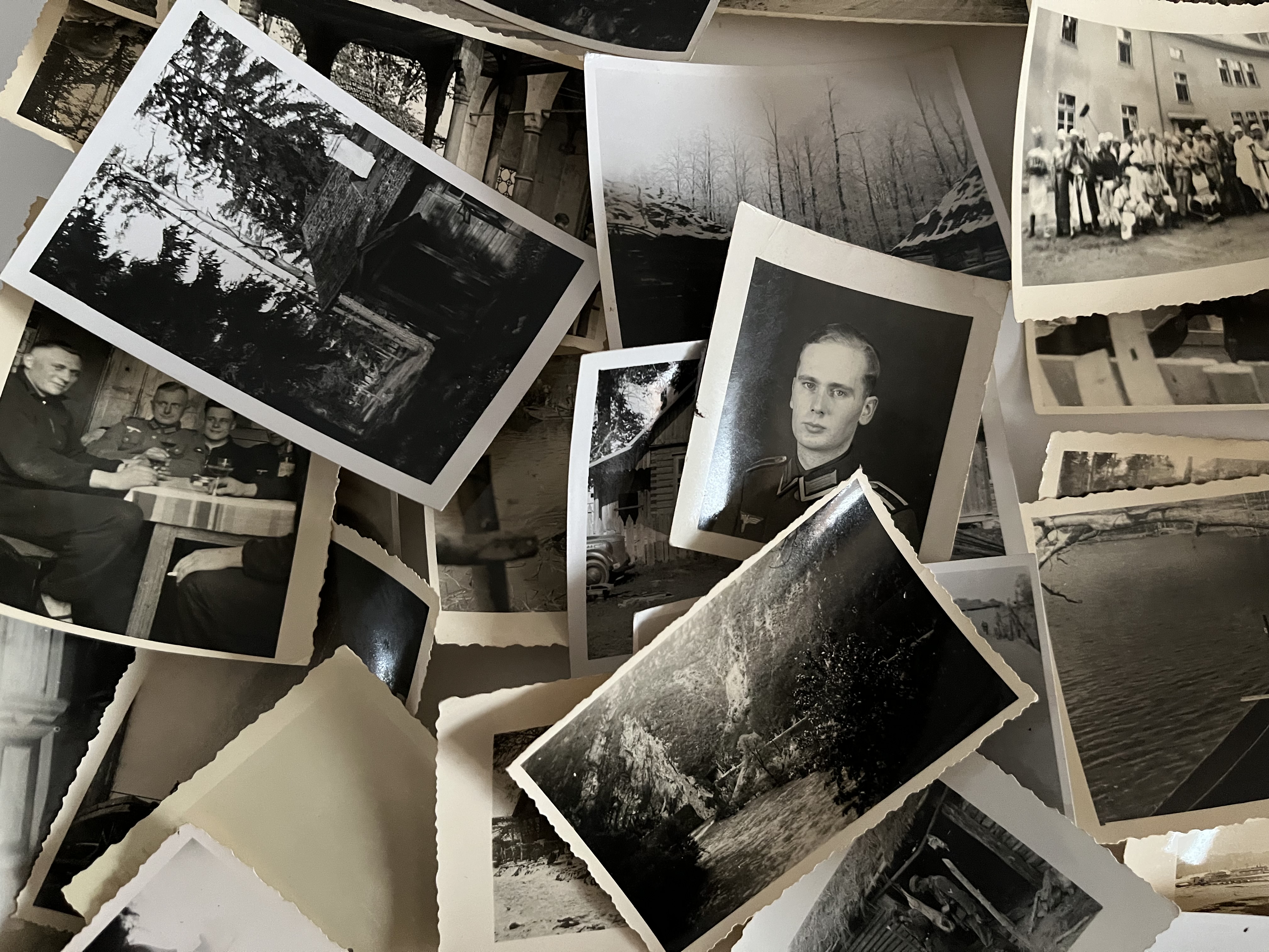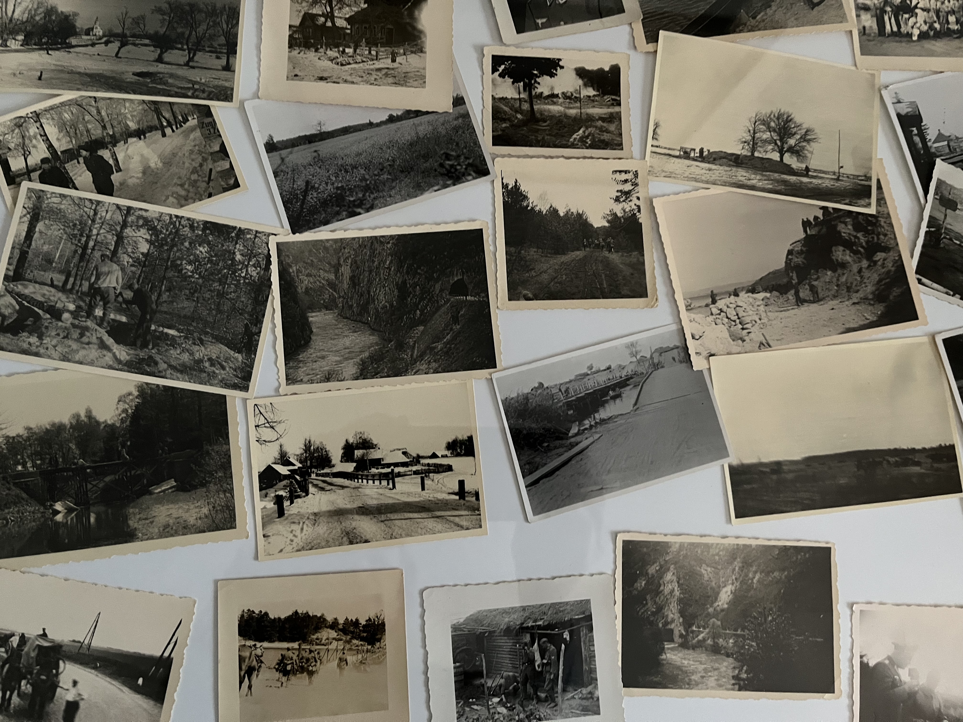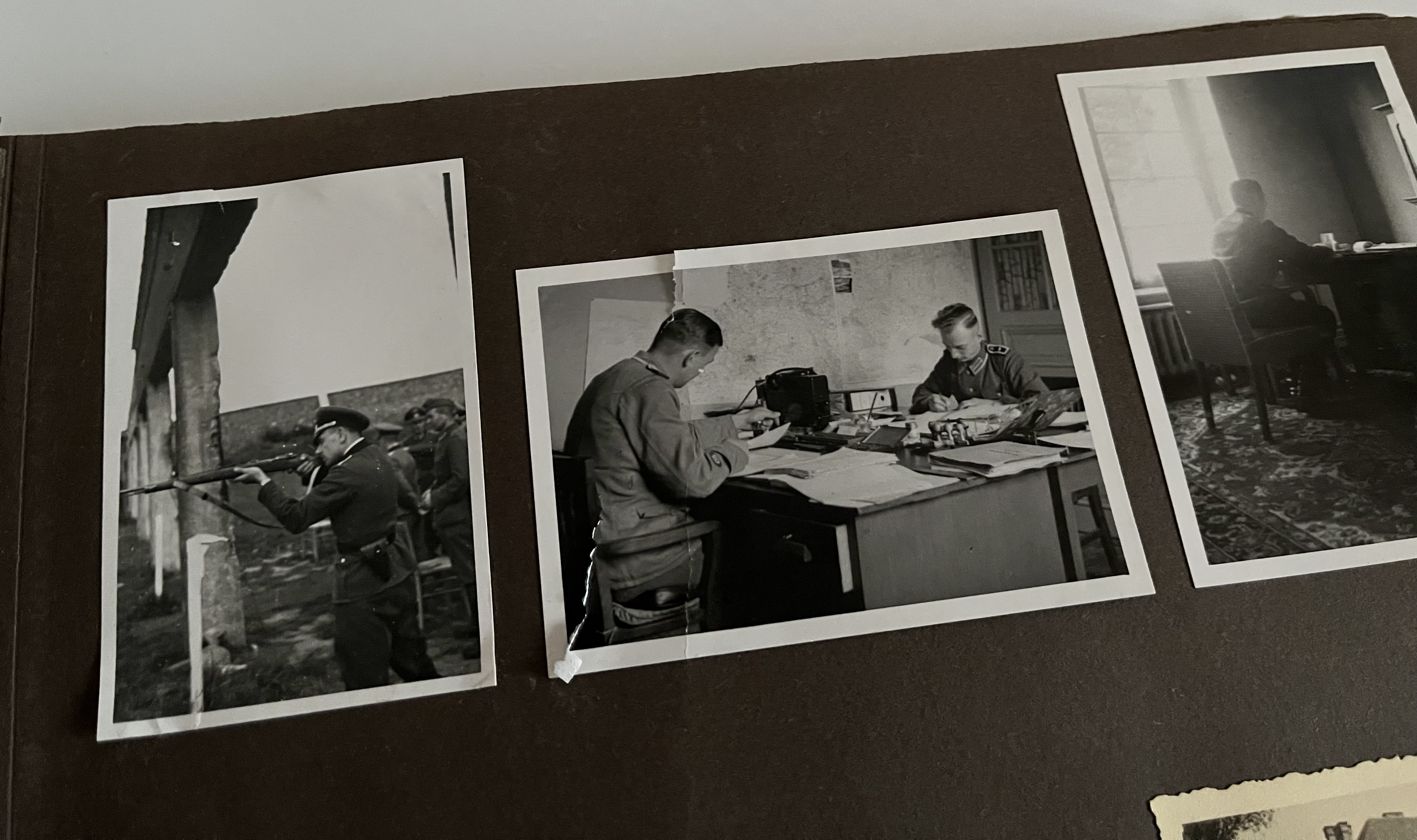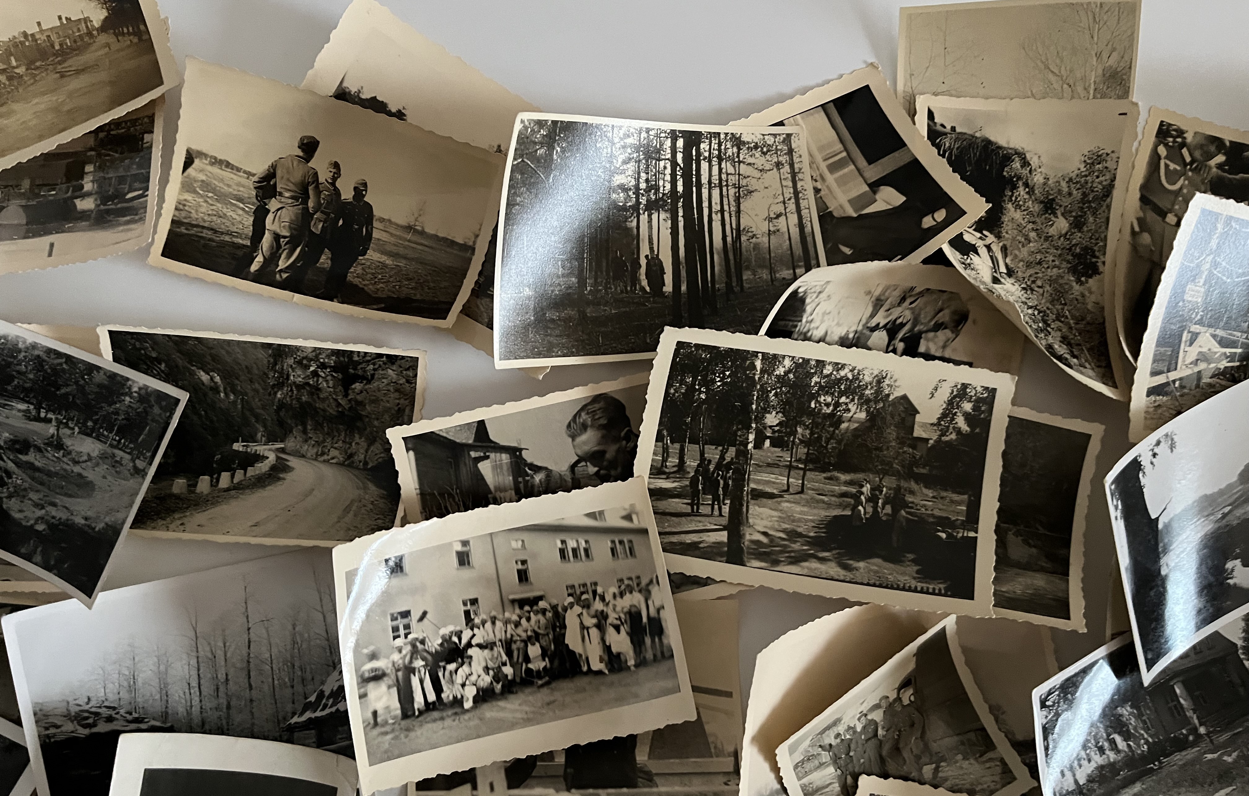 26 (K3-3) Z běžného života a bojů ve válečné Evropě r.1938-1945. Vojenská technika, život na frontě, mapování postupu. Fotografie mají různé formáty, nejmenší 3 x 4 cm, největší 13 x 18 cm. Rozměr kufříku 22,5 x 19 cm, v. 6 cm, obsahuje 144 ks menších formátu. Album rozměr 32 x 24 cm. V albumu jsou fota nalepená, místy archy poškozeny odlepením fotografií. Fotografií v albumu 256 ks. Fotografie civilní i vojenské z fronty, okupované oblasti….Fotografie např. Přelom roku 1941/1942. Německé divadlo Lille Tannhäuser. Z dovolené Kassel, Německo, září 1941.Brusel – Radnice. Velký trh. Mnichov. Prázdniny květen 1942. Graz, Štýrský Hradec. Antverpy. Vojáci s rodinou. V terénu. aj. Kromě domácí fronty obsahuje i řadu kvalitních a dokumentačních záběrů z bojiště a života na frontě německých vojáků včetně civilistů. Některé fotografie obsahují popisky na druhé straně. Zajímavý dokumentační materiál. Vojenská technika, výstroj, výzbroj, bajonety, helmy, zvířata na frontě.