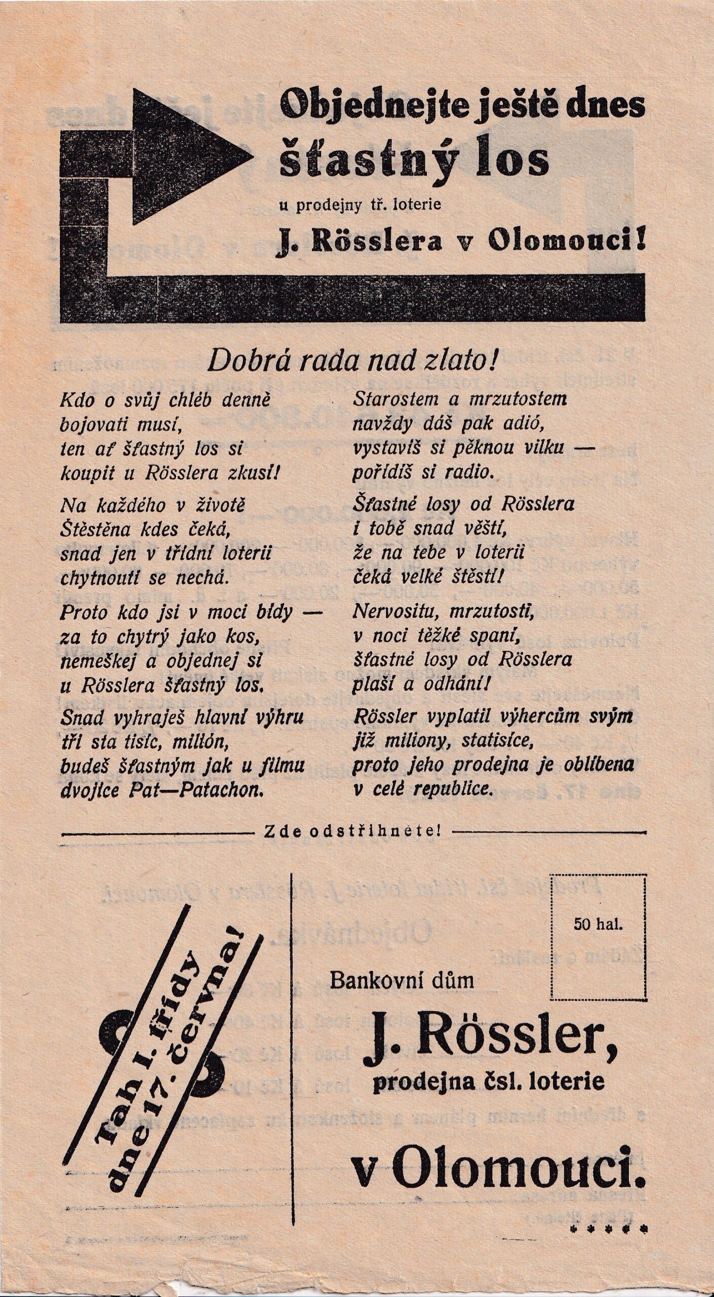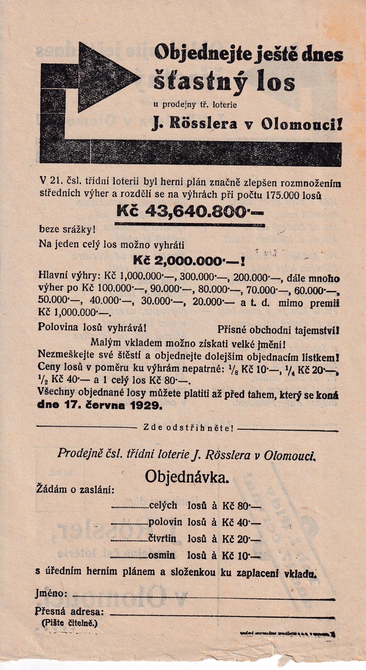 HomeObchodLetákyBankovní dům prodejna čsl.třídní loterie J. Rössler Olomouc r.1929