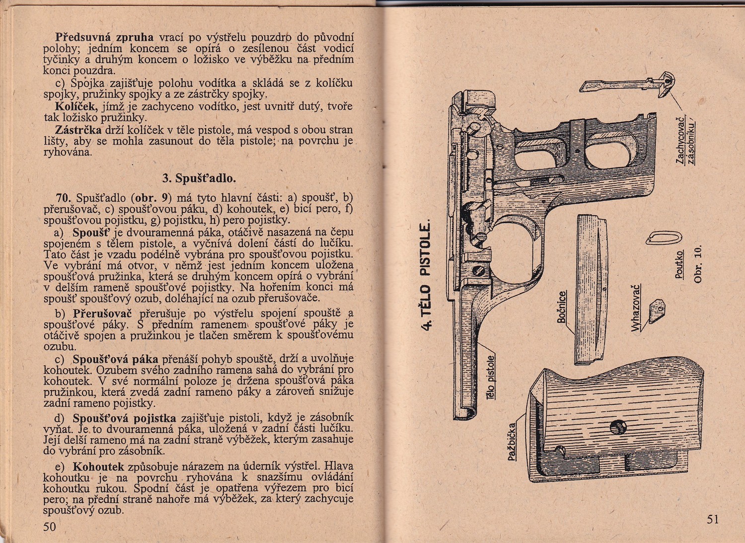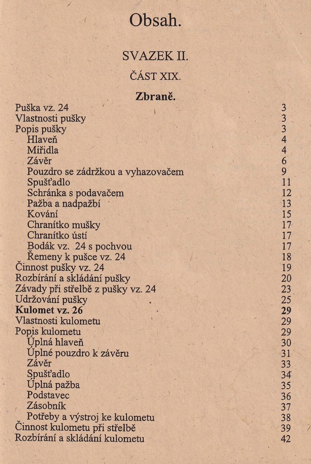 (hhj 68) Rozměr: 10 x 15 cm. Pro všechny zbraně a služby. Vydal Vojenský ústav vědecký Praha-Dejvice, 1937. Z obsahu:Zbraně. Kulomet vz.26. Pistole vz.24. Osvětlovací pistole. Raketová pistole vz.30 ad. 69 stran.