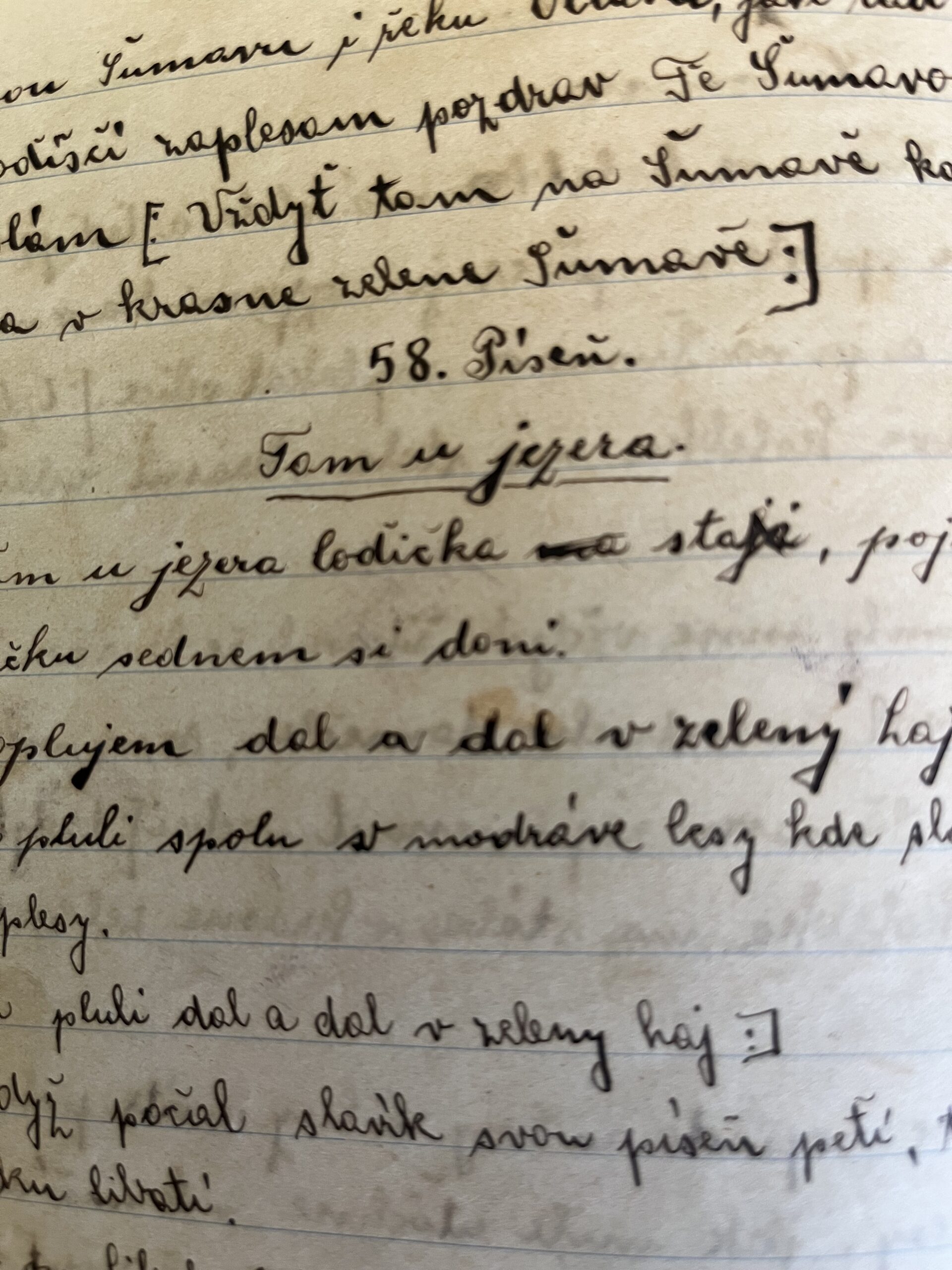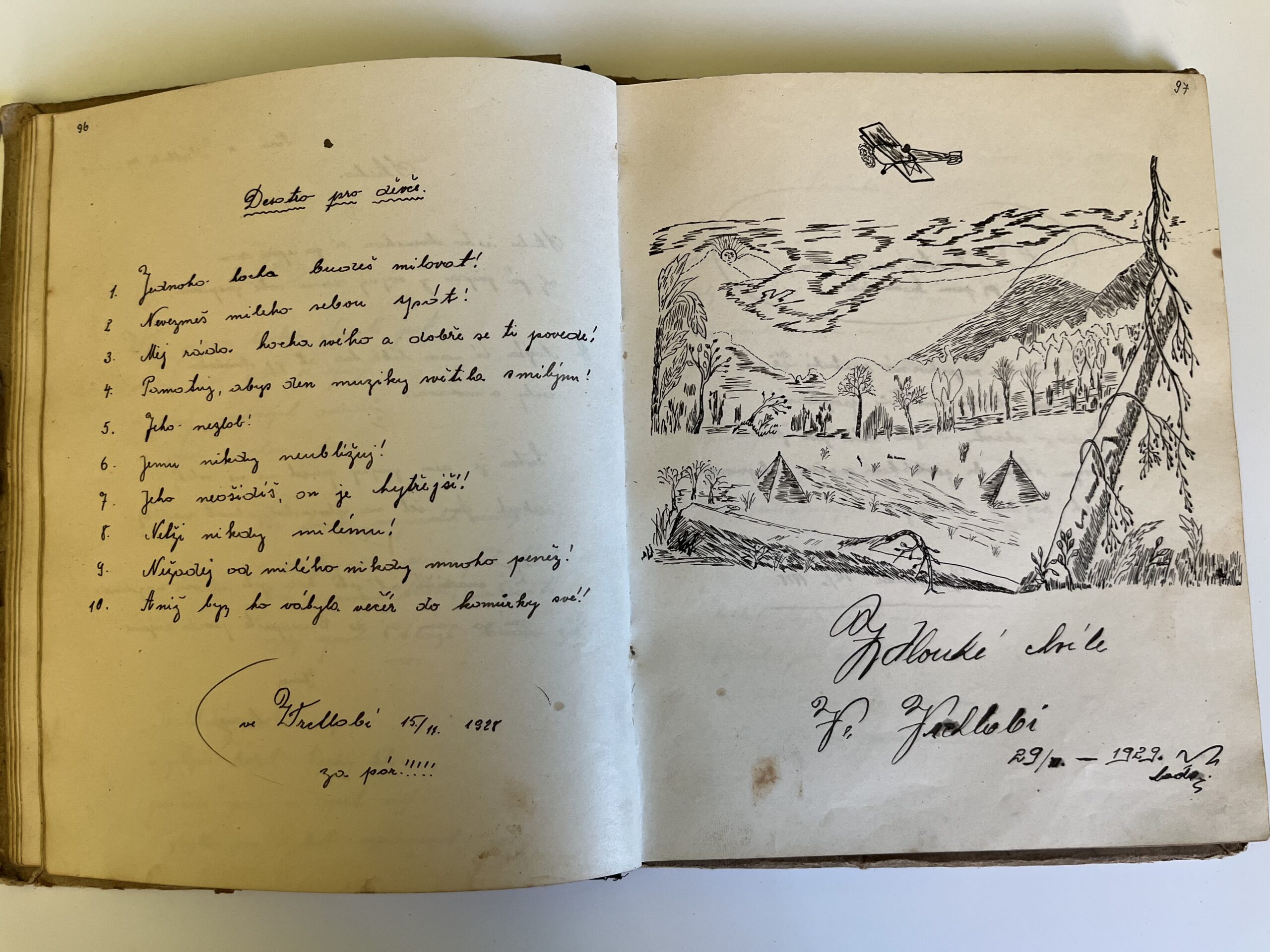 3 (K3-2) Rozměr sešitu 16,5 x 20 cm – napsáno 99 písní. Deník 18 x 22 cm, v. 2,5 cm. Vzpomínky z vojny 1927 – 1928 – 1929. Vrchlabí. 350 stránek textu a pár namalovaných obrázků cca 16.