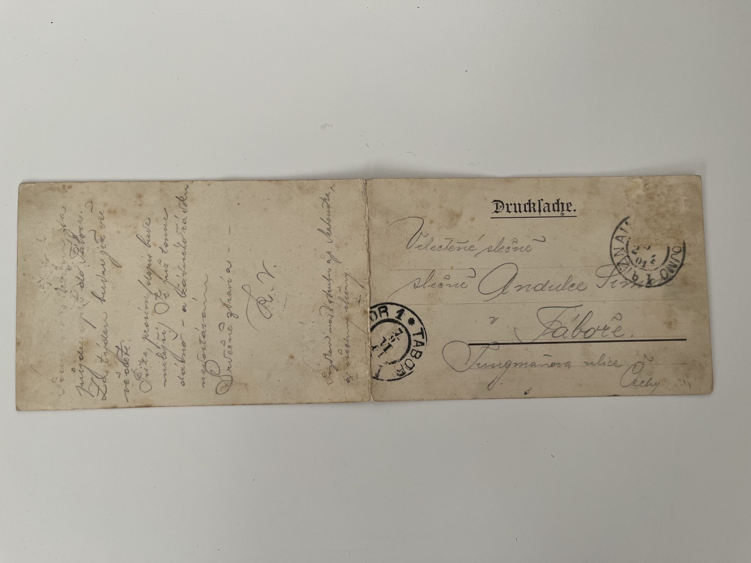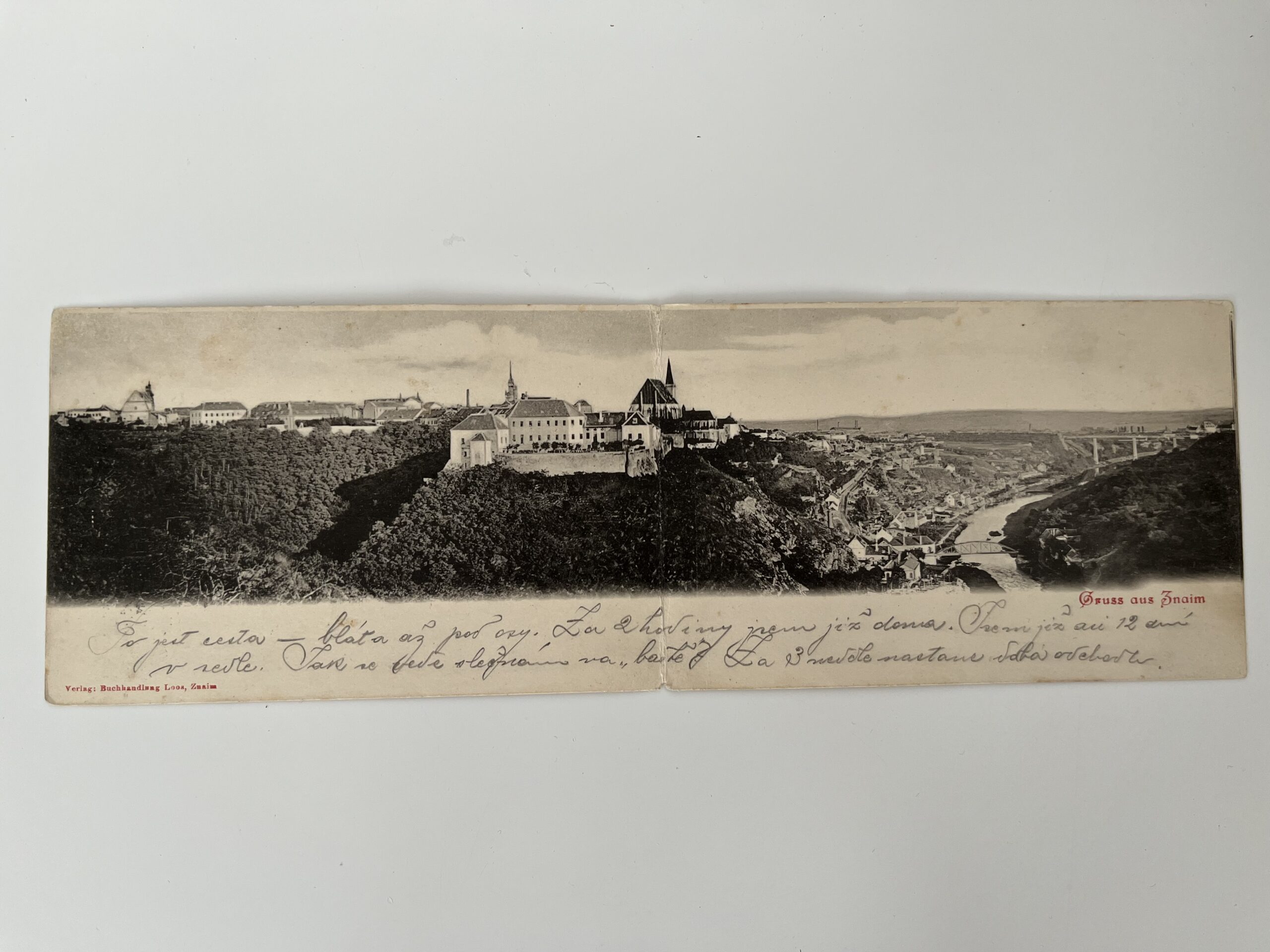 (Znojmo) Dlouhá přeložená pohlednice 9 x 28 cm, prošlá poštou r.1901.