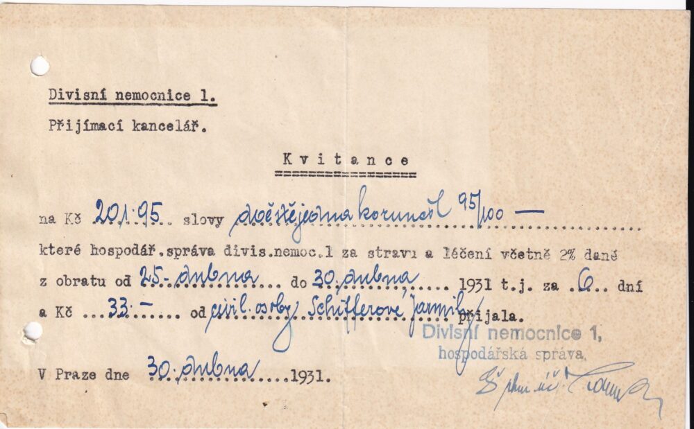 Dokument Kvitance – za stravu a léčení, Divisní nemocnice Praha 1931