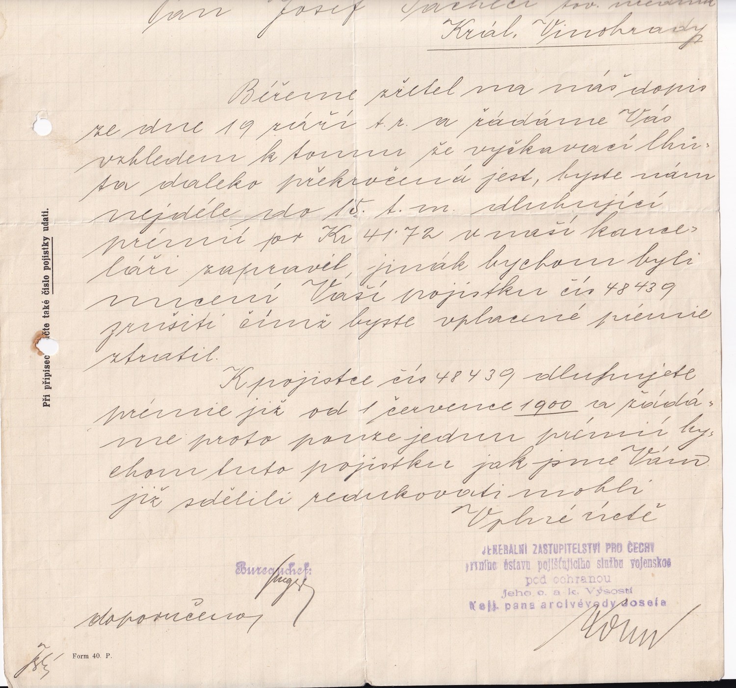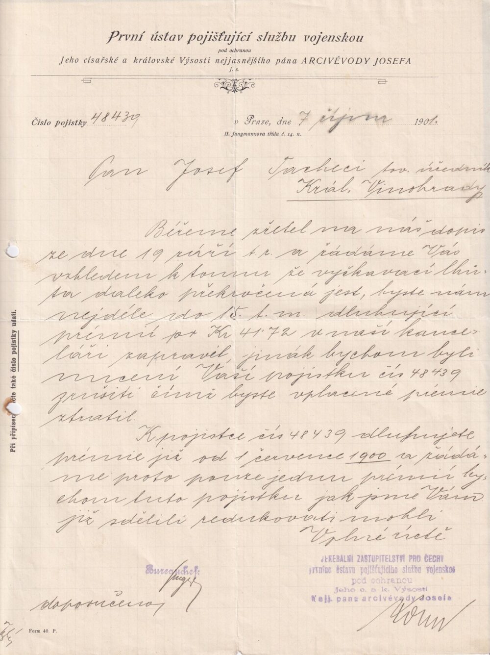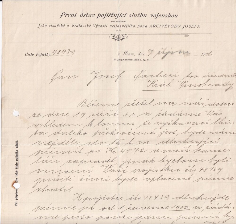 (hhj 45) Rozměr: 22 x 29 cm. První ústav pojišťující službu vojenskou pod ochranou Jeho císařské a královské Výsosti nejjasnějšího pána ARCIVÉVODY JOSEFA – razítko.
