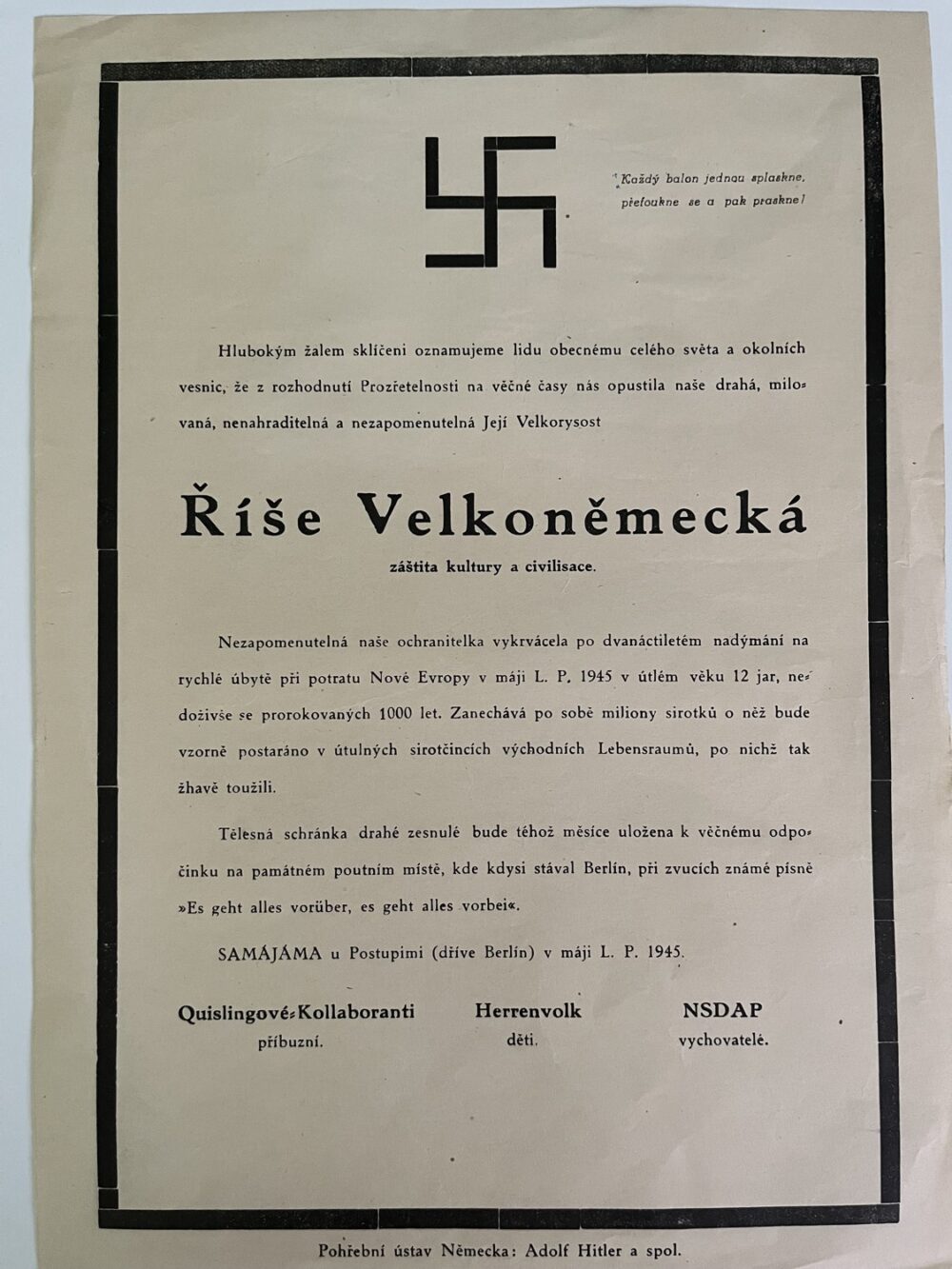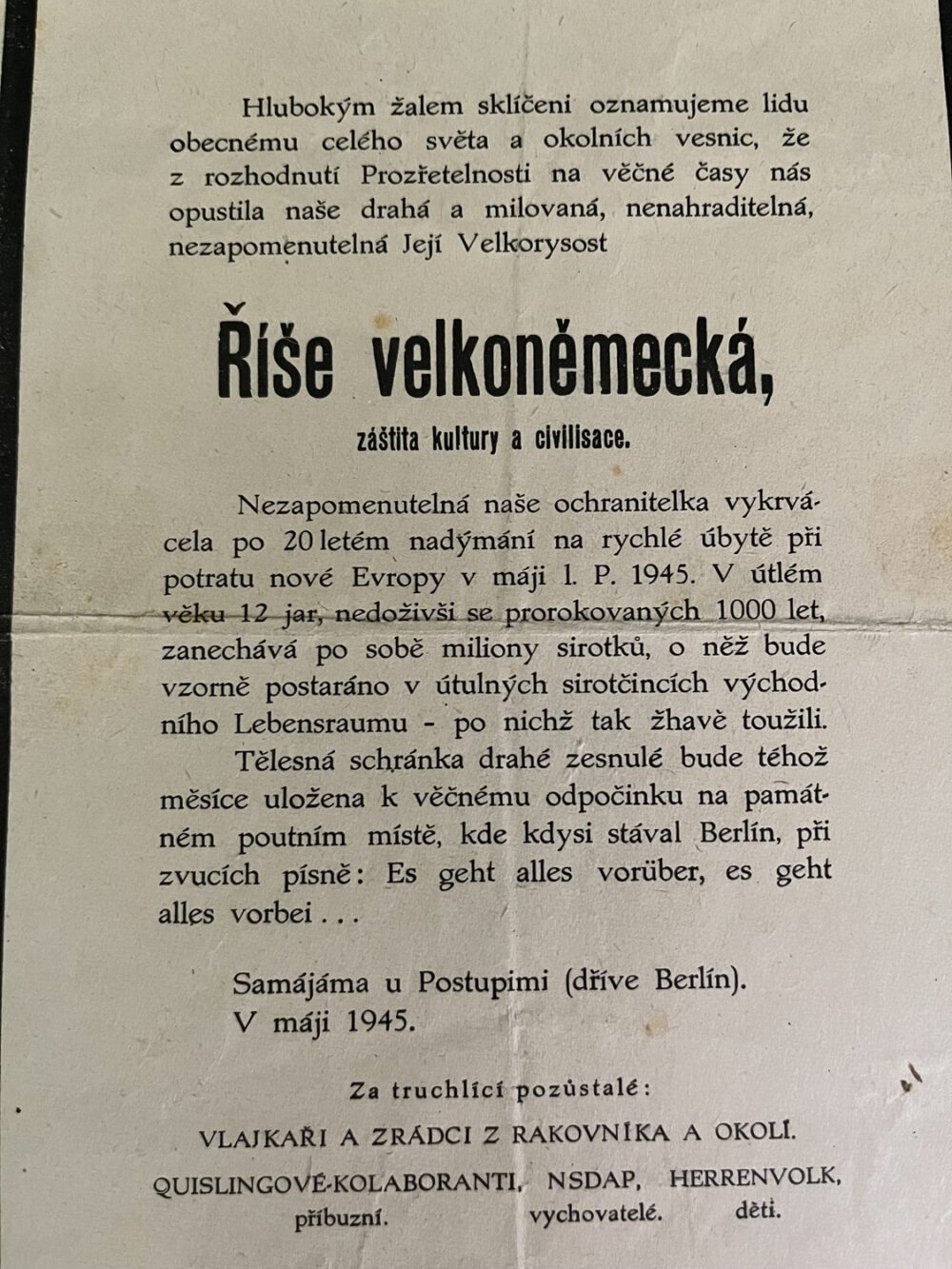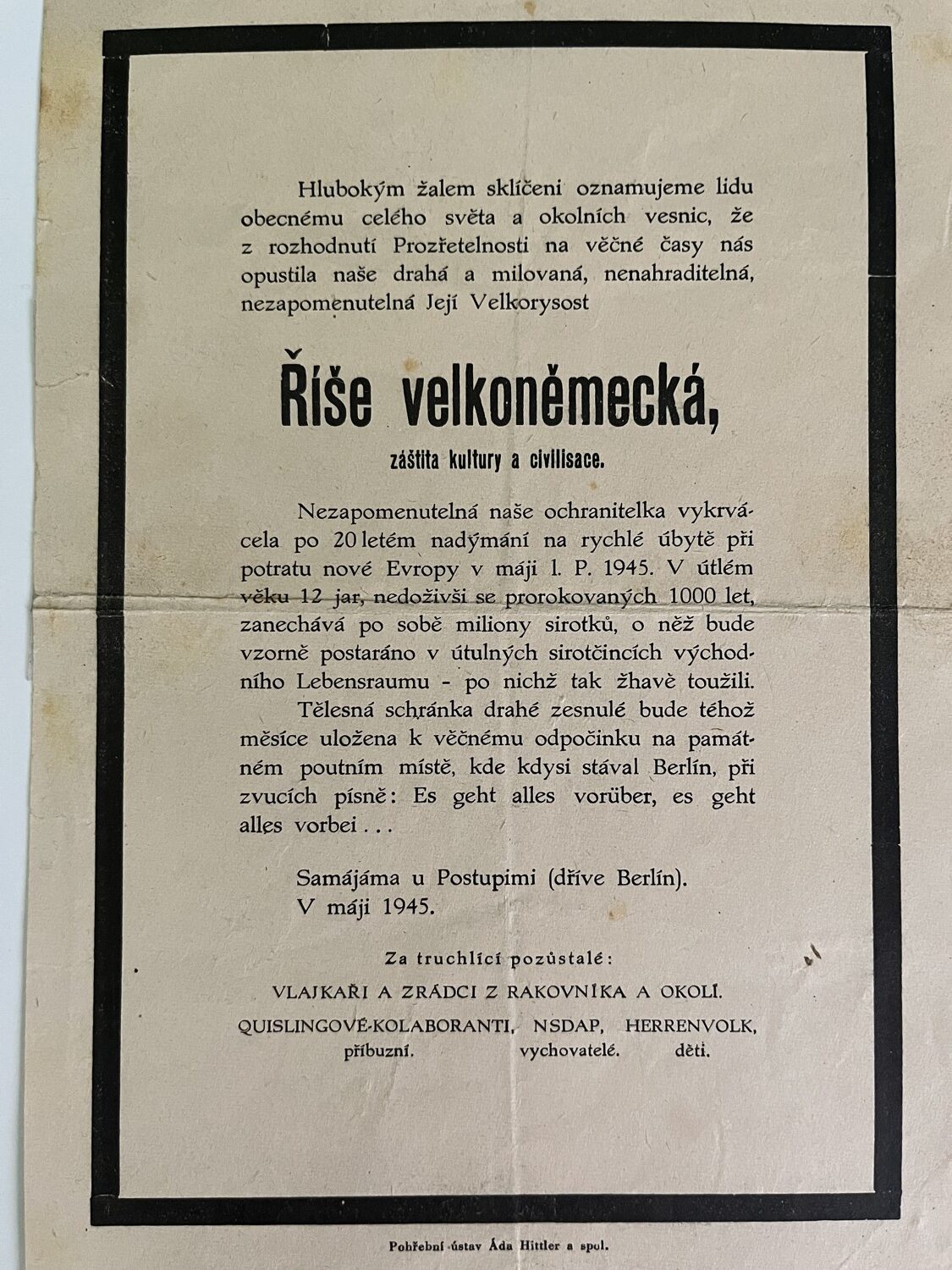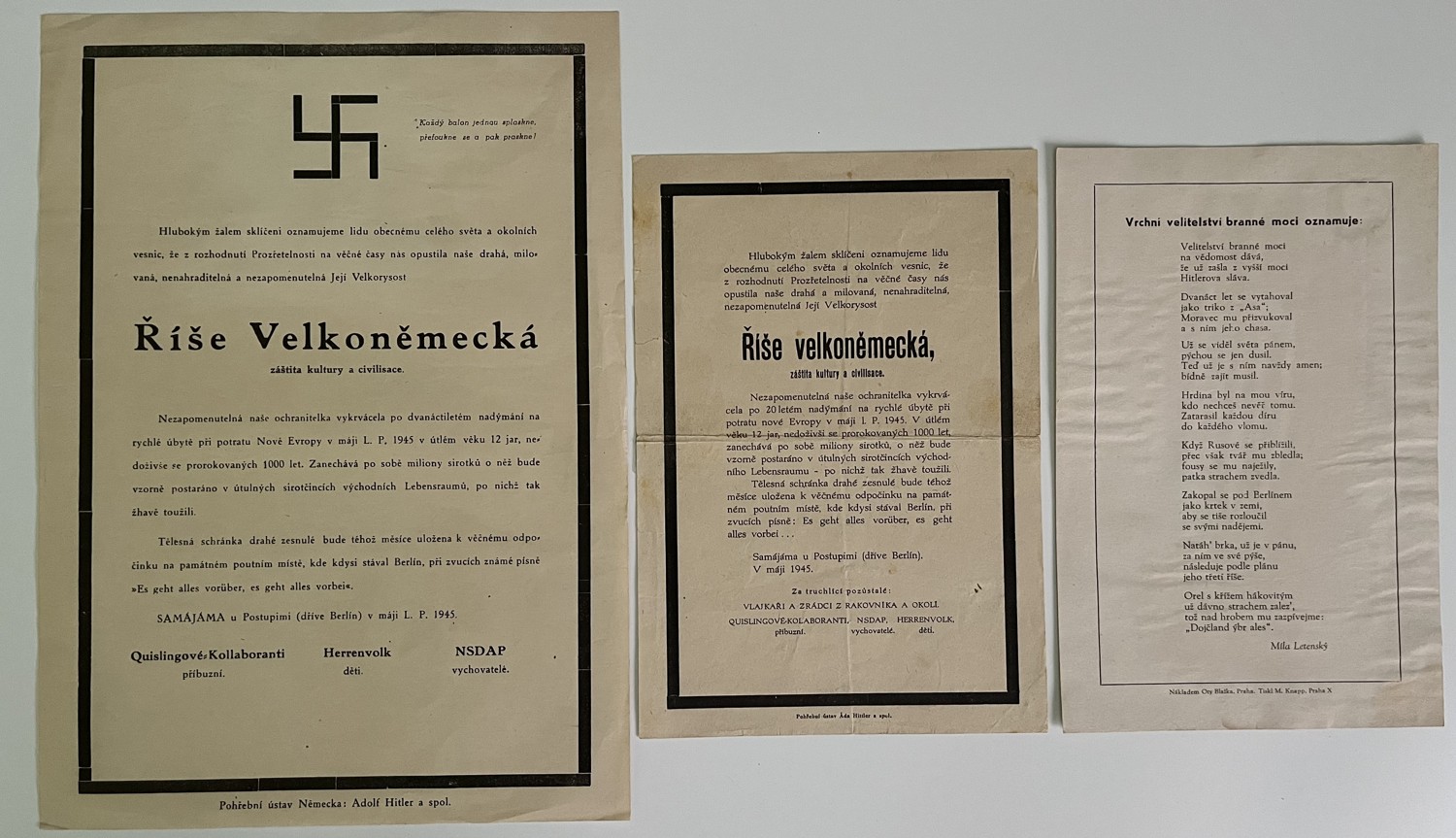 (hhj 22) Dokument 14 x 21 Vrchní velitelství branné moci oznamuje…Míla Letenský, nákladem Otty Blažka, Praha. Tiskl M. Knapp, Praha. 2 x 14,5 x 21 cm, 21 x 29 cm – Posměšné Smuteční oznámení o opuštění Její Velkorysosti – Říše Velkoněmecká – záštita kultury a civilisace. Pohřební ústav Německa: Adolf Hitler a spol. 1945