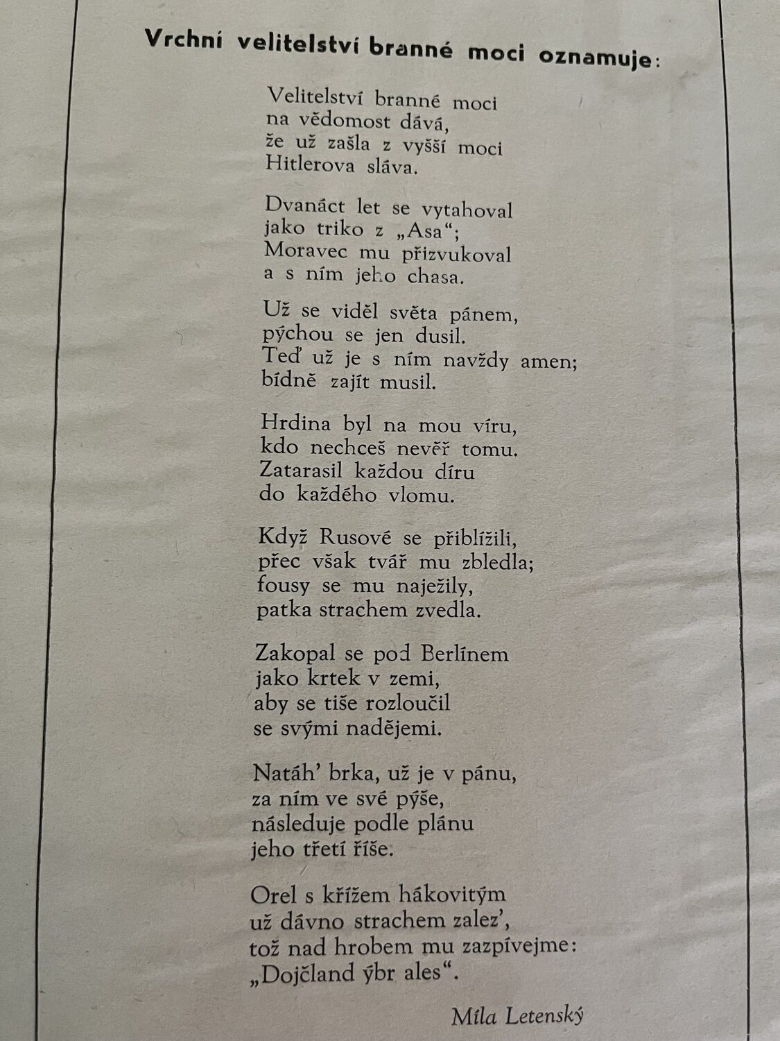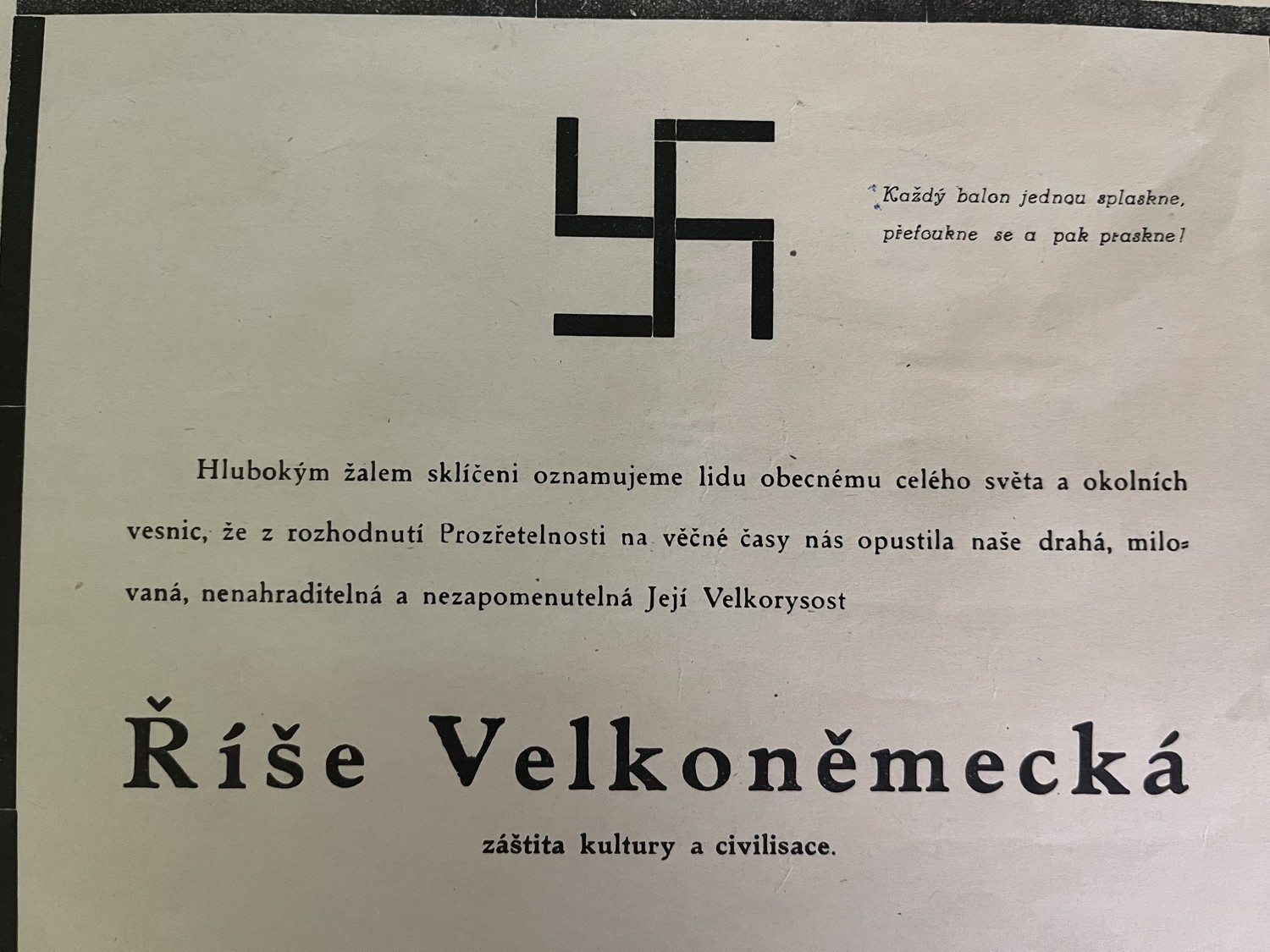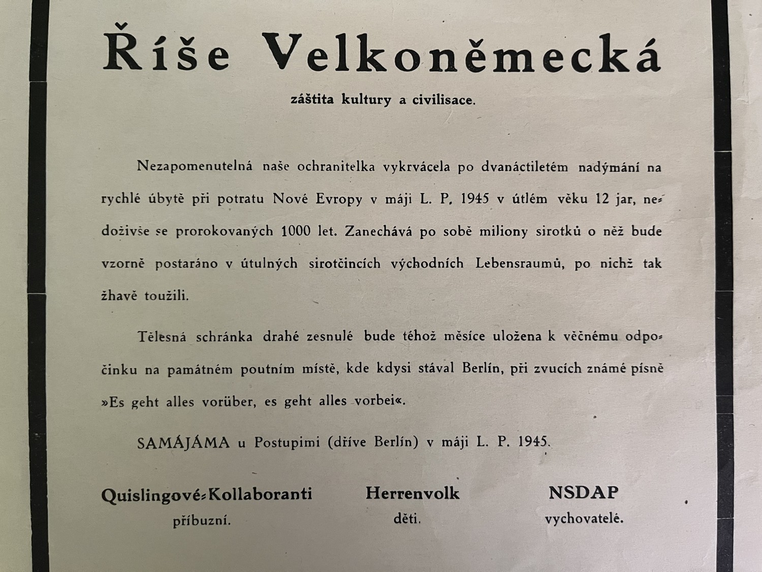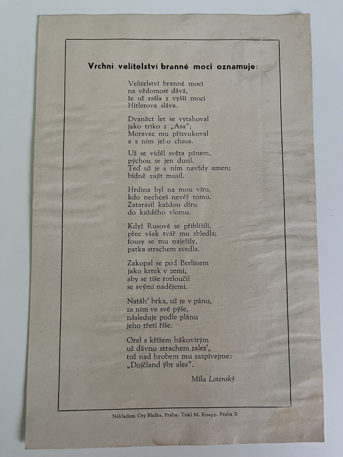 (hhj 22) Dokument 14 x 21 Vrchní velitelství branné moci oznamuje…Míla Letenský, nákladem Otty Blažka, Praha. Tiskl M. Knapp, Praha. 2 x 14,5 x 21 cm, 21 x 29 cm – Posměšné Smuteční oznámení o opuštění Její Velkorysosti – Říše Velkoněmecká – záštita kultury a civilisace. Pohřební ústav Německa: Adolf Hitler a spol. 1945