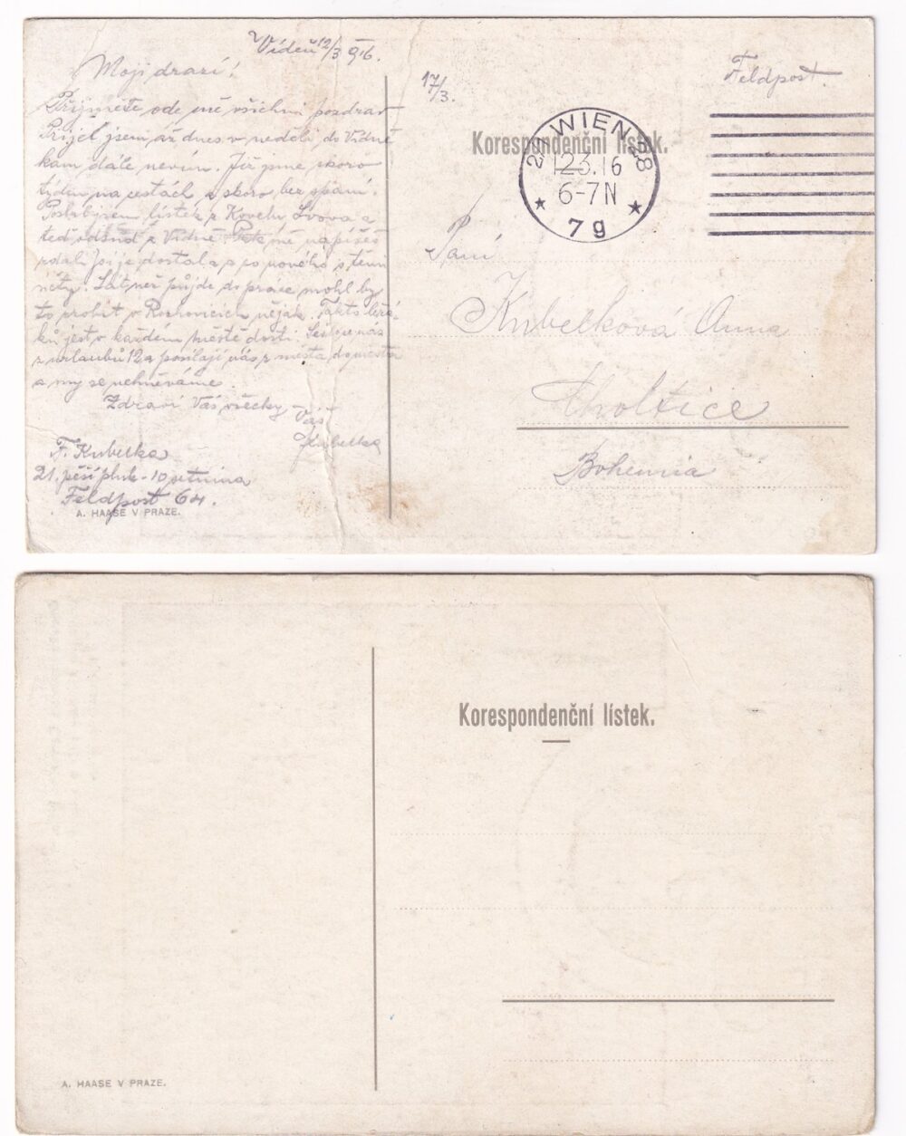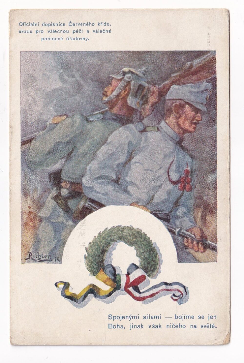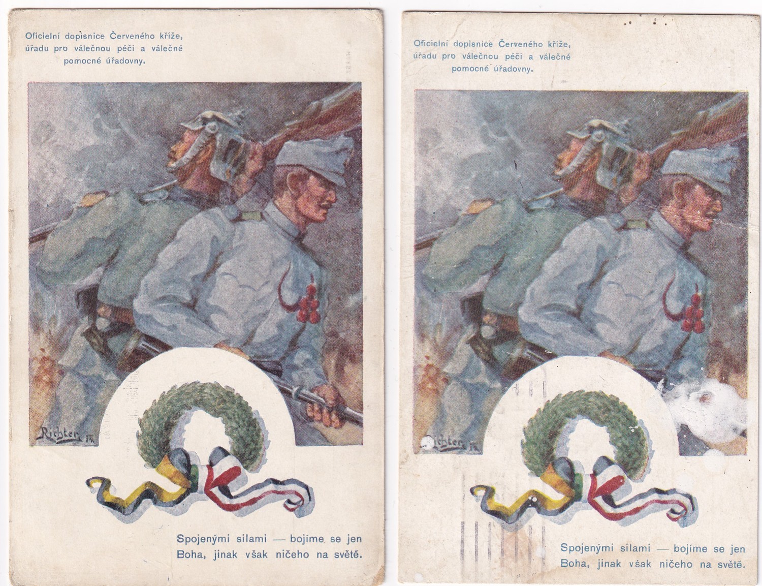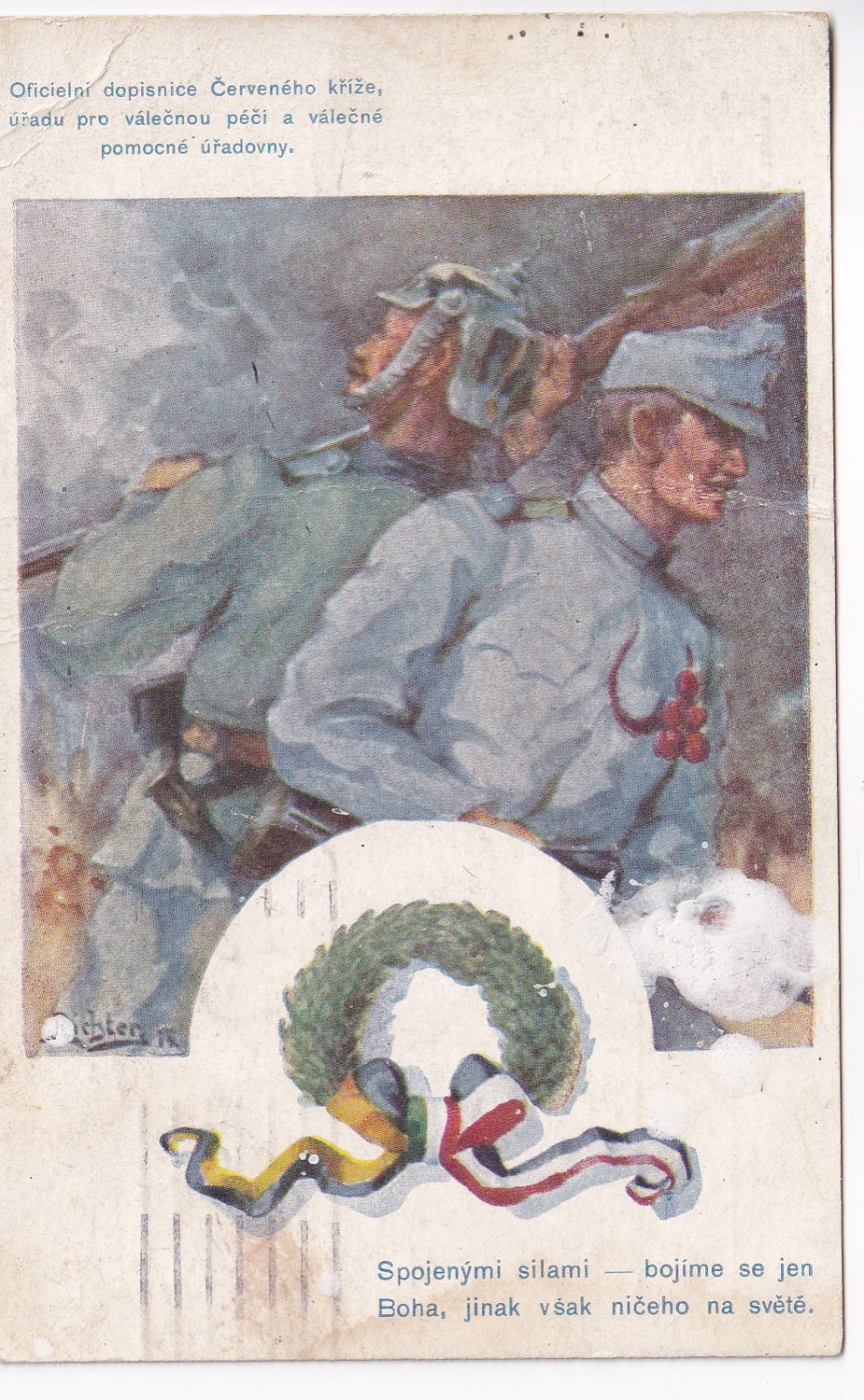 (hhk 46) MF, set 2 ks. 1 x pohlednice prošlá poštou. Adresát Choltice, r.1916. Oficielní dopisnice Červeného kříže, úřadu pro válečnou péči a válečné pomocné úřadovny. Spojenými silami – bojíme se jen Boha, jinak však ničeho na světě.