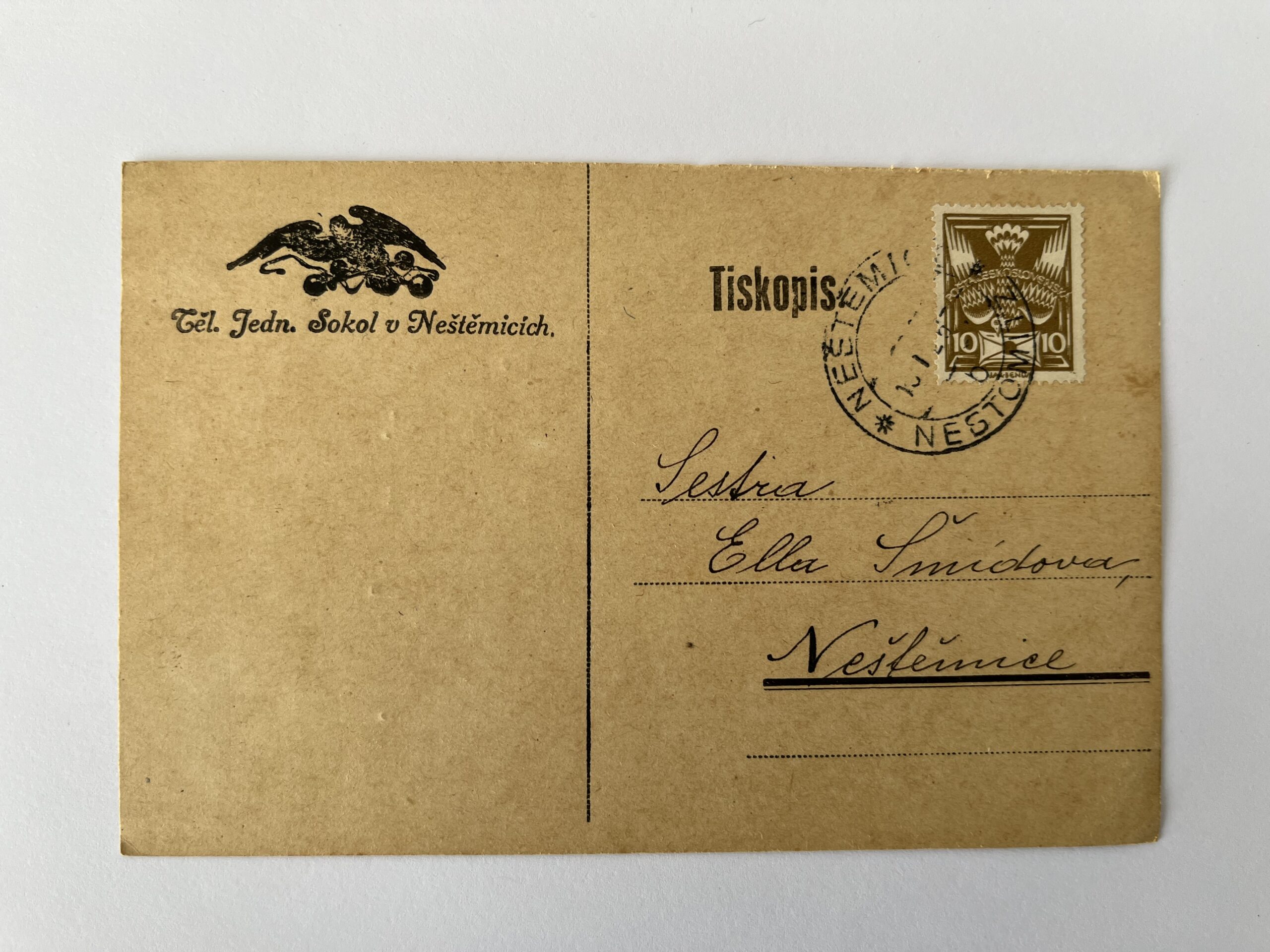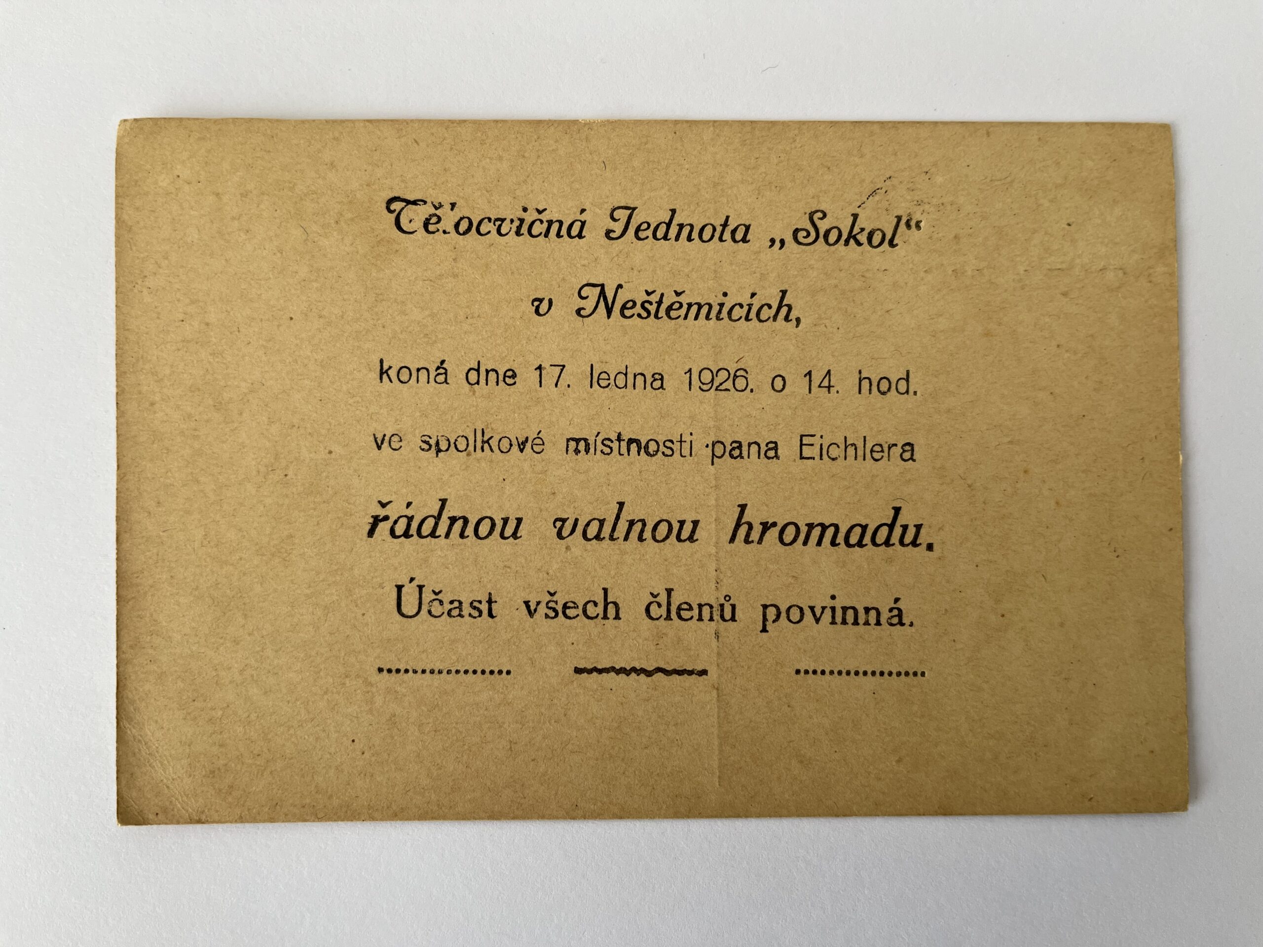 (Ústí nad Labem-39) Malý formát, dopisnice prošlá poštou. Tělocvičná Jednota Sokol v Neštěmicích koná 17.ledna 1926 řádnou valnou hromadu.