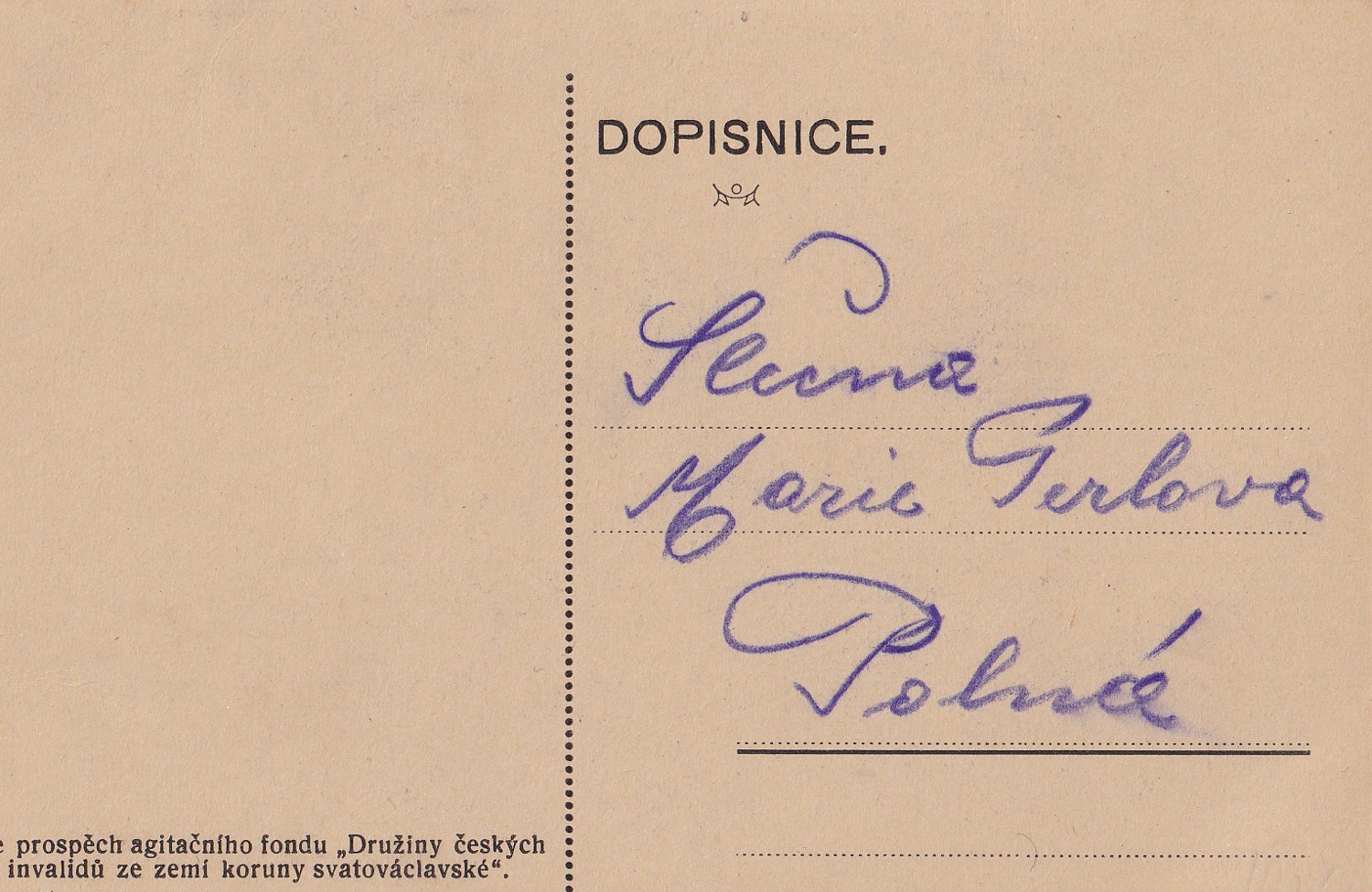 (hhk 39) MF, dopisnice neprošlá poštou. Ve prospěch agitačního fondu „Družiny českých invalidů ze zemi koruny svatováclavské“
