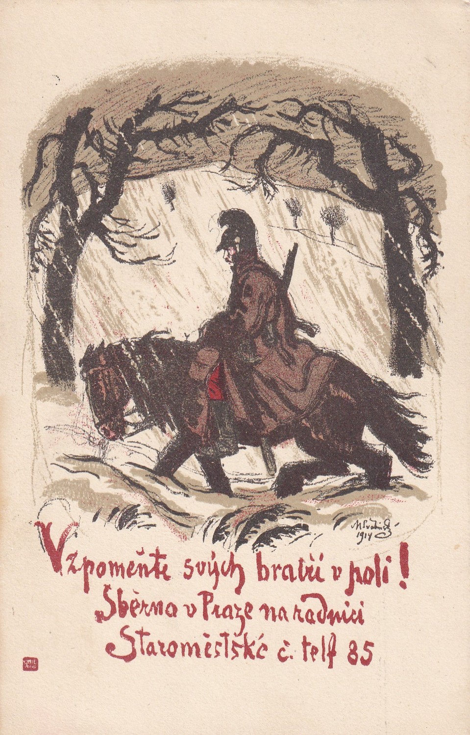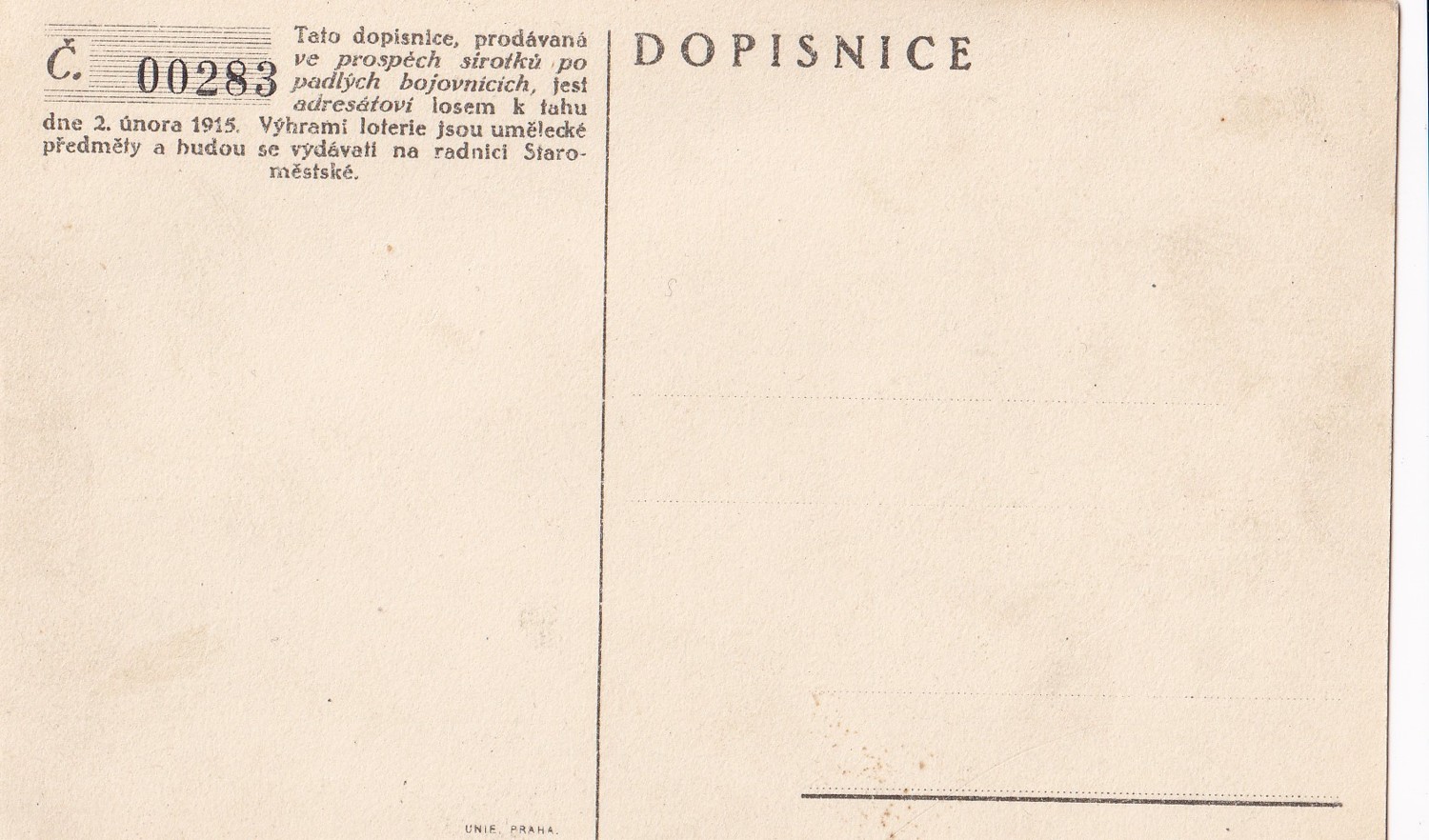 (hhk 36) MF, není prošlá poštou. Č. 00283 – Tato dopisnice, prodávaná ve prospěch sirotků po padlých bojovnících, jest adresátovi losem k tahu dne 2.února 1915.