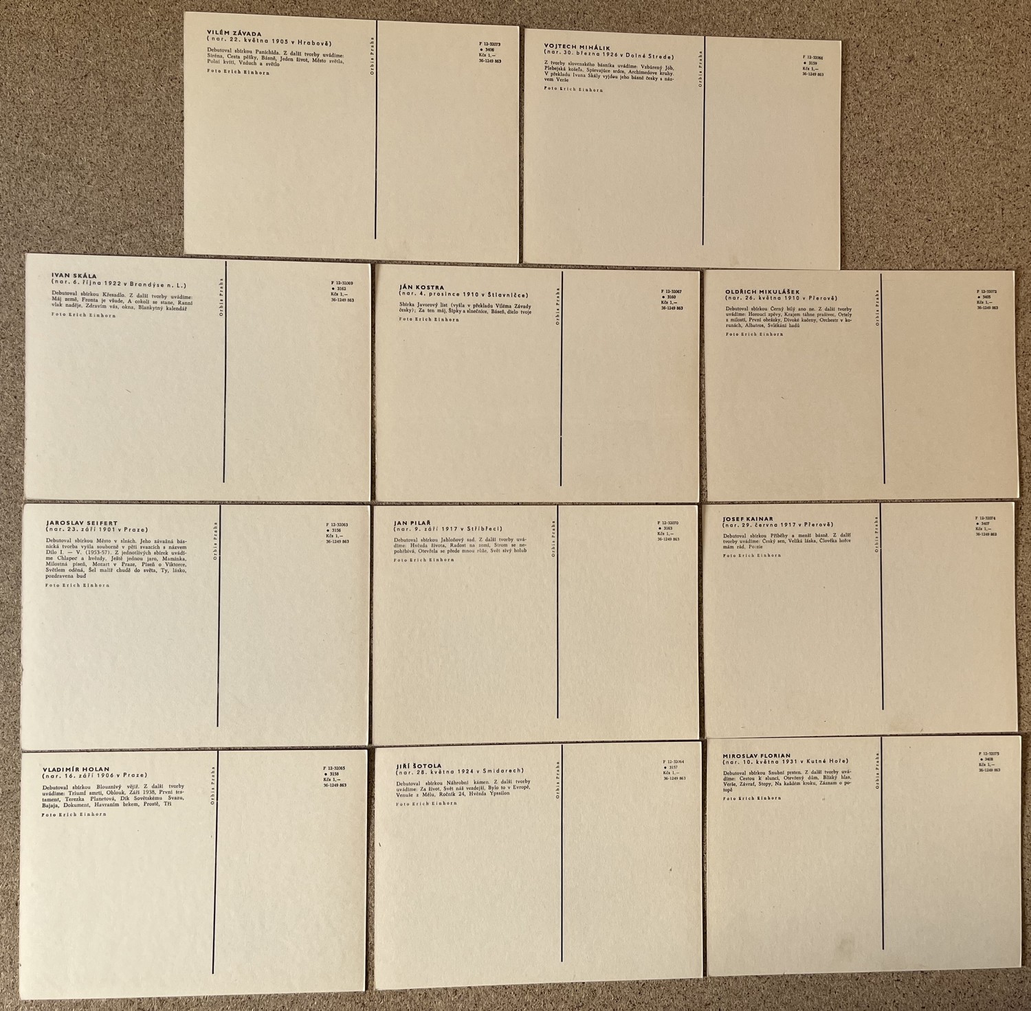 17 (hha) Rozměr 13 x 18 cm, celkem 11 ks, chybí 1 ks. Úvodní studii napsal Štěpán Engl. Básníci J. Seifert, V. Závada, V. Holan, O. Mikulášek, J. Kostra, J. Kainar, J. Pilař, I. Skála, J. Šotola, V. Mihálik, M. Florian.