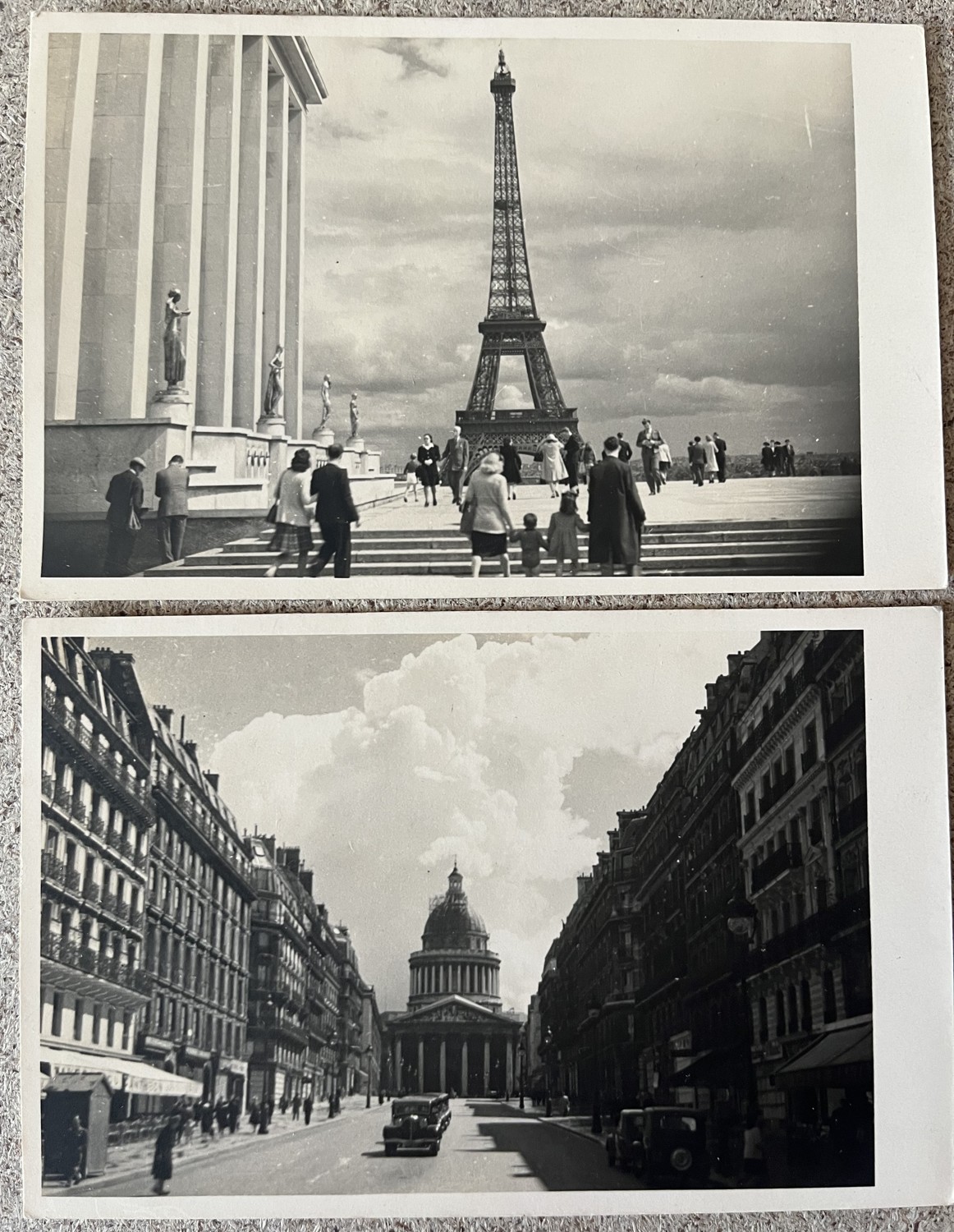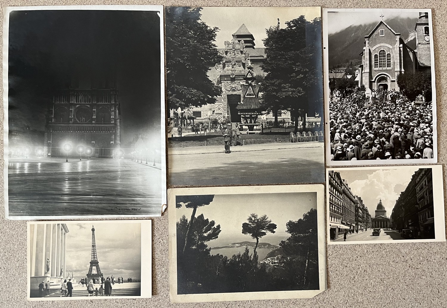 7 (hhd) Rozměr různého formátu – největší 18 x 24 cm, nejmenší 8,5 x 14 cm. Fotografie Francie – Eiffelova věž v Paříži. Pantheon památník v Paříži. Katedrála Notre-Dame (Paříž) + razítko na zadní straně fotografie. Èze – Francie. Chamonix – Kostel ve Francii + razítko na zadní straně fotografie. Pařížská koloniální expozice.