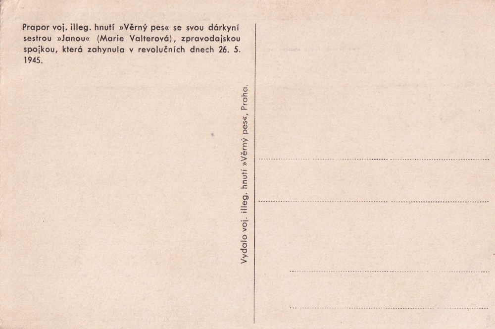 67 (hhg) rozměr 14 x 9 cm. Prapor voj.illeg.hnutí „Věrný pes“ se svou dárkyní sestrou „Janou“ (Marie Valterová), zpravodajskou spojkou, která zahynula v revolučních dnech 26.5.1945.
