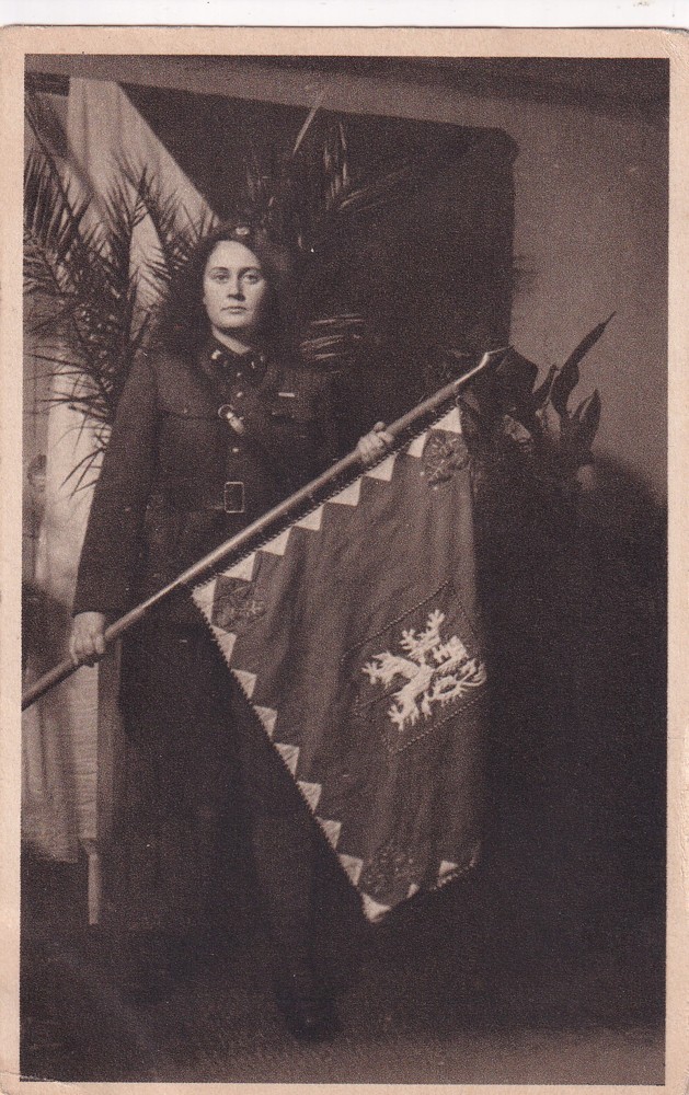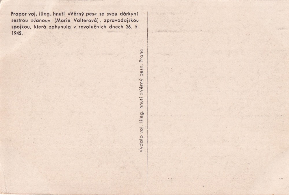 66 (hhg) rozměr 14 x 9 cm. Prapor voj.illeg.hnutí „Věrný pes“ se svou dárkyní sestrou „Janou“ (Marie Valterová), zpravodajskou spojkou, která zahynula v revolučních dnech 26.5.1945.
