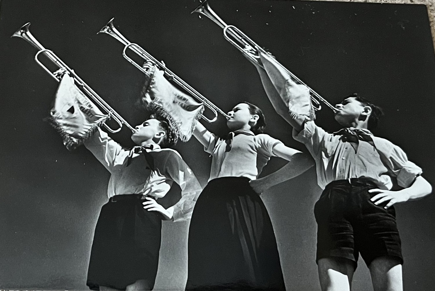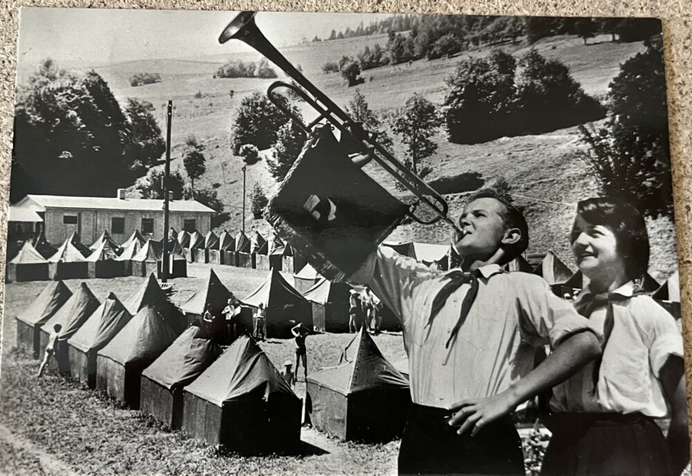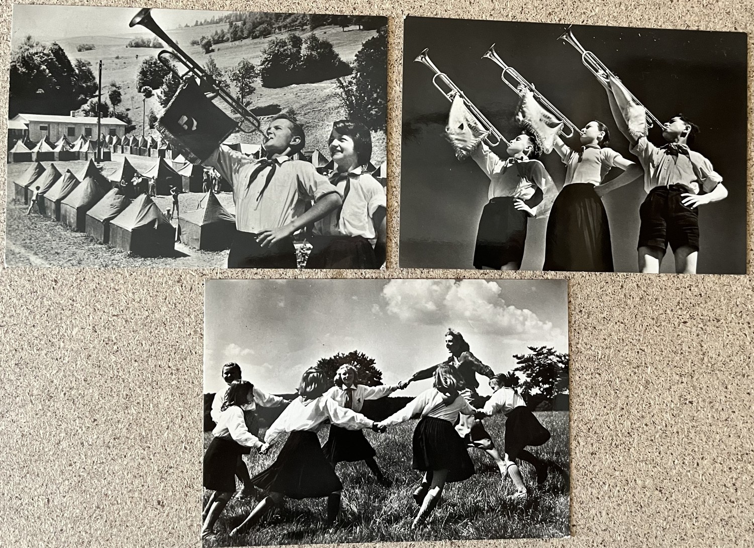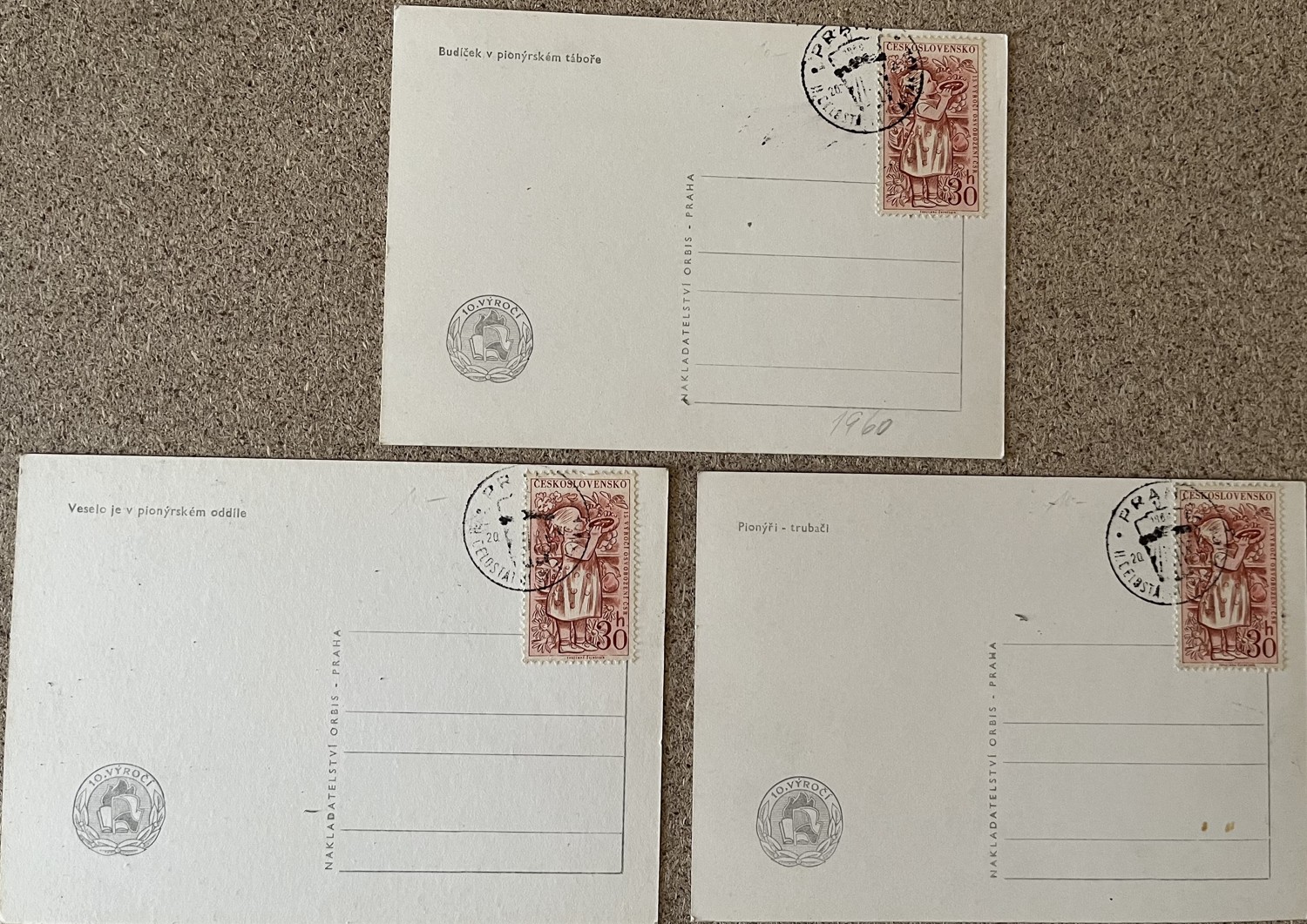 4 (hhc) Rozměr 14,5 x 10 cm. Koláž – Veselo je v pionýrkém oddíle. Pionýři – trubači. Budíček v pionýrském táboře. Nakladatelství Orbis. Pohledy se známkou a razítkem.