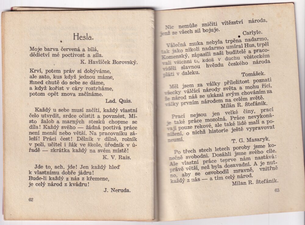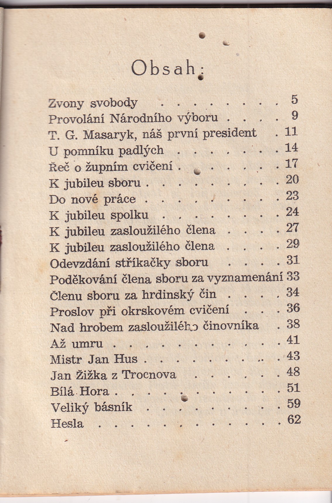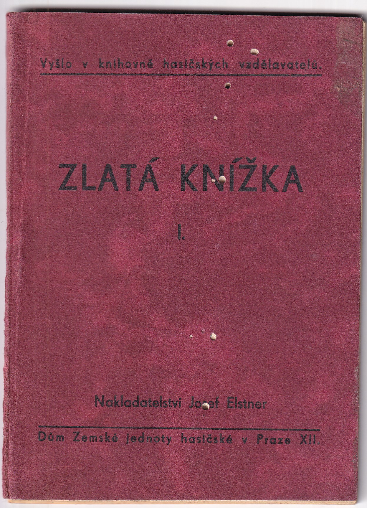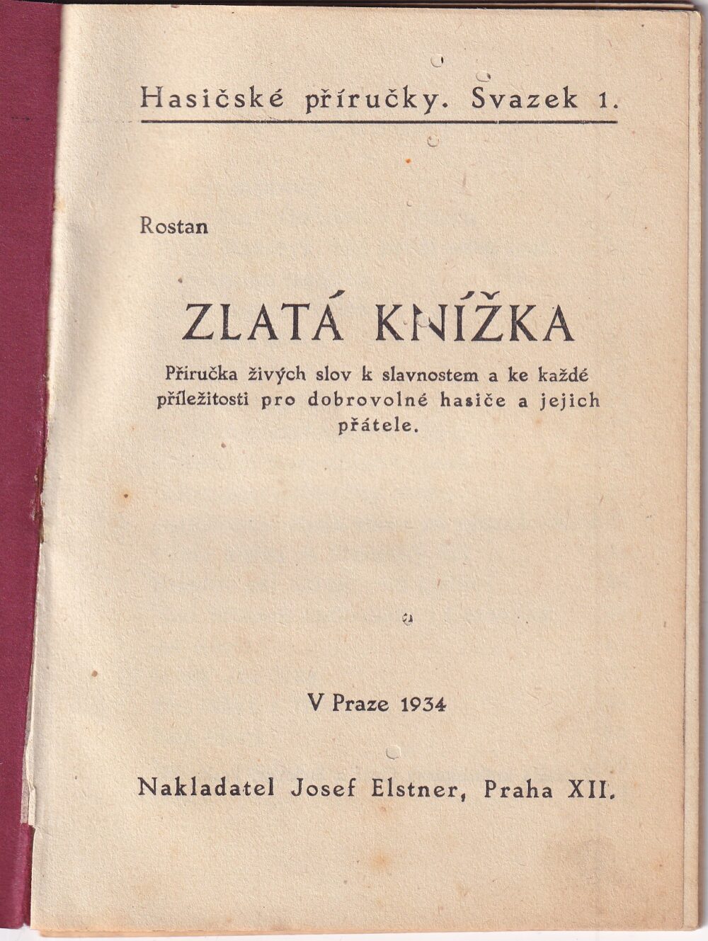 26 (K3-2) Rozměr 10 x 14 cm. Hasičské příručky. Svazek 1. Zlatá knížka – Příručka živých slov k slavnostem a ke každé příležitosti pro dobrovolné hasiče a jejich přátelé. V Praze 1934. Nakladatel Josef Elstner. Z obsahu: Zvony svobody. Provolání Národního výboru. T.G.Masaryk, náš první prezident. U pomníku padlých. Jan Žižka z Trocnova. Bílá Hora. Hesla…ad., uvolněná vazba, počet stran 64.