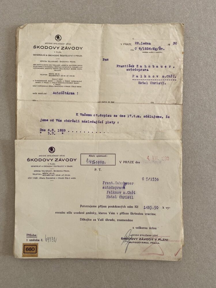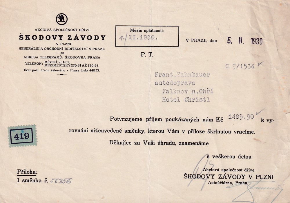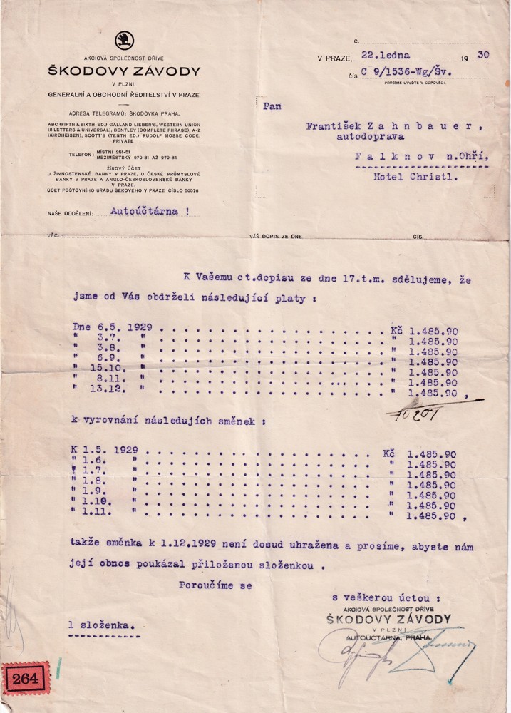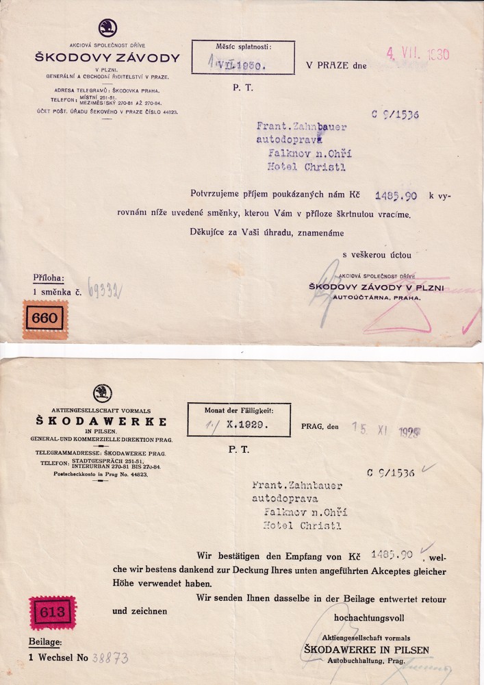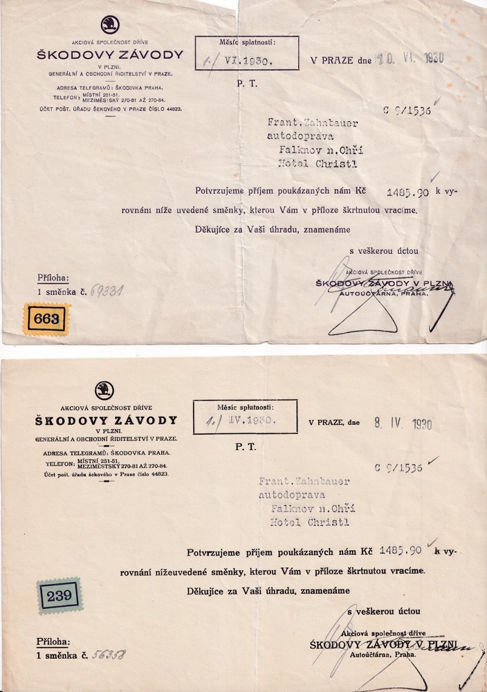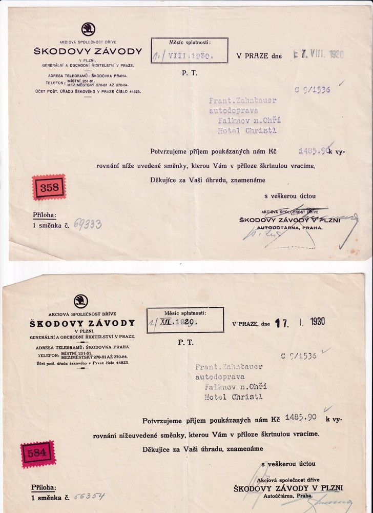 (4) Soubor 18 listin s potvrzením splátek pohledávek 30.léta s dekorativní hlavičkou Škodových závodů, adresován na František Zahnbauer autodoprava Falknov nad Ohří, Hotel Christl.