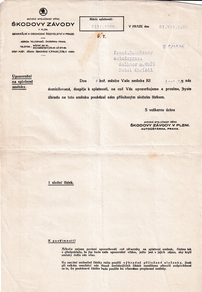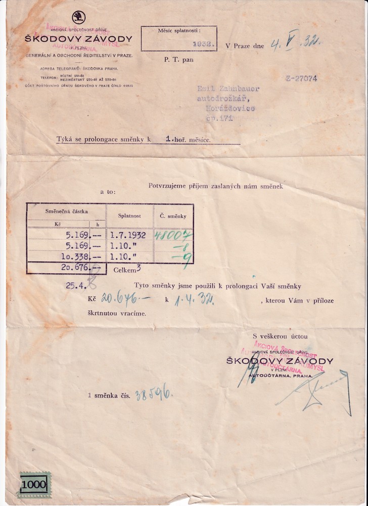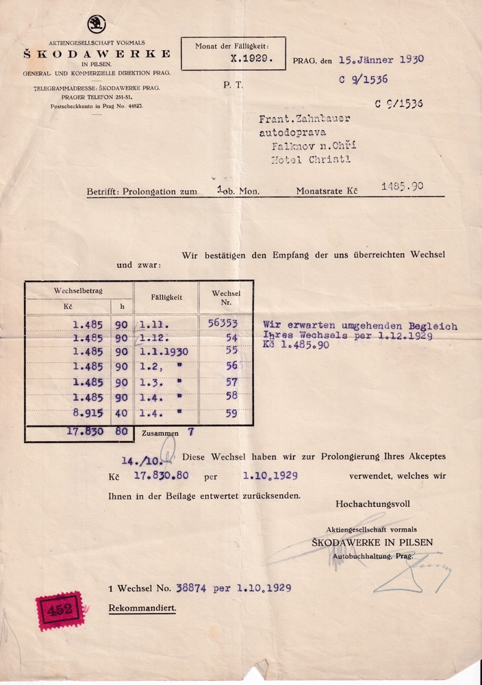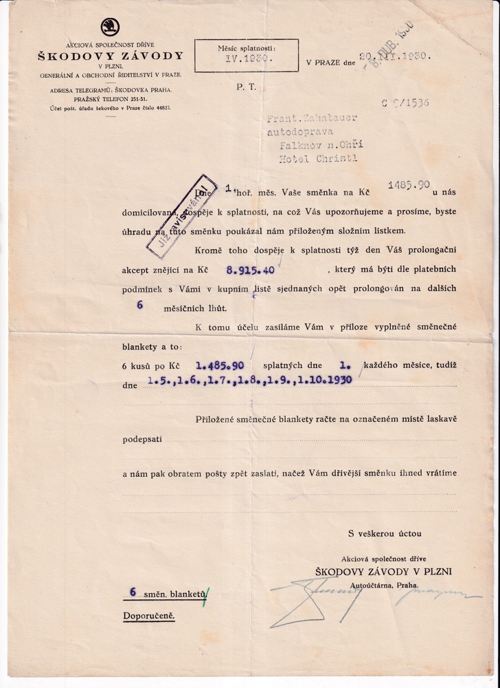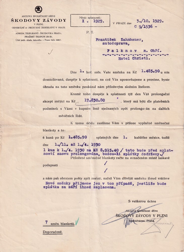 (4) Soubor 18 listin s potvrzením splátek pohledávek 30.léta s dekorativní hlavičkou Škodových závodů, adresován na František Zahnbauer autodoprava Falknov nad Ohří, Hotel Christl.