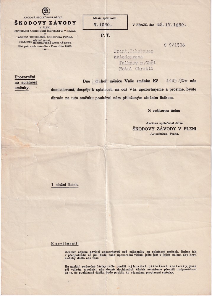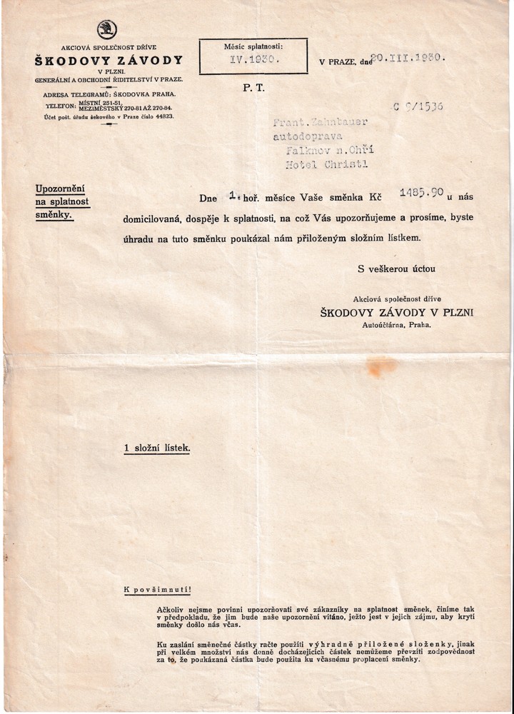 Hlavičkové účty, Škodovy závody, r.1930 Falknov n.Ohří, hotel Christl - Obrázek 7