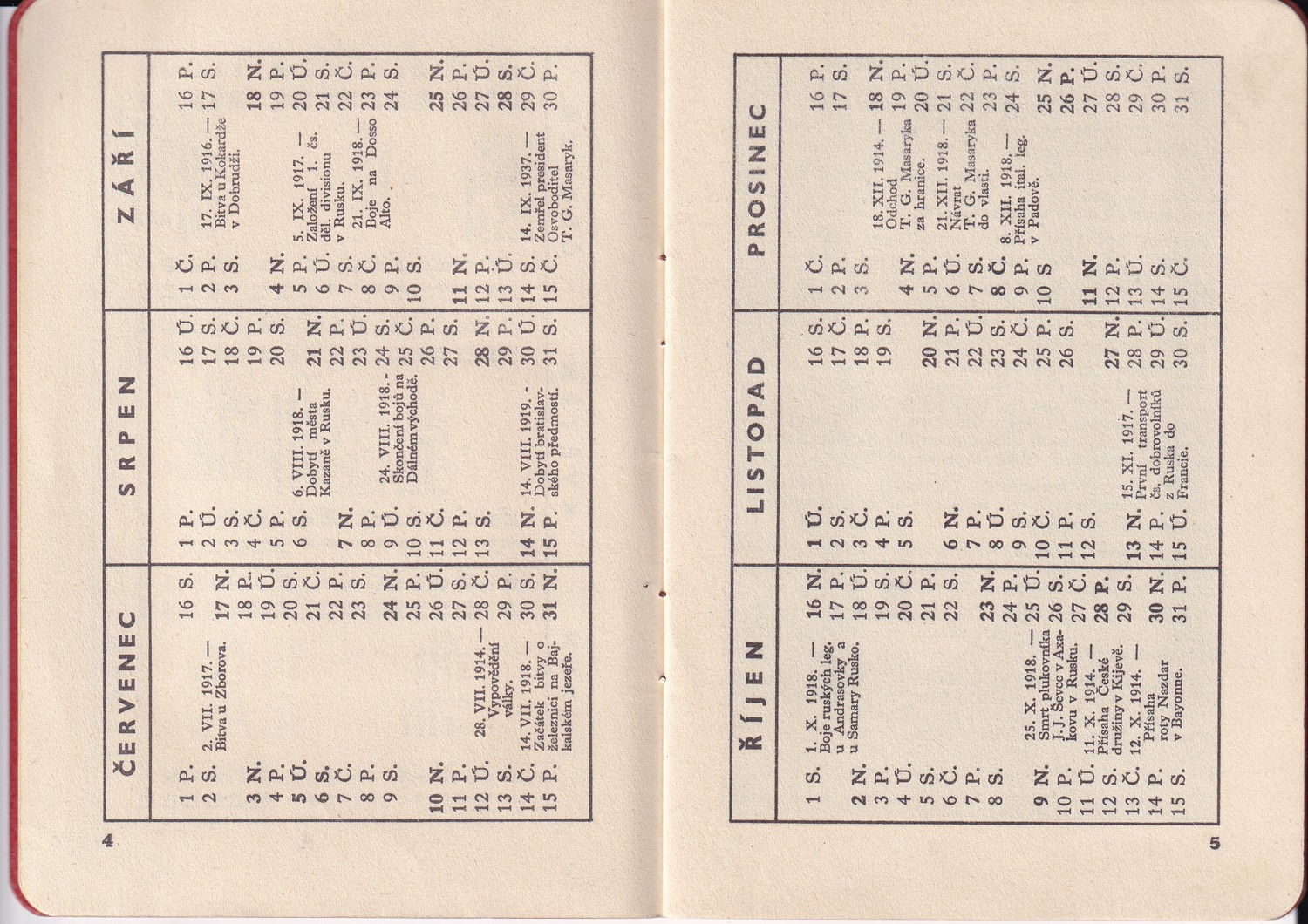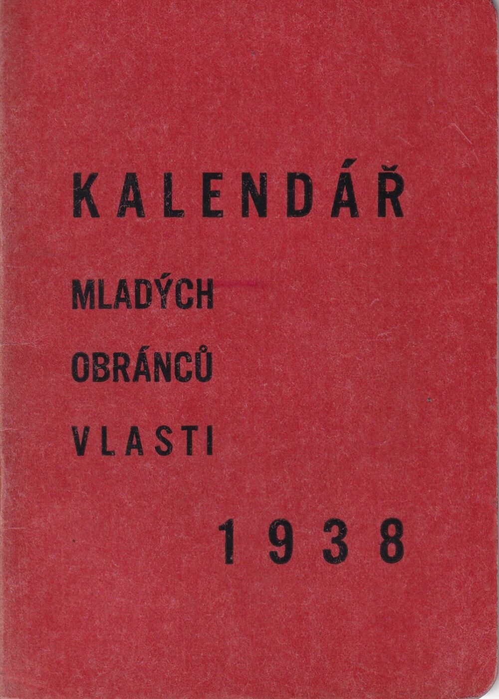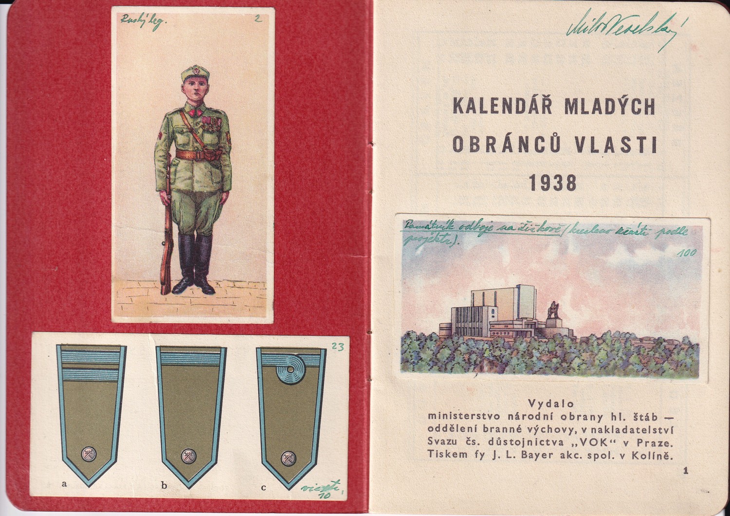 (hhj 66) Rozměr: 11 x 15 cm. Kalendář mladých obránců vlasti, 1938. Kalendář není kompletní, chybí strana 9 – 24. Počet stránek od 1 – 8 a 25 – 32 + mapka – Republika Československá. Mapa hor a řek. Dolepeny kartičky 9 ks – hodnosti, výložky, odznaky, Ruský legionář, památník odboje na Žižkově a jiné. Vydalo ministerstvo obrany hl. štáb – oddělení branné výchovy, v nakladatelství Svazu čs. důstojnictva „V O K“ v Praze. Tiskem fy Bayer v Kolíně.